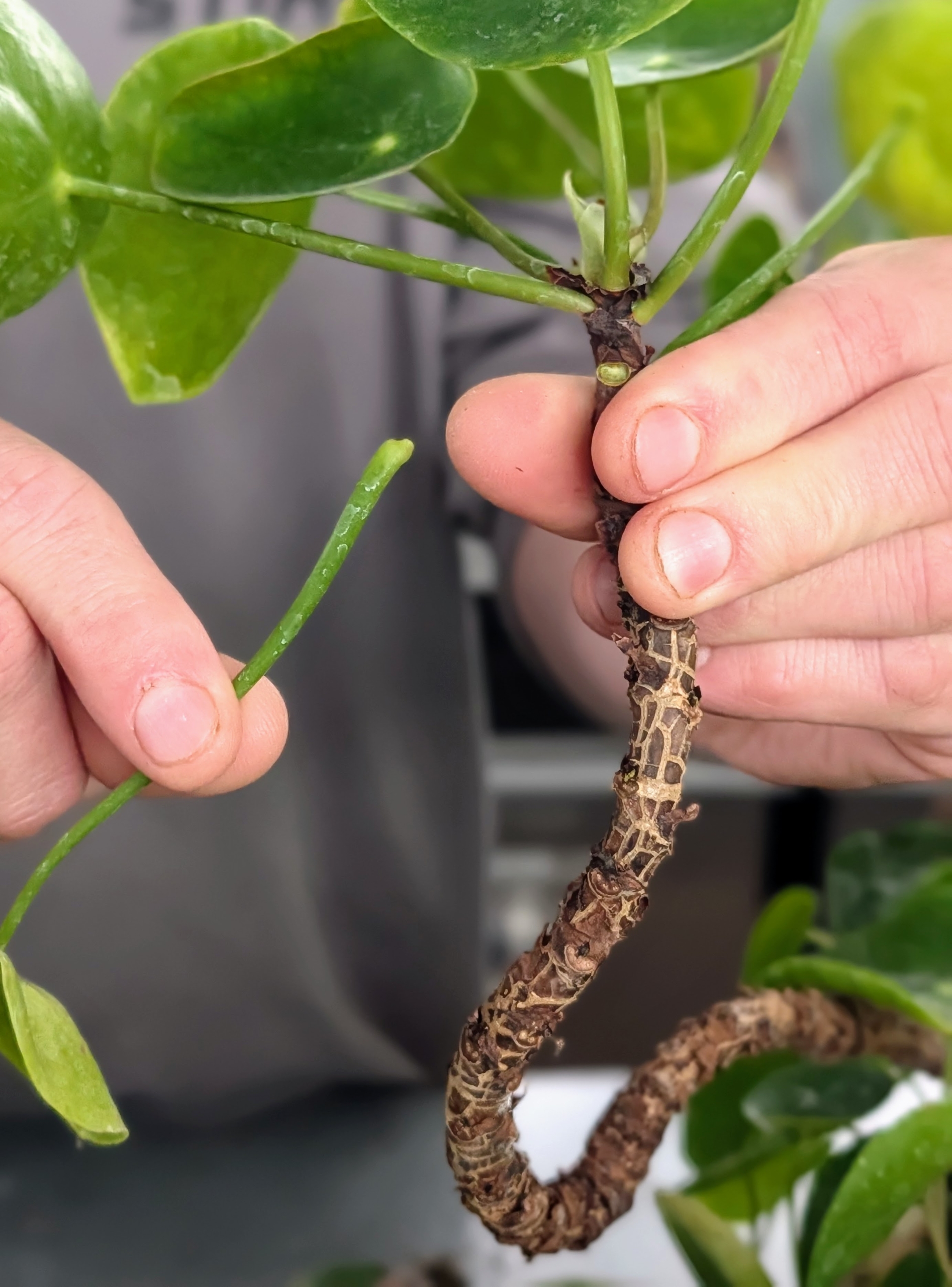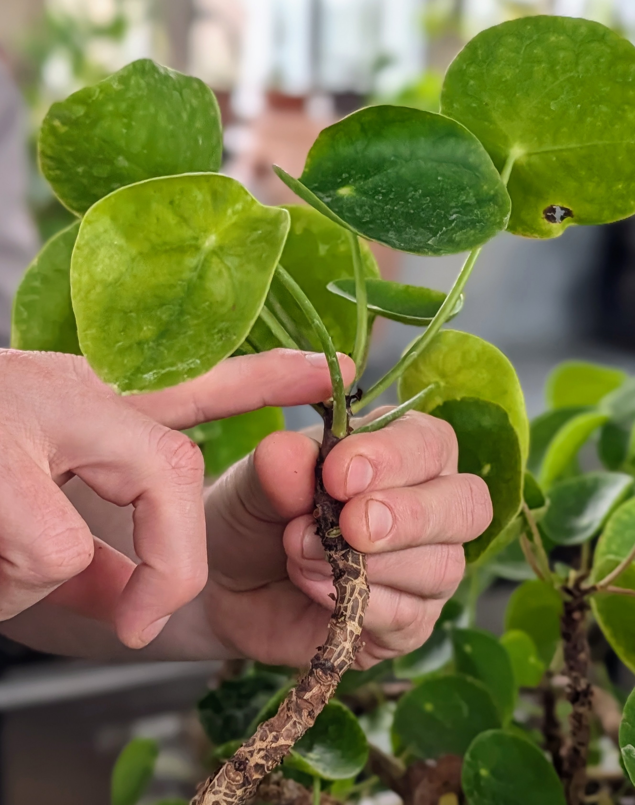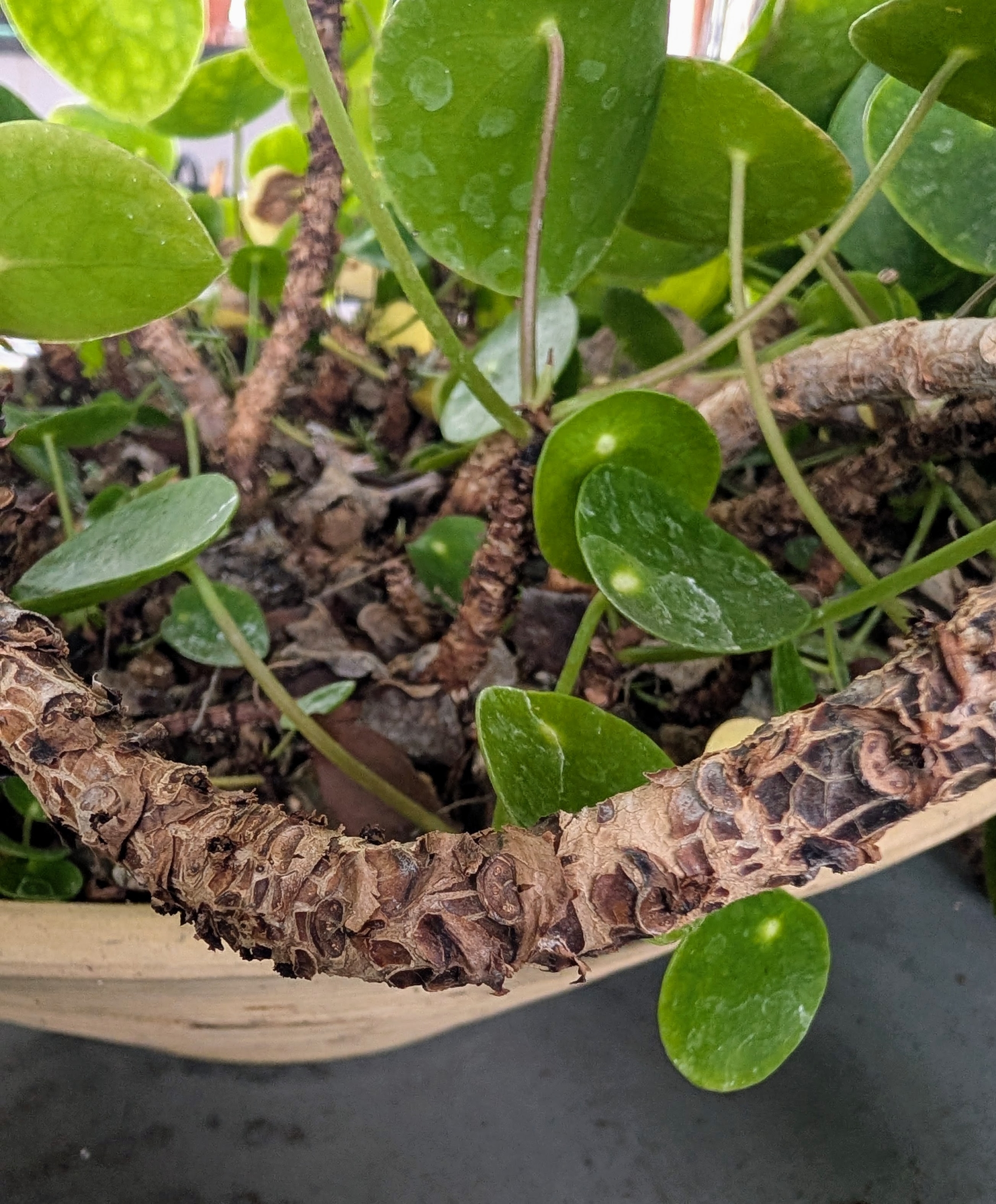 The main woody stems of Pilea peperomioides are thick with an upright growth habit. They show nodes where leaves, buds, and branches emerge, and internodes which are the spaces between these nodes.