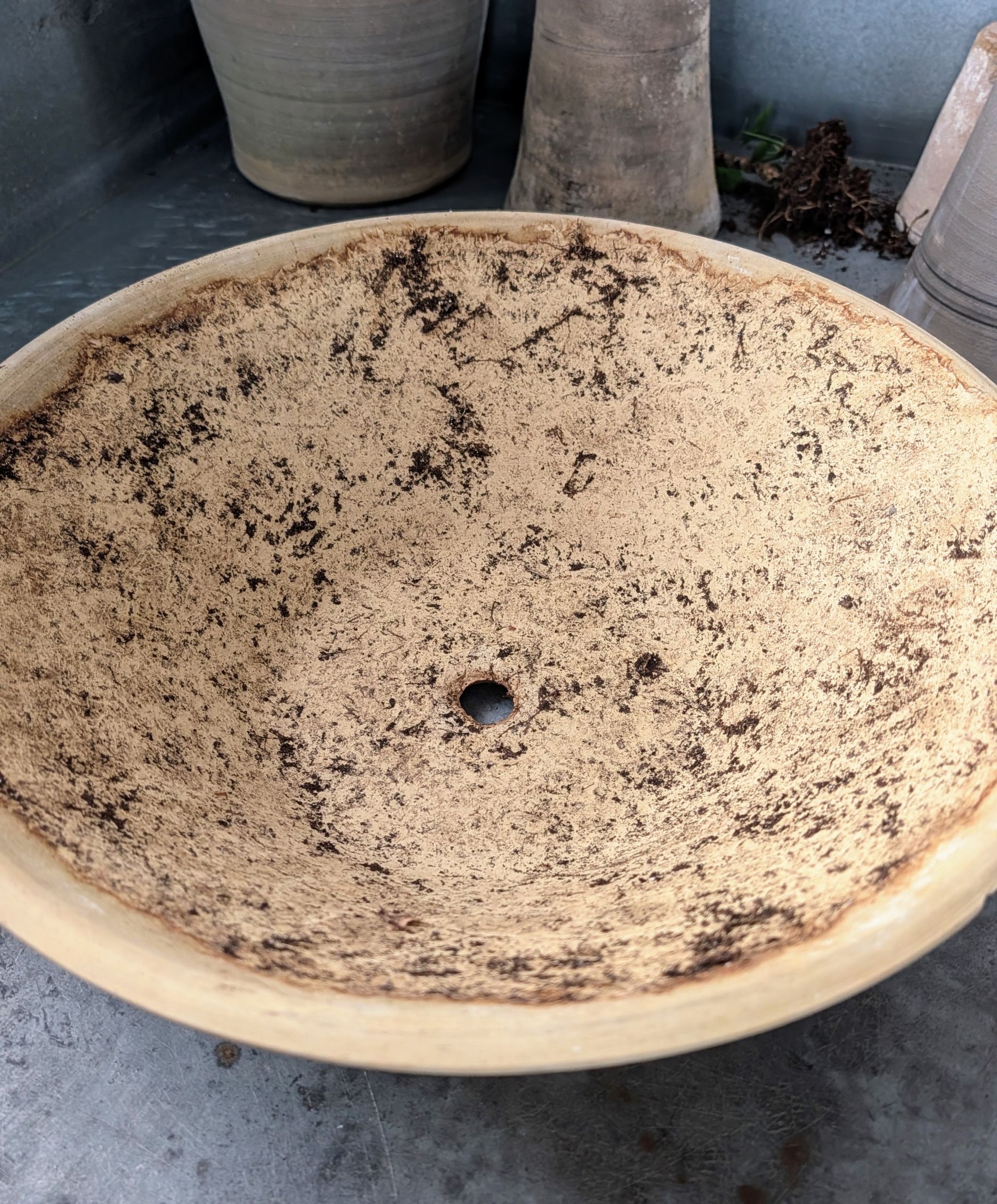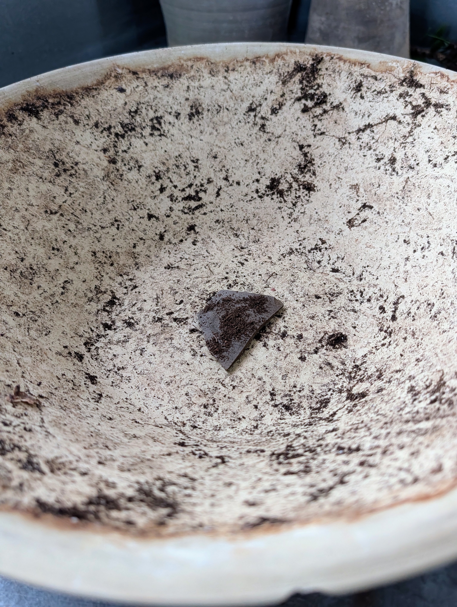 Ryan places a clay shard over the drainage hole in the bottom of the pot to help with drainage and to prevent any soil from falling out.