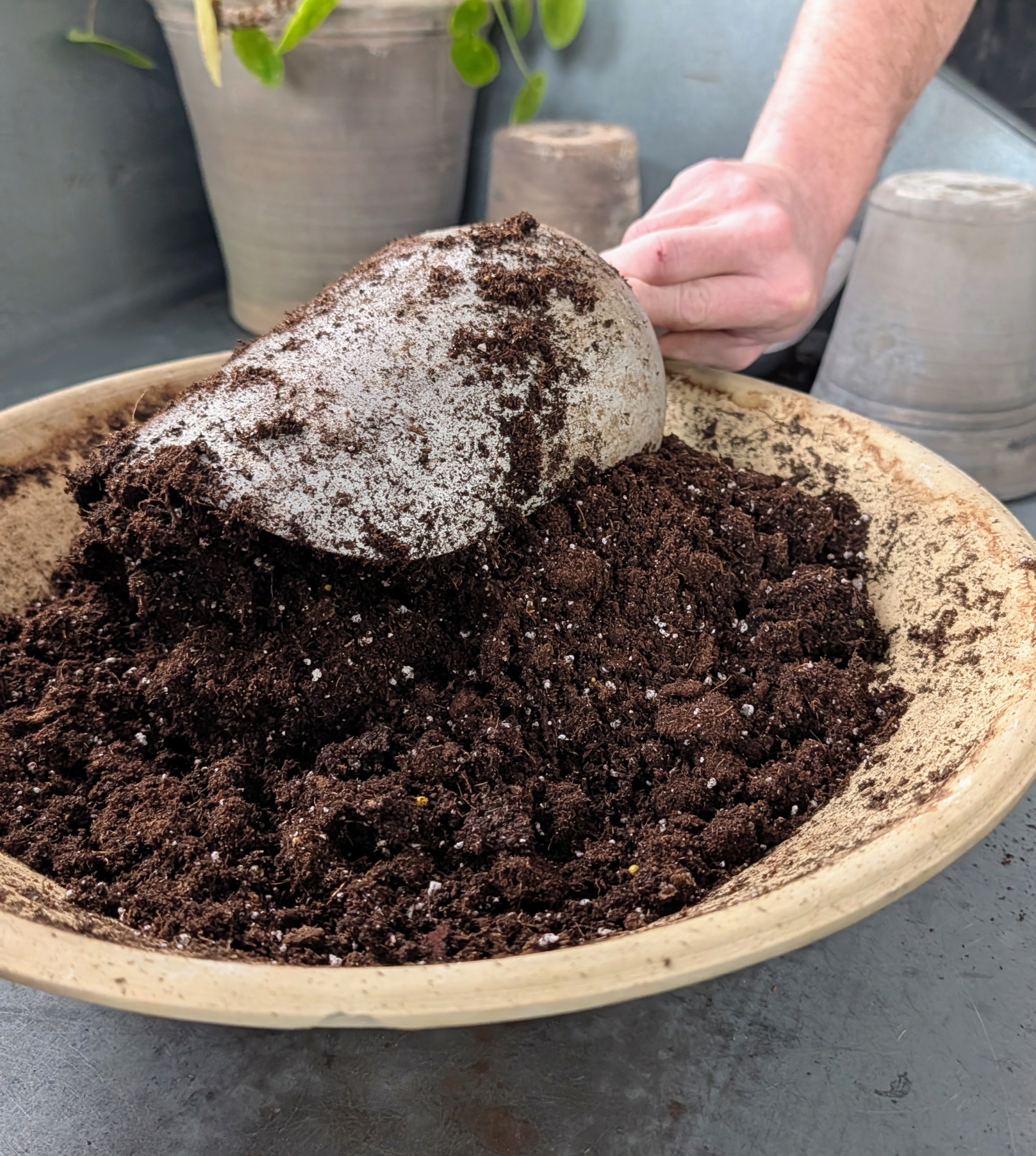 For repotting, Ryan uses Miracle-Gro Tropical Potting Mix. It is packed with nutrients that feed for up to six months and includes lava rock for added drainage that tropical plants and the Pilea peperomioides need. He wets it down first so it is more supportive for the plants.