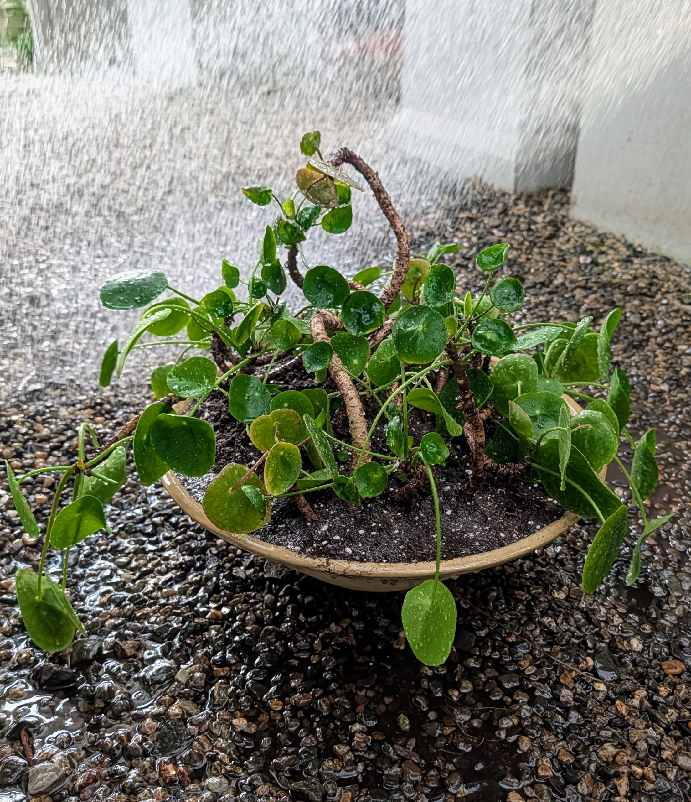 Finally, Ryan brings the plant into the greenhouse for a good drink of water. Allow money plants to almost dry out between waterings and then water well. The leaves will droop slightly when dry. Newly repotted, this plant will continue to flourish.