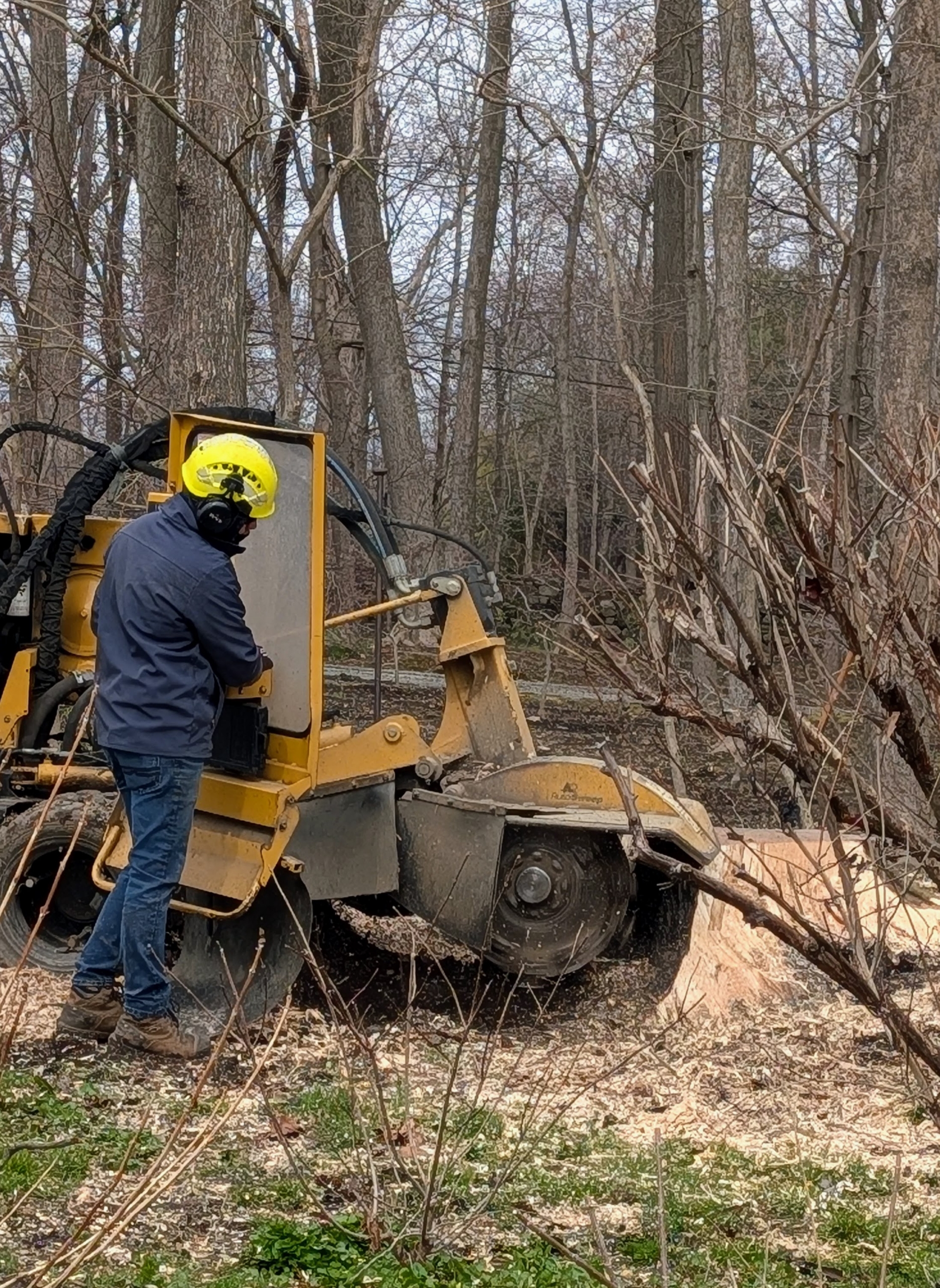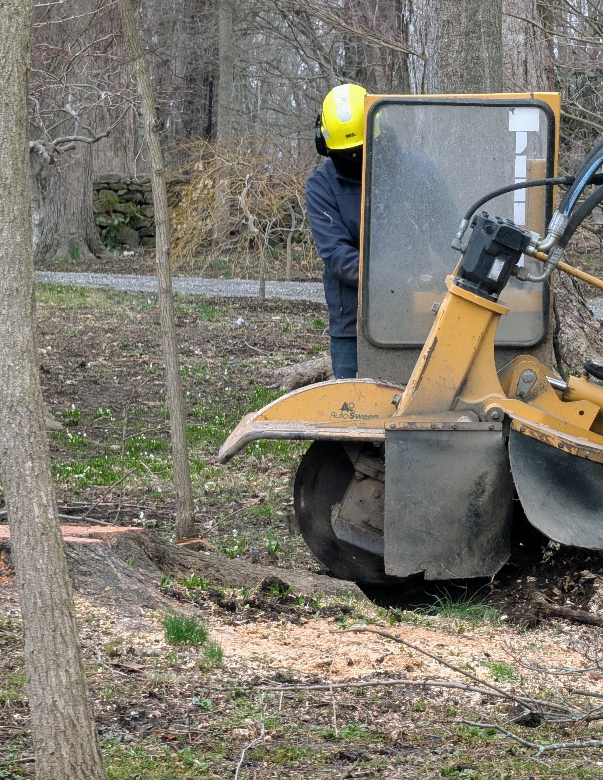 And then he maneuvers the machine right up to the stump and begins grinding.
