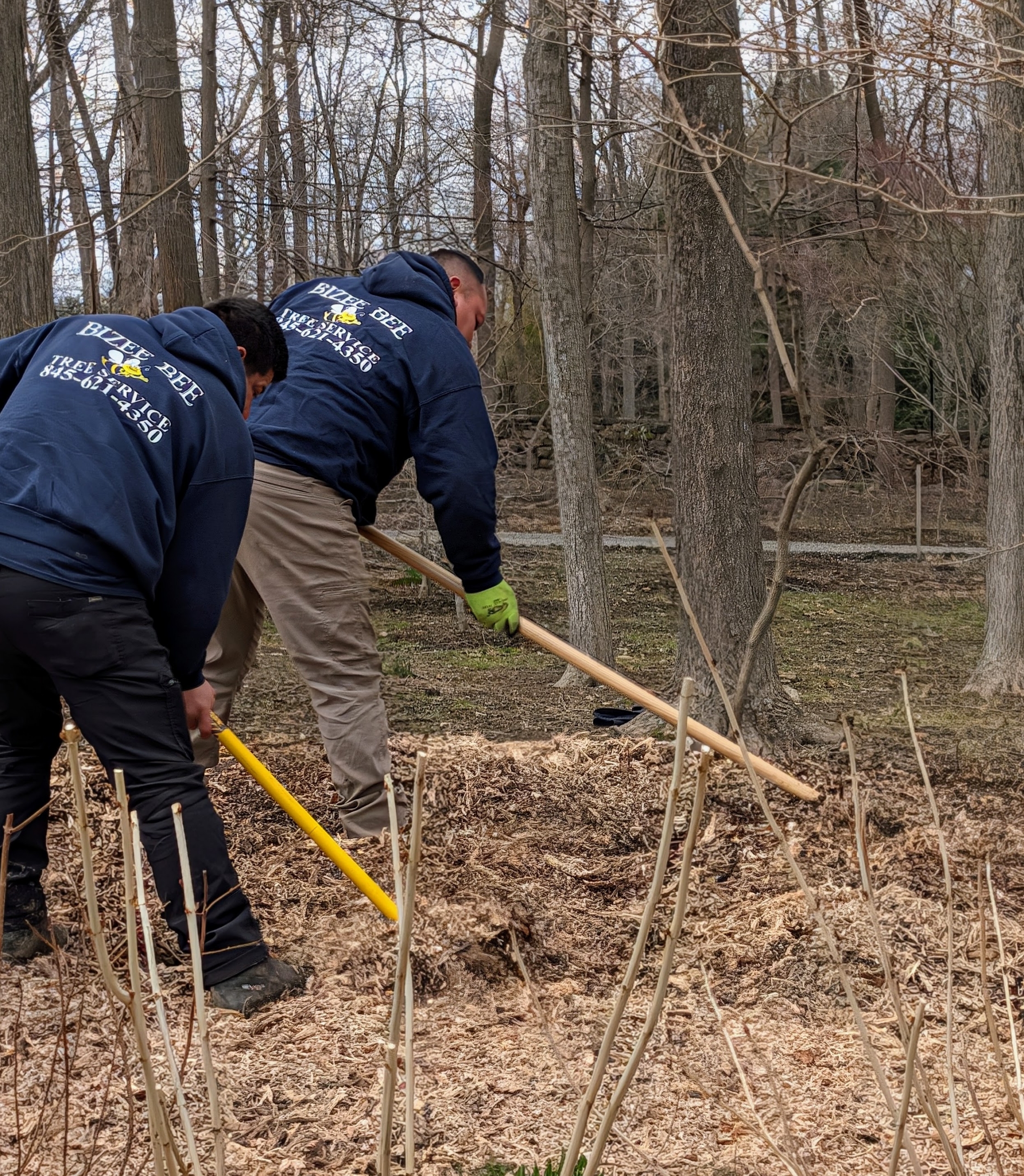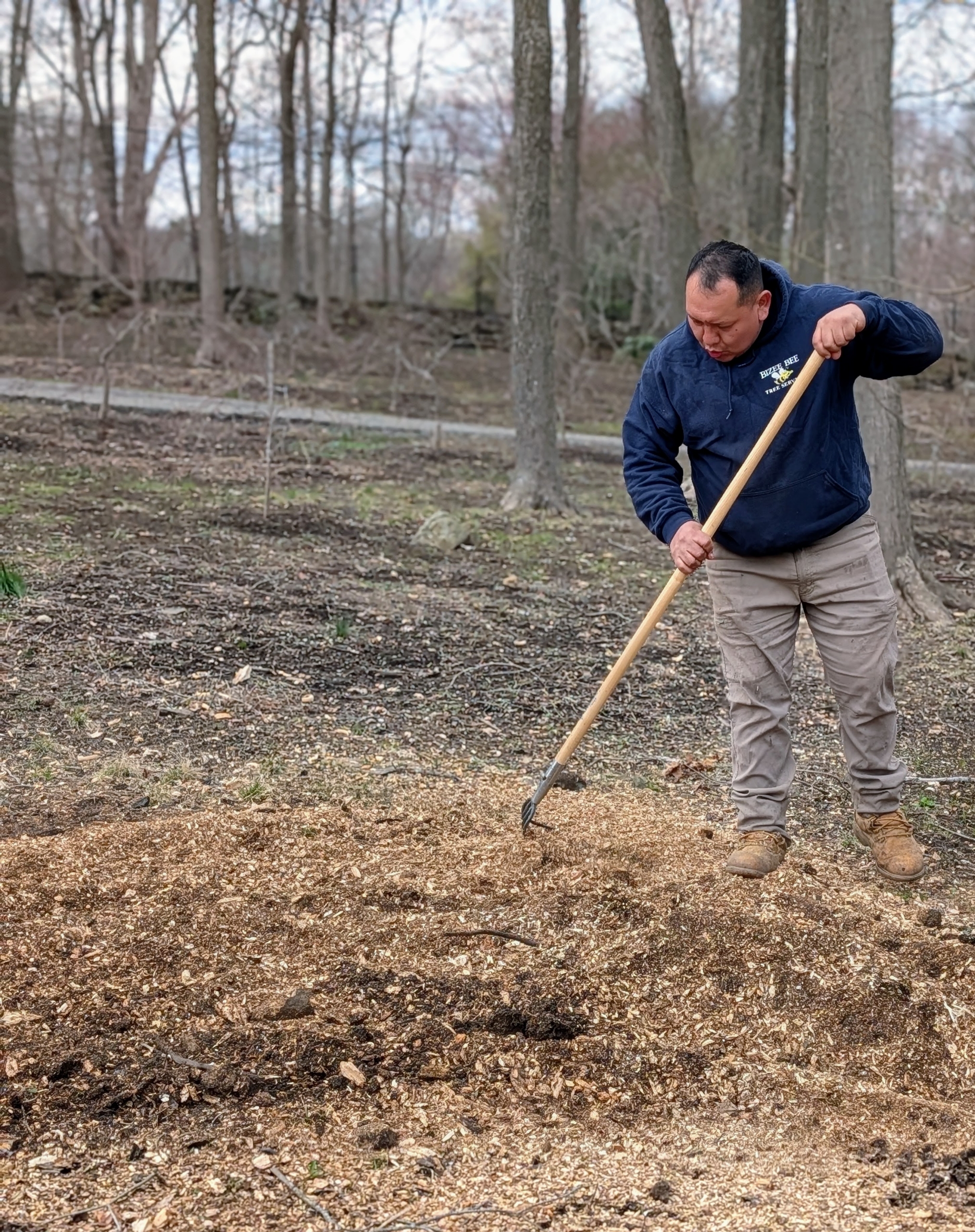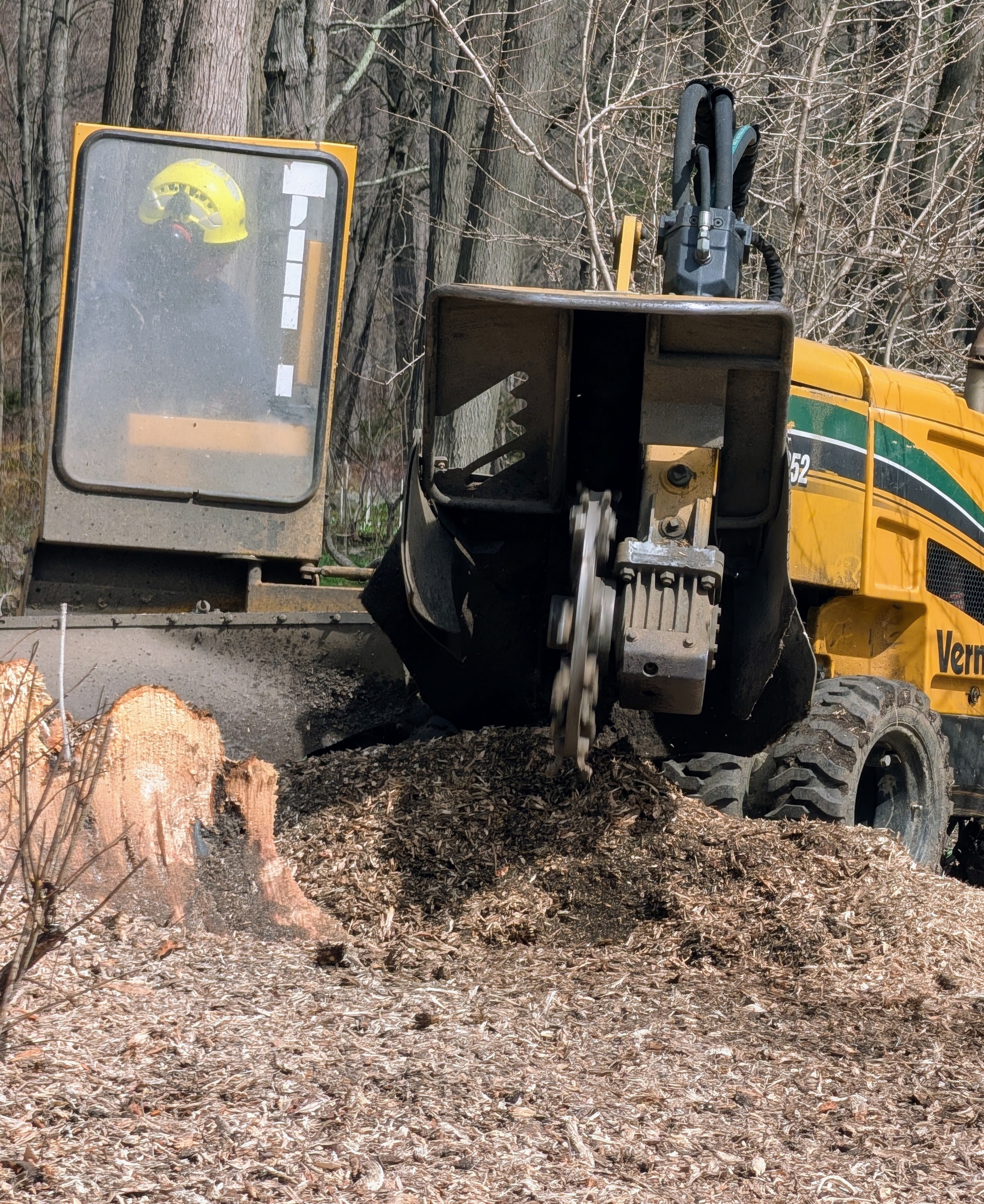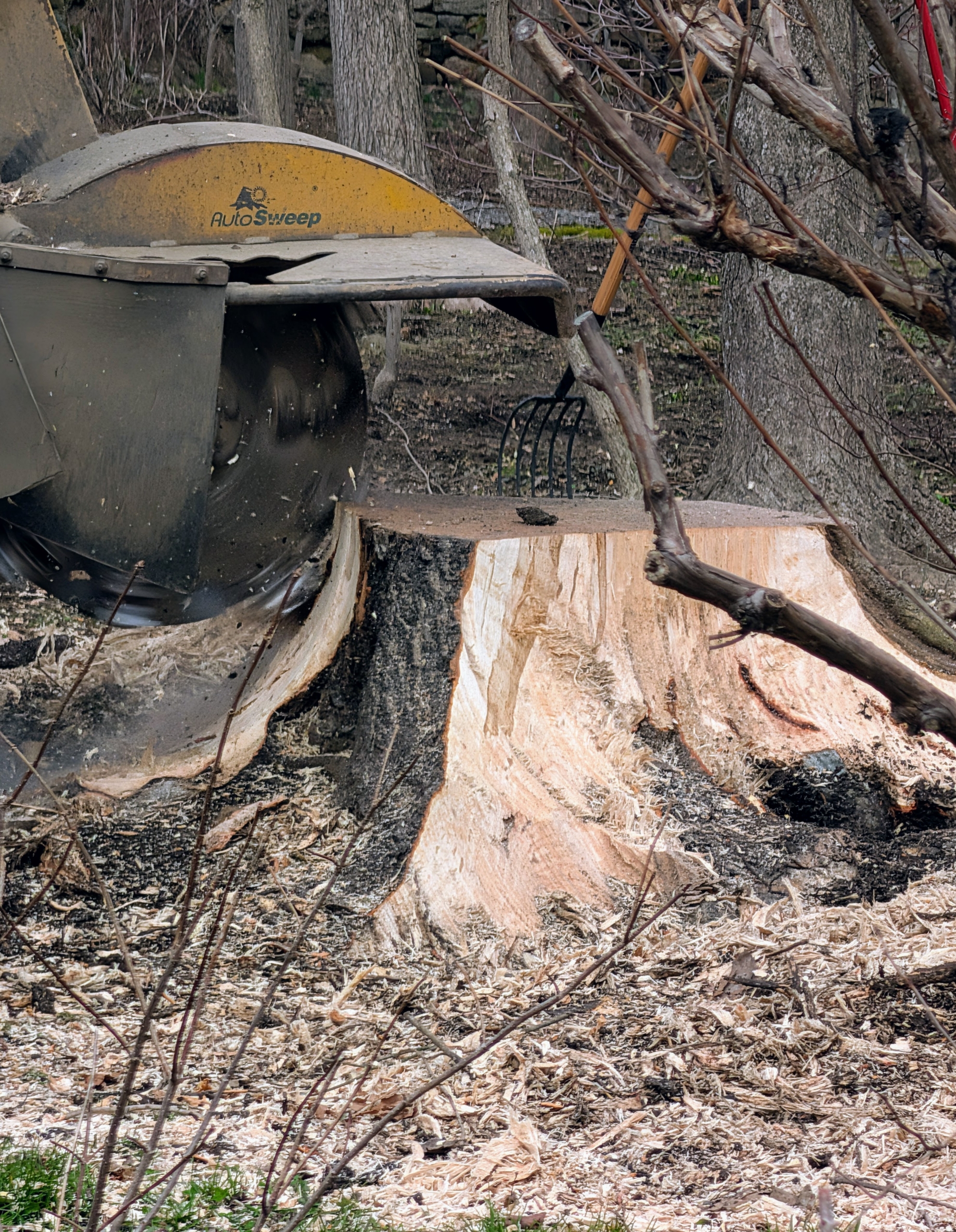 Once a stump is done, the crew spreads and levels the wood chips.