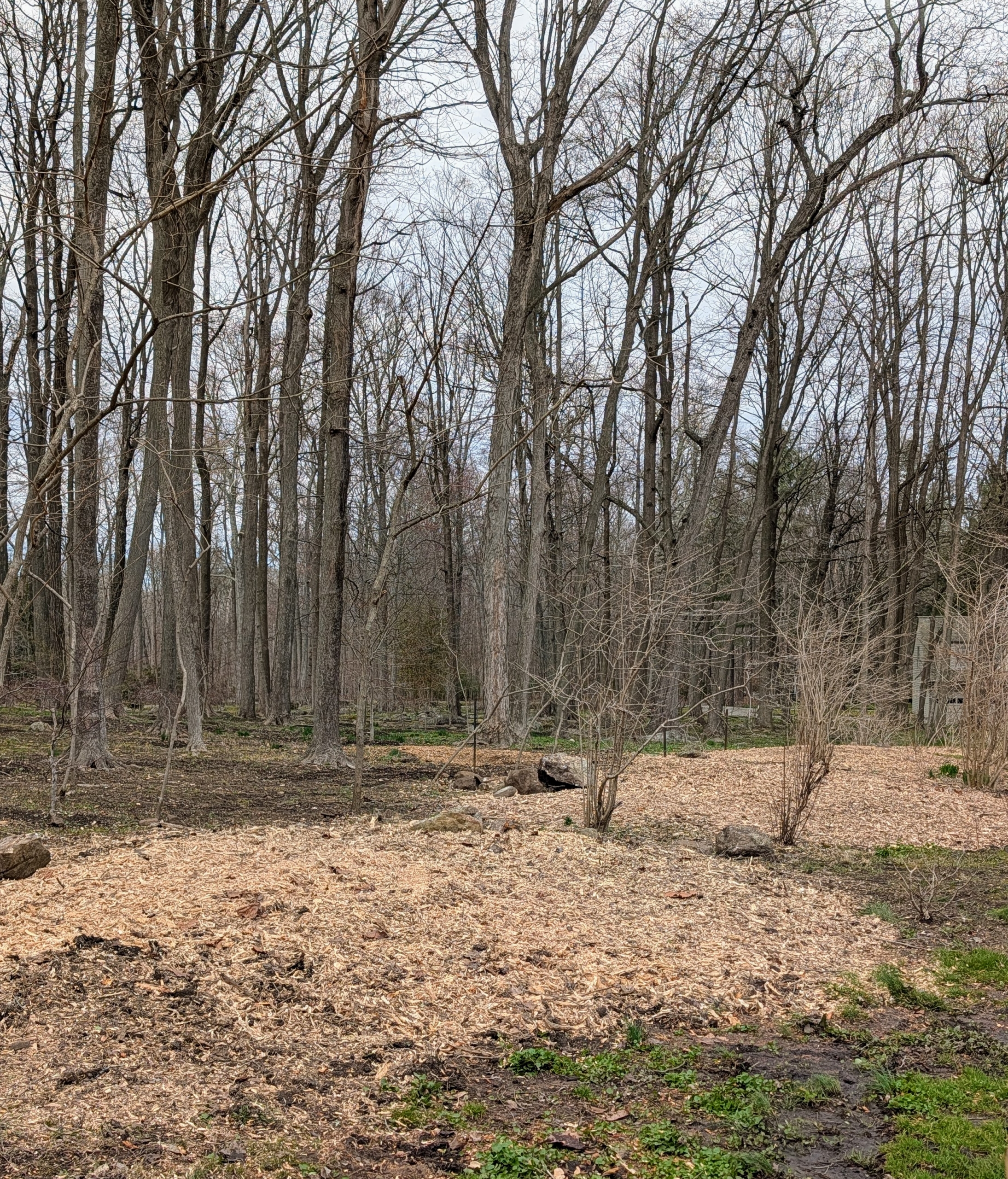 This space at the edge of my Japanese Maple Woodland and near my hoop houses is now clear, giving more light and air to the plants and smaller trees nearby.