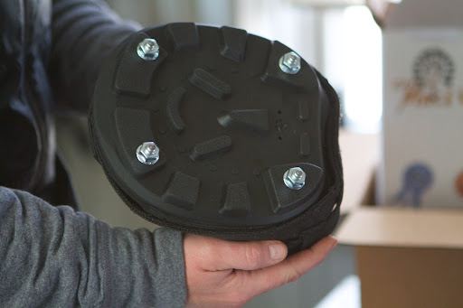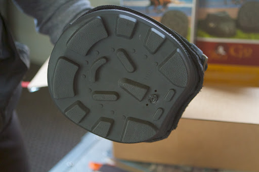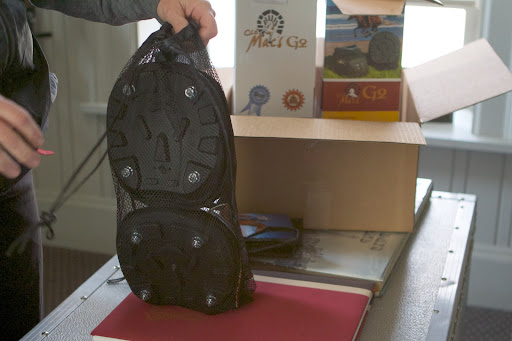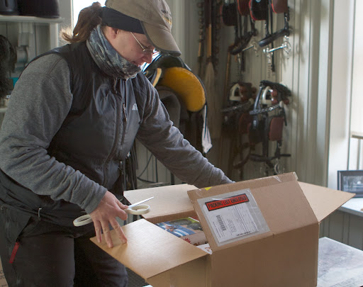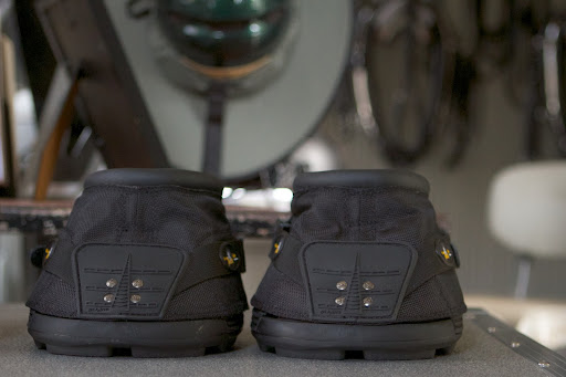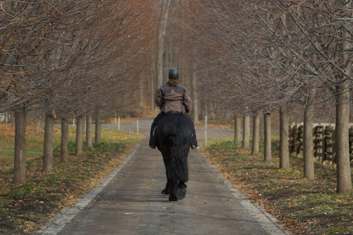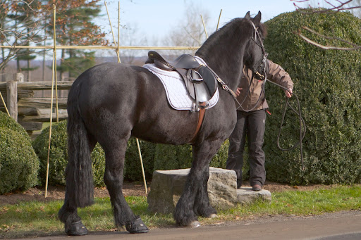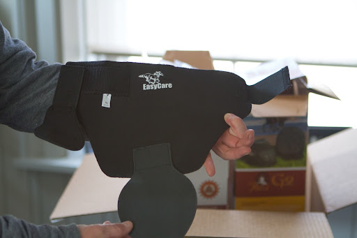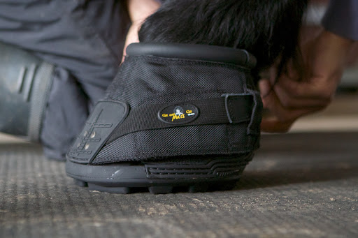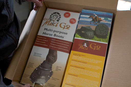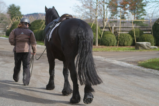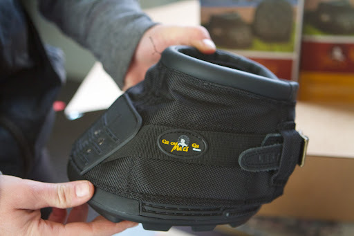 There is a lot of controversy about whether to shoe a horse or not, as many of you have commented on this blog. Betsy Perreten, my stable manager, and I feel that shoes are appropriate for my Friesians because of the type of riding we do, mostly on dirt roads and trails through the woods. We also employ a knowledgeable and capable farrier, Linda Friedman, who takes great care of the horses’ hooves and fits and changes their shoes regularly. Meindert, one of my horses, hasn’t worn rear shoes in quite some time. He suffers from arthritis and has difficulty holding his rear legs up for Linda to shoe. Betsy is very in-tune with the horses and can read their moods quite well. When Meindert is feeling fine, she likes to keep him active and will take him out for short, easy rides. Recently, she got him some hoof boots for his rear feet from a company called Easy Care Inc. and from the looks of things, Meindert really loves wearing them.