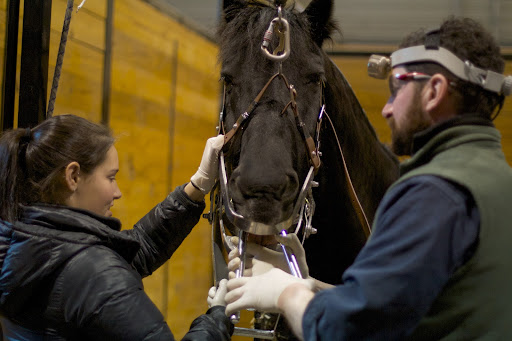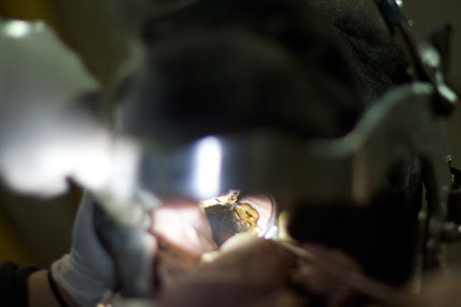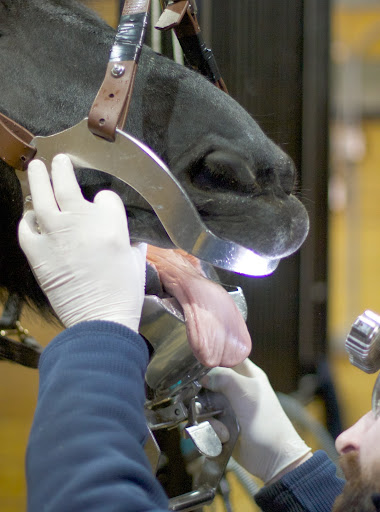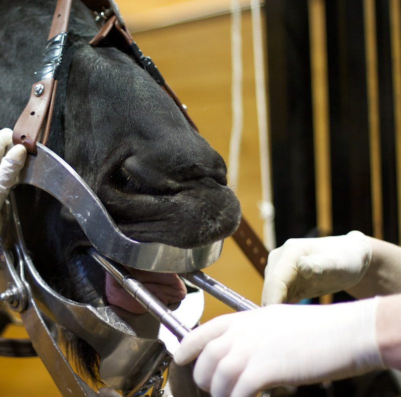 7 PJ began the procedure by fitting a speculum around Rutger's head and mouth to keep the mouth open. The exam was underway.
