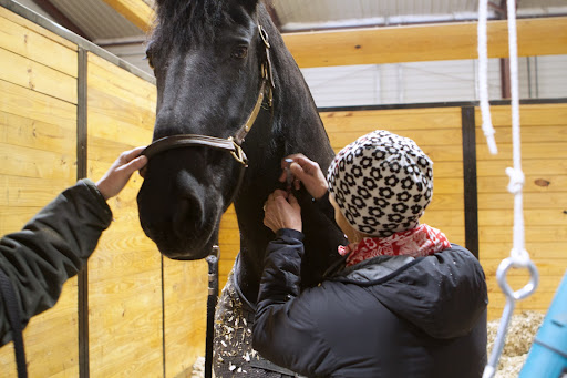 1 Because my horse trailer was buried in snow, we relied on the animal rehab center for transportation. Betsy and Dolma led Rutger and Ramon through the icy snow to the waiting horse trailer.
