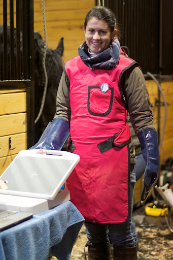 21 Kerri, another vet, helped with the x-ray. She wore a special body smock and gloves to shield herself from harmful rays.