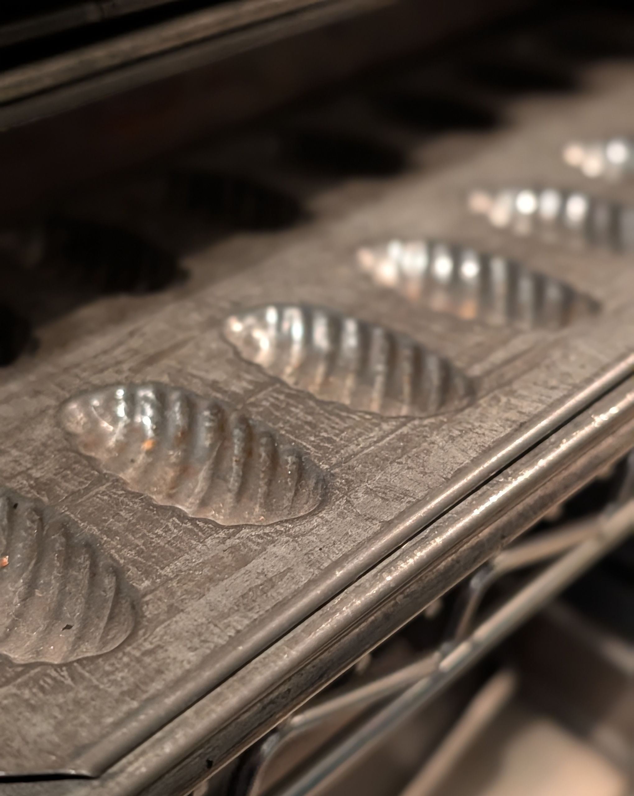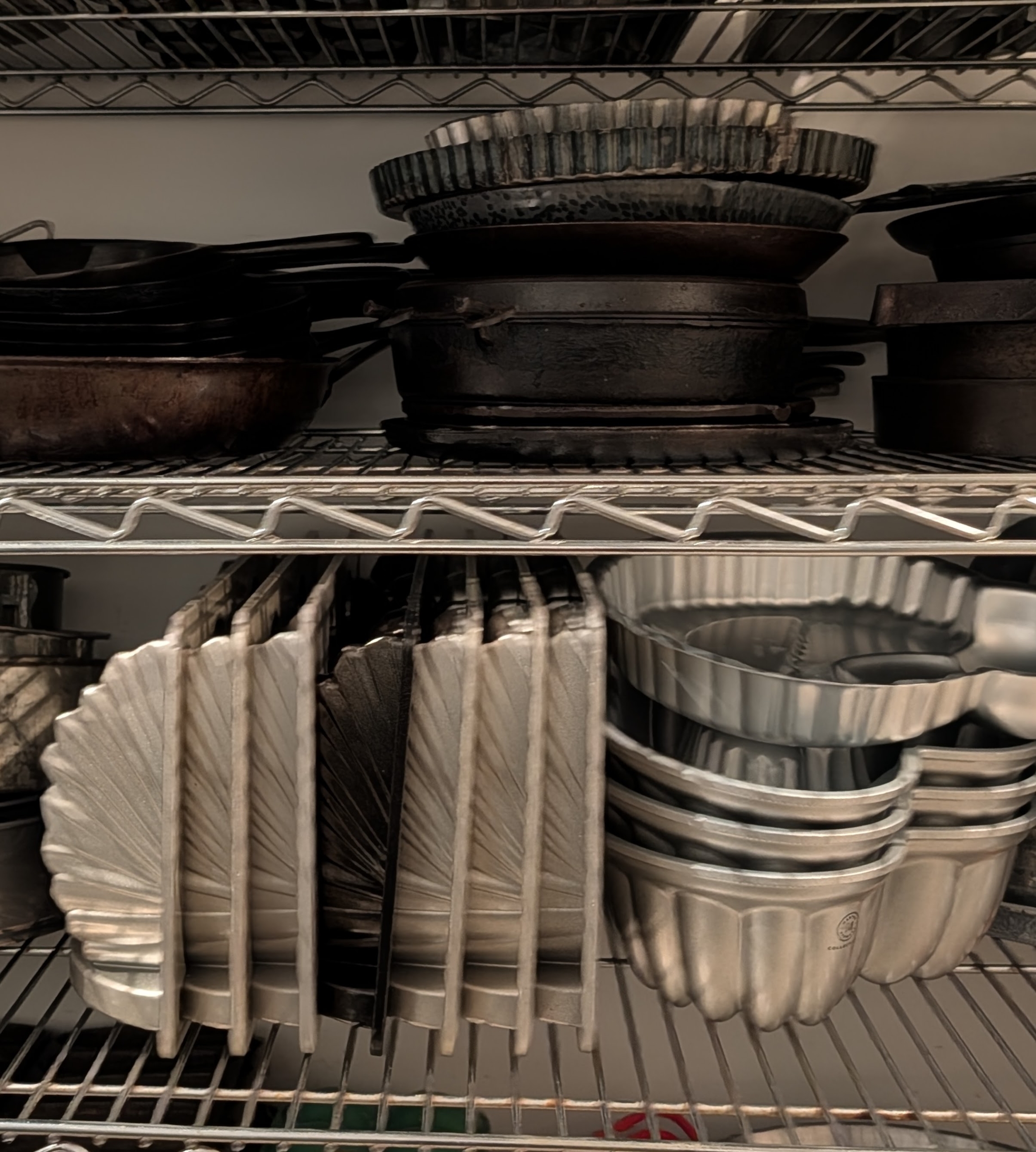 The molds are kept near other tart pans and springform pans where they can be found and accessed easily when needed.