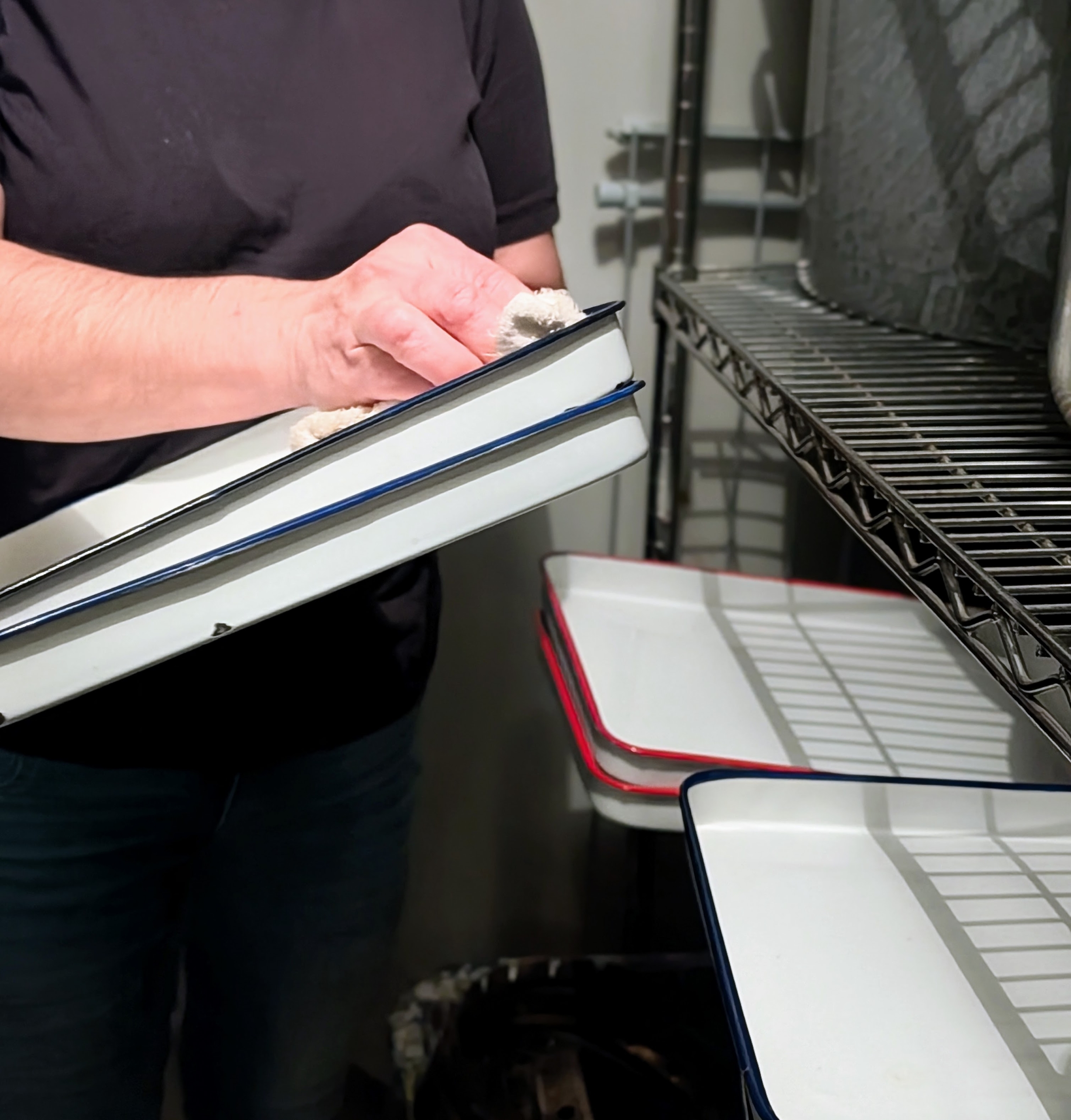 Enma wipes down a collection of enamelware trays. Enamelware includes items covered with a porcelain enamel finish.