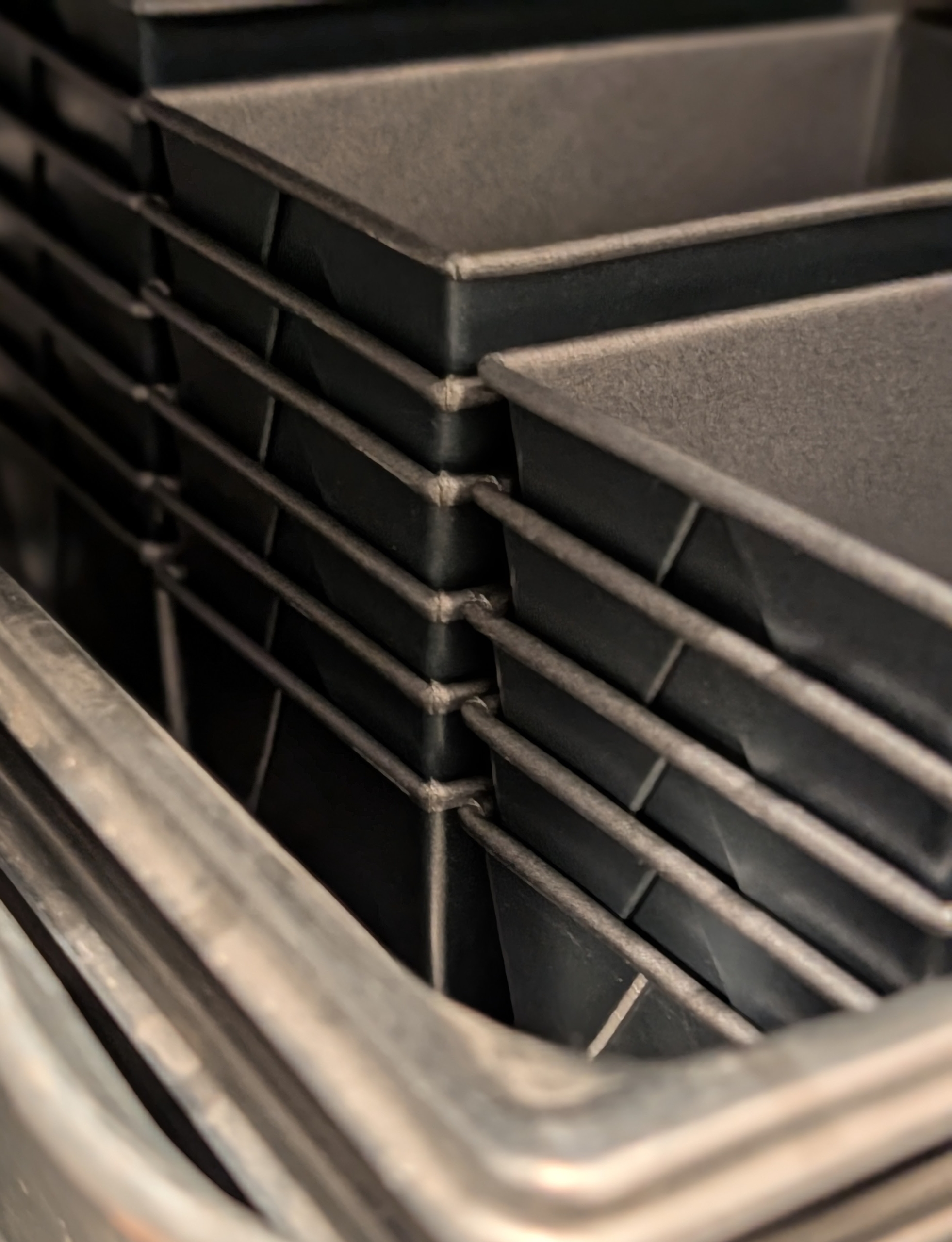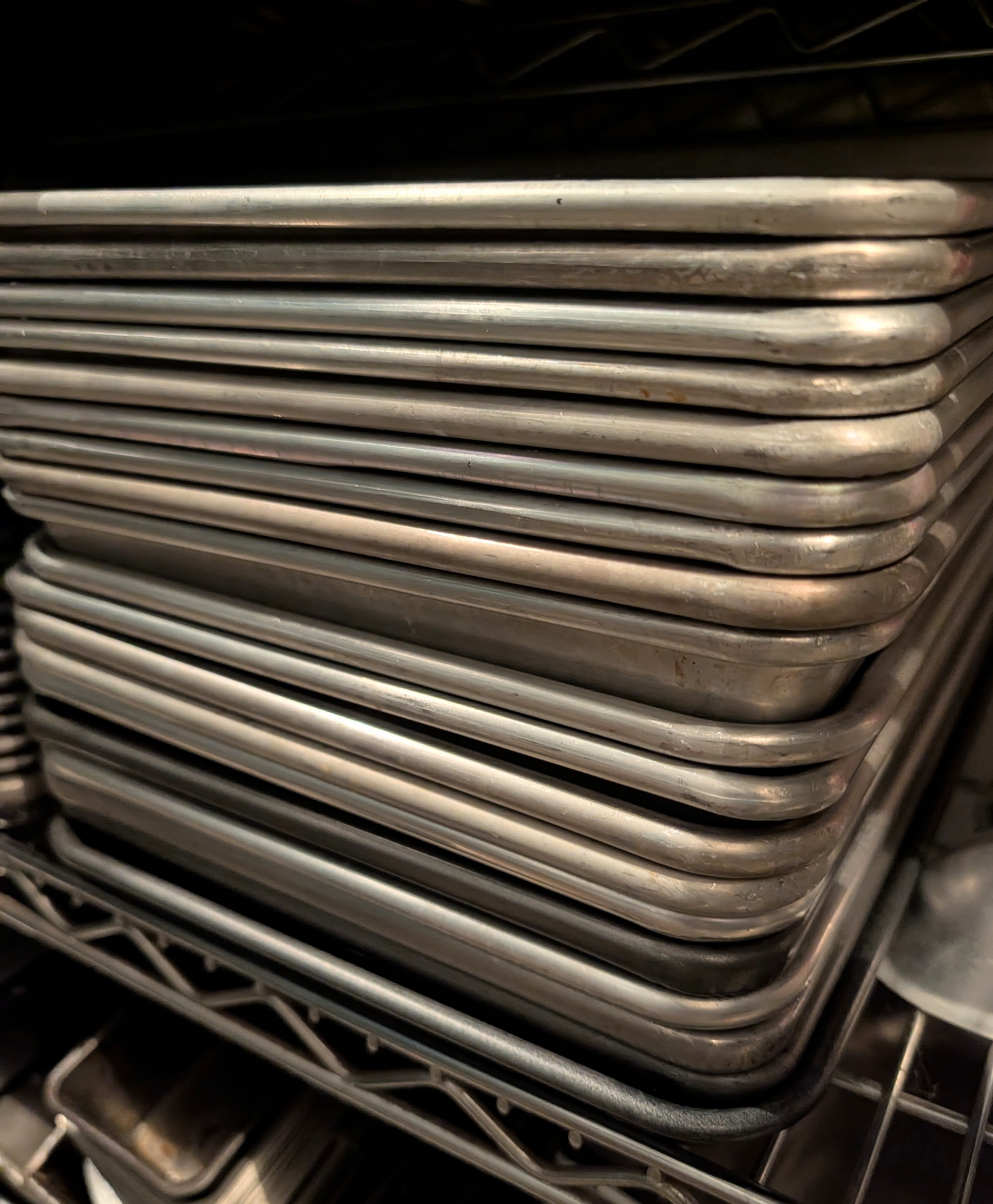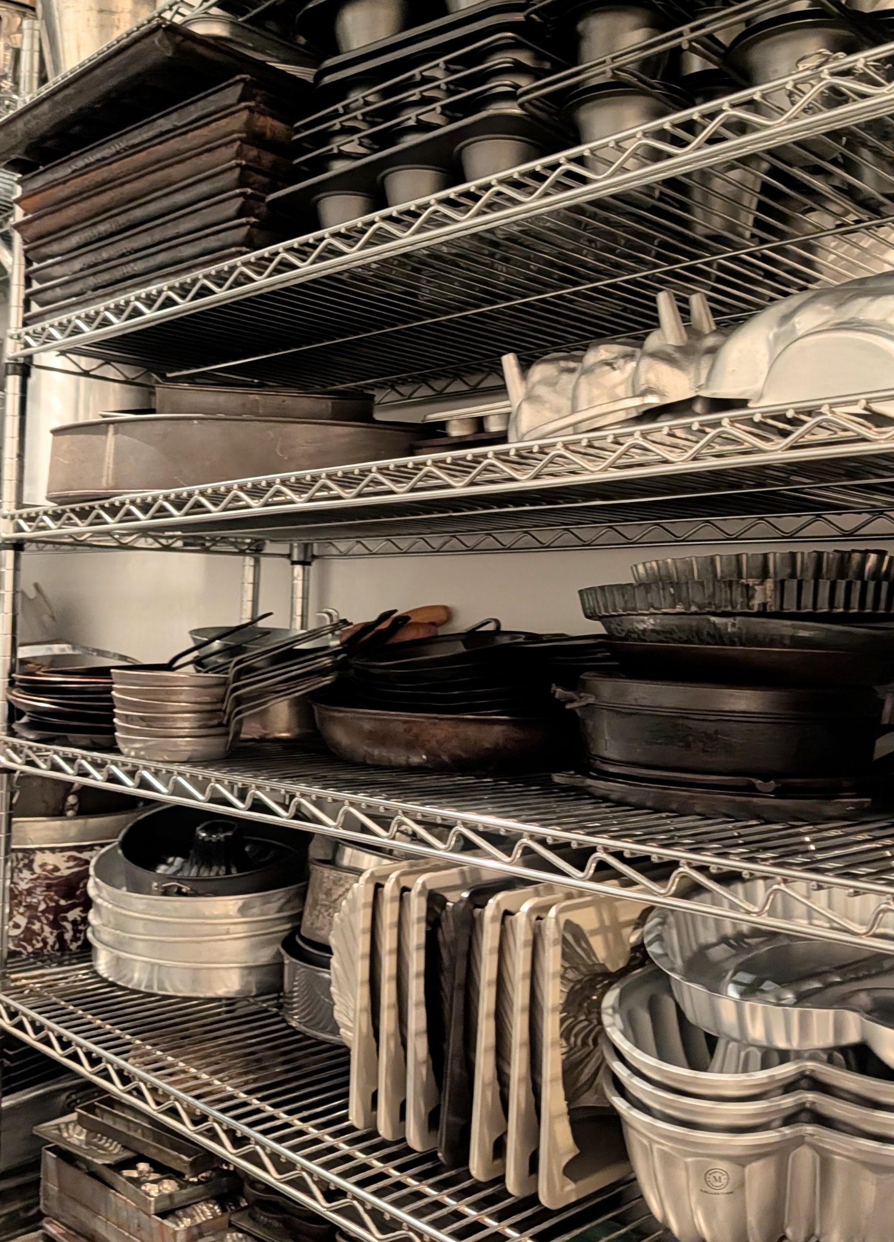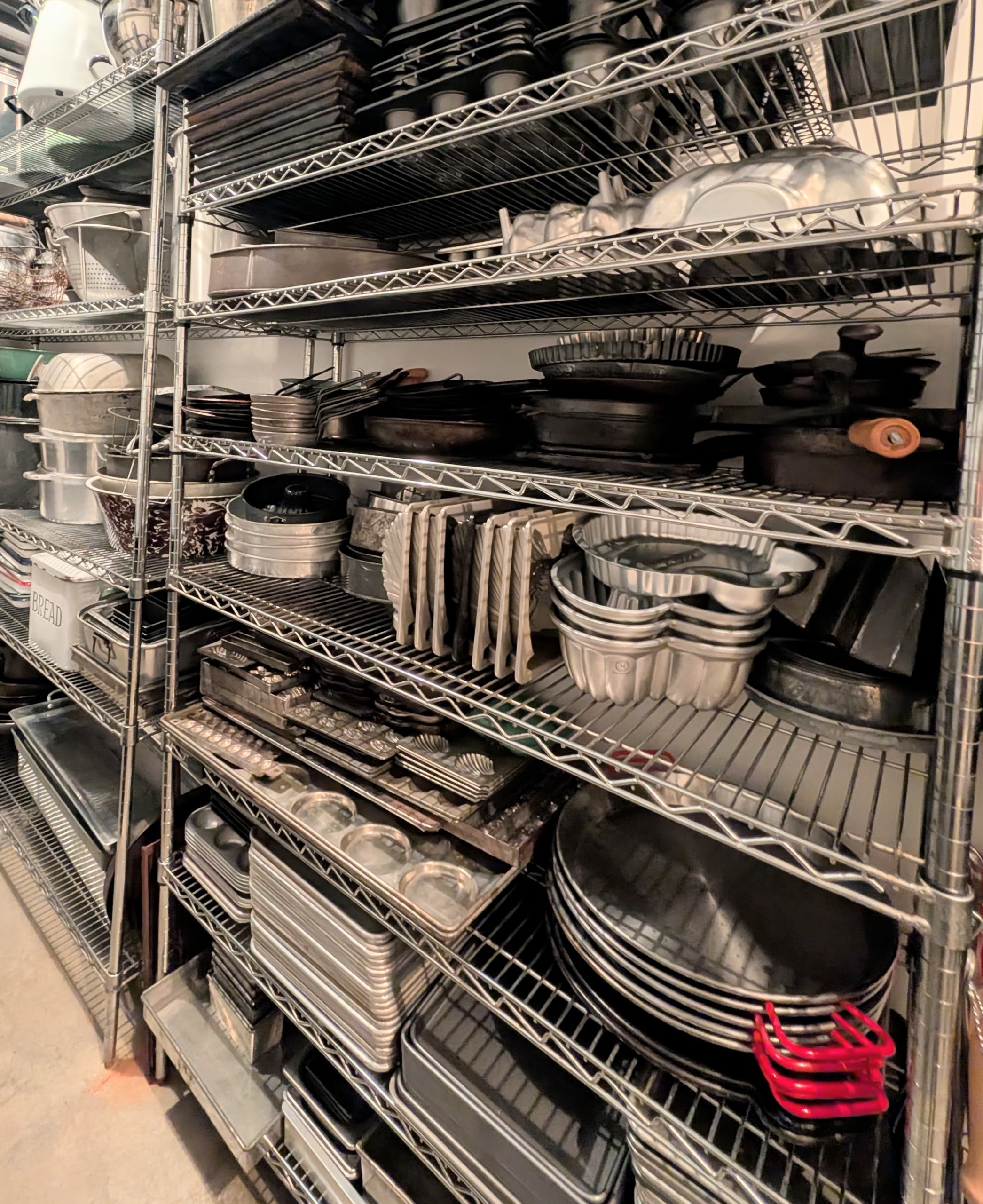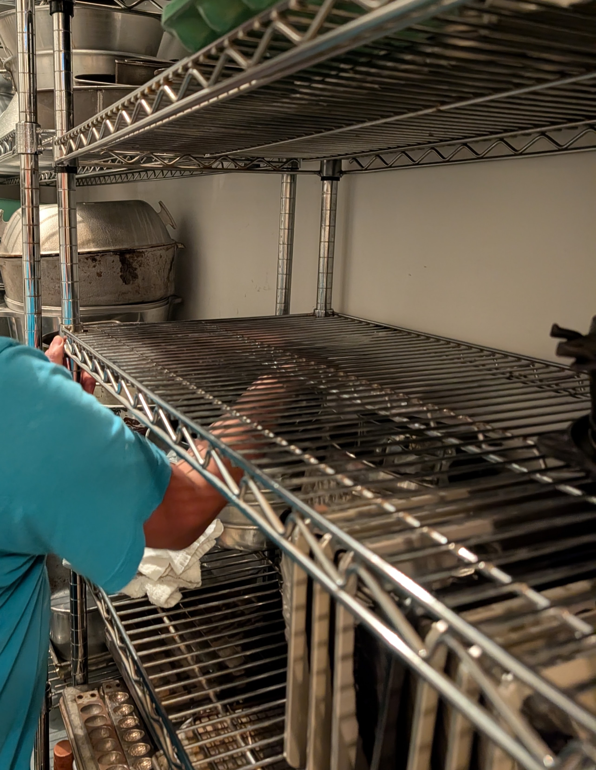Loaf pans are also wiped clean and stacked neatly on a shelf.