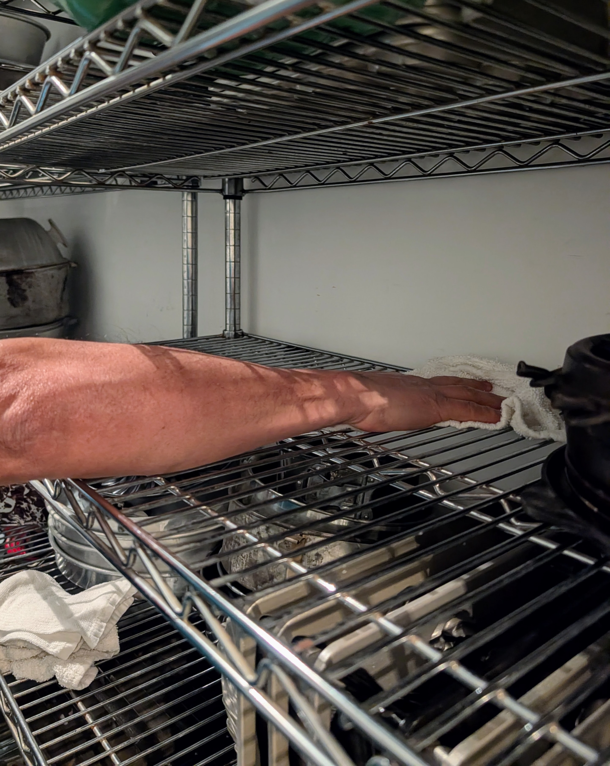 It’s not a large space, so one by one the shelves are emptied and then wiped down thoroughly.