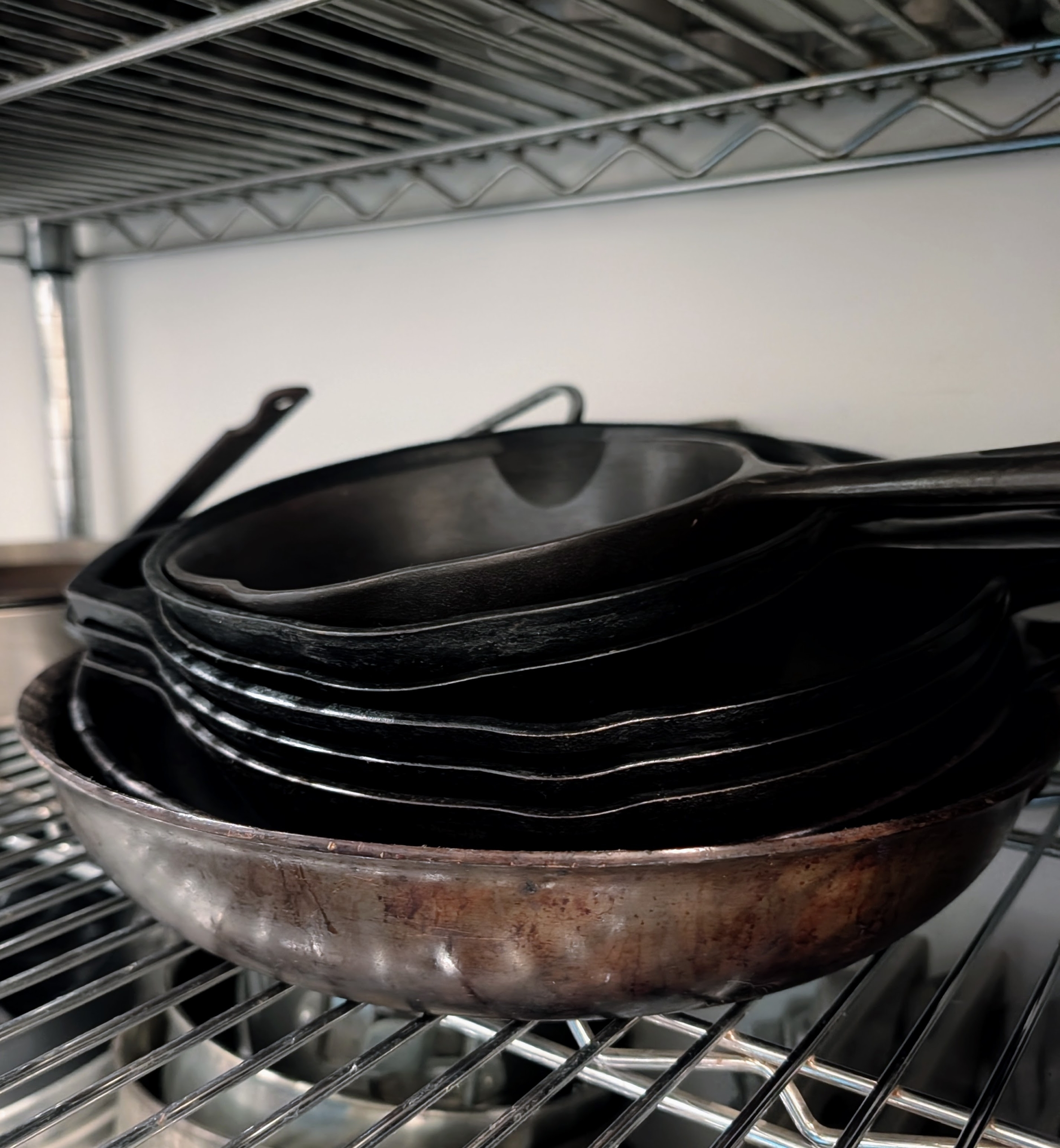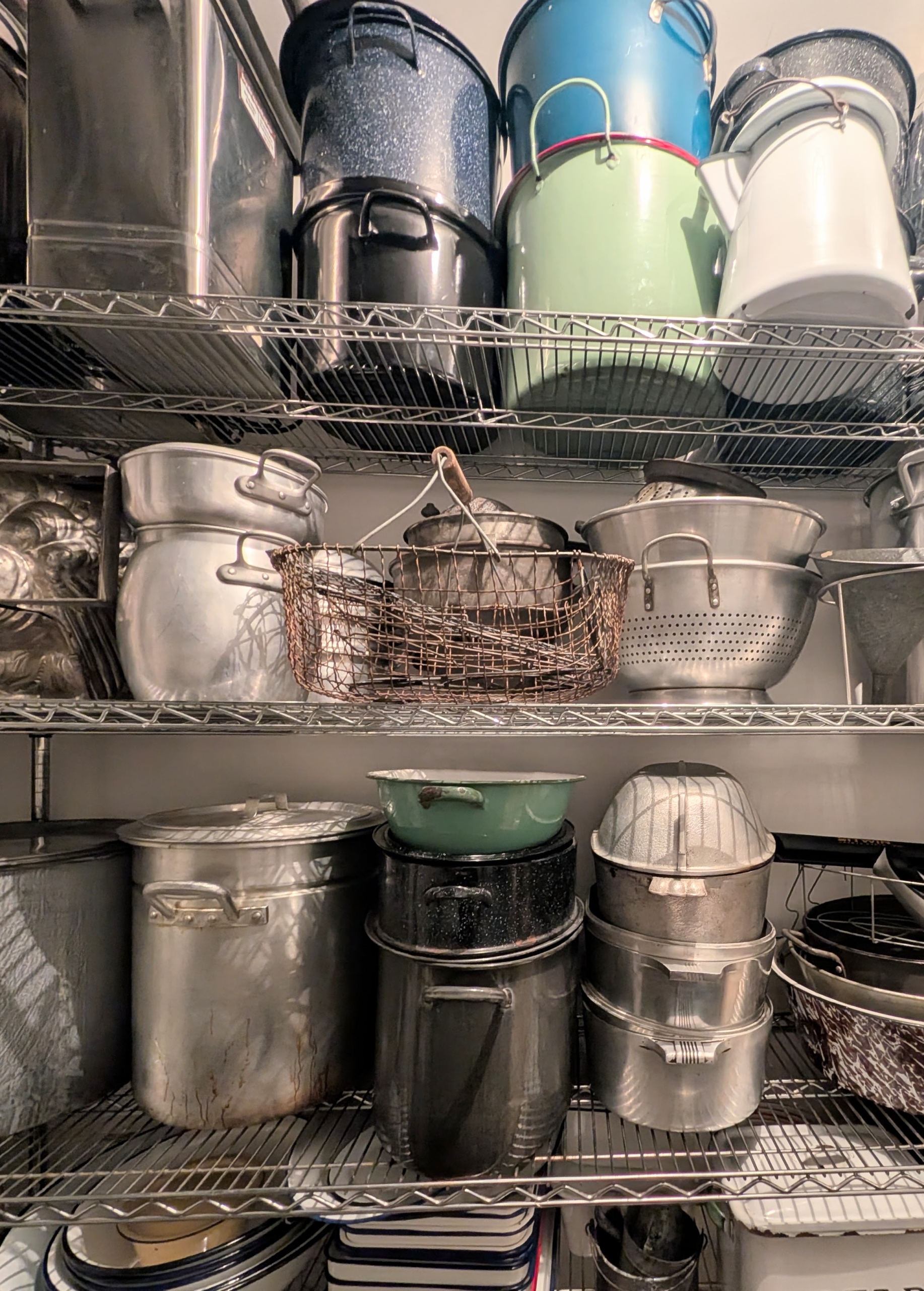 I have a lot of enamelware pans. Once they are cleaned, they are stacked appropriately next to other enamelware bowls, cups, etc.