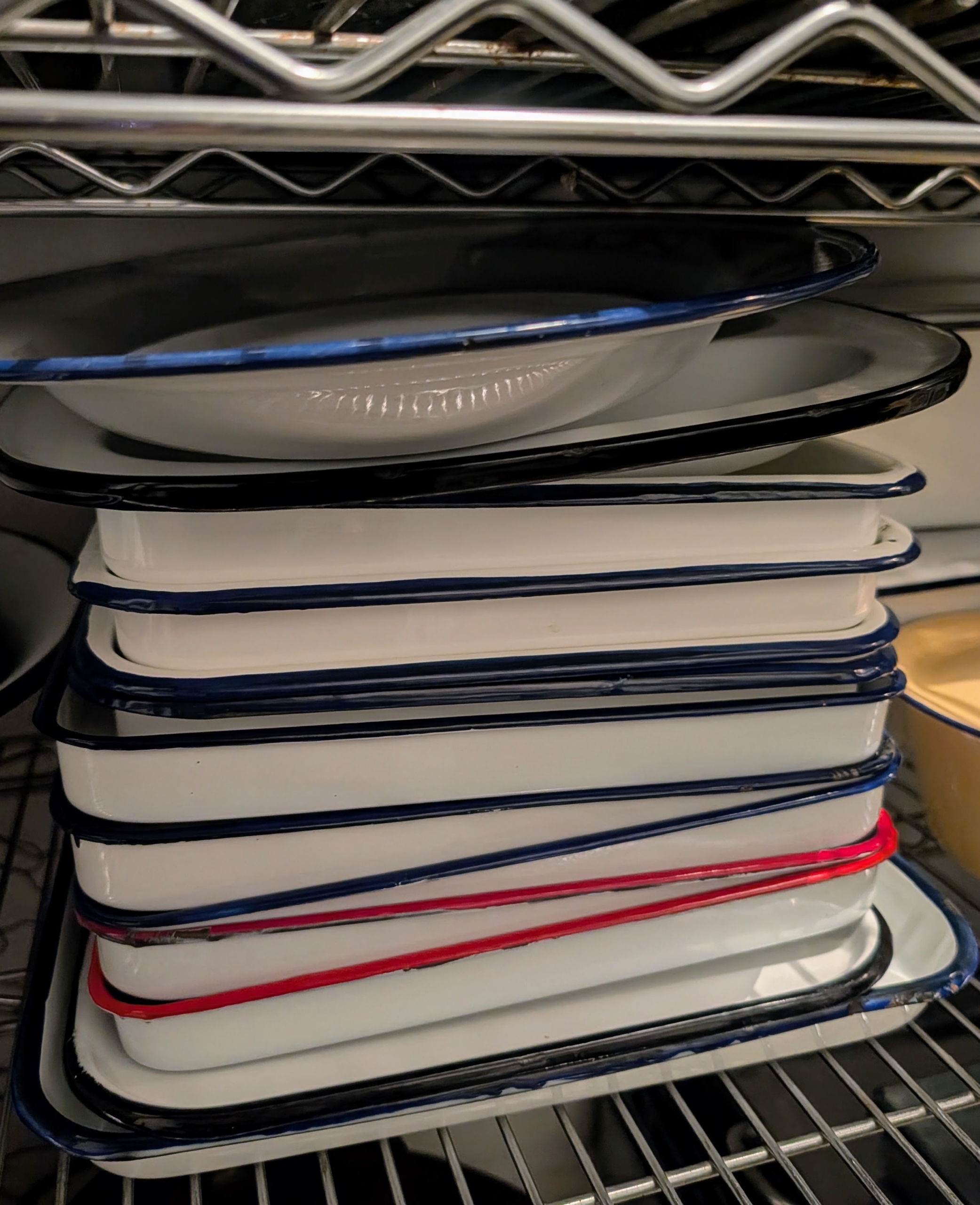 In the shelf underneath the enamelware are other metal trays of various sizes.