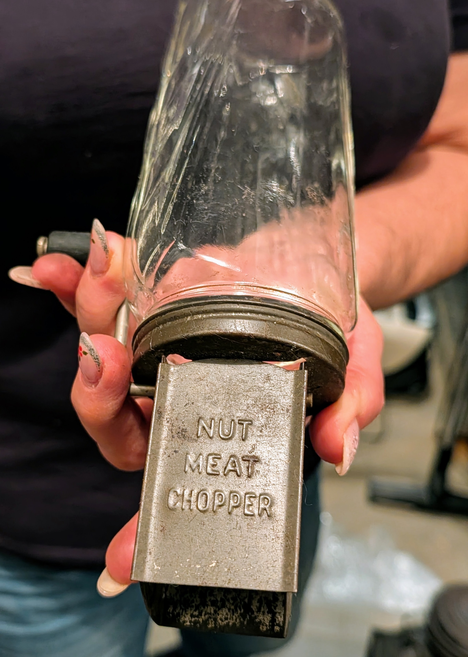 Enma came across this vintage nut and meat chopper. These are designed with a glass jar base, a metal lid, and hand crank.