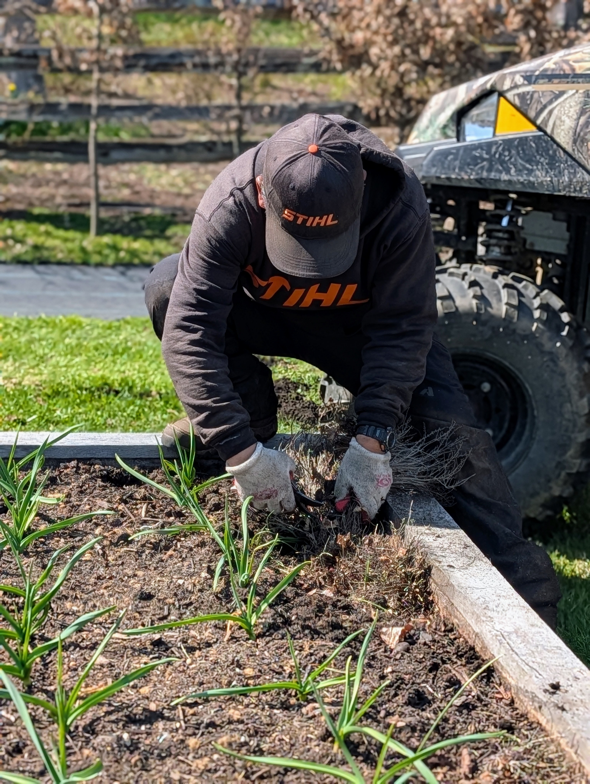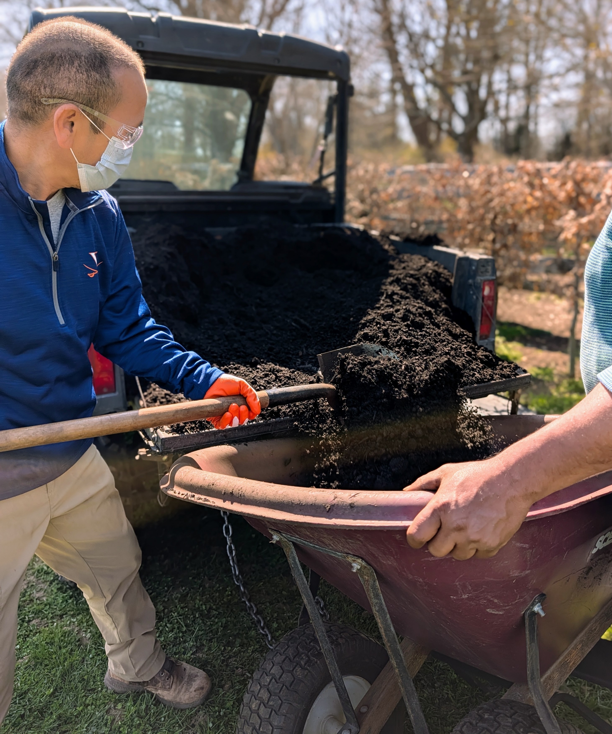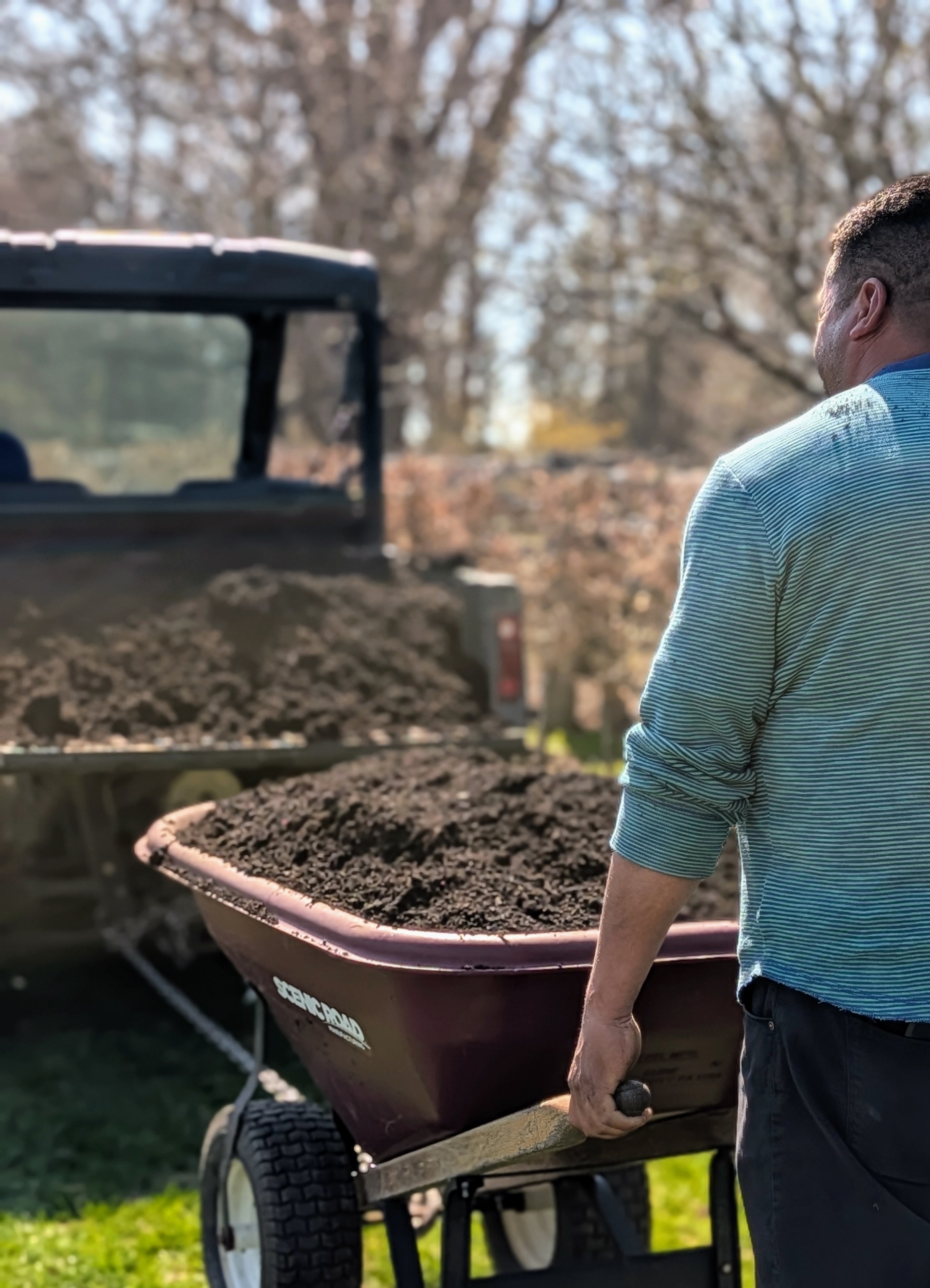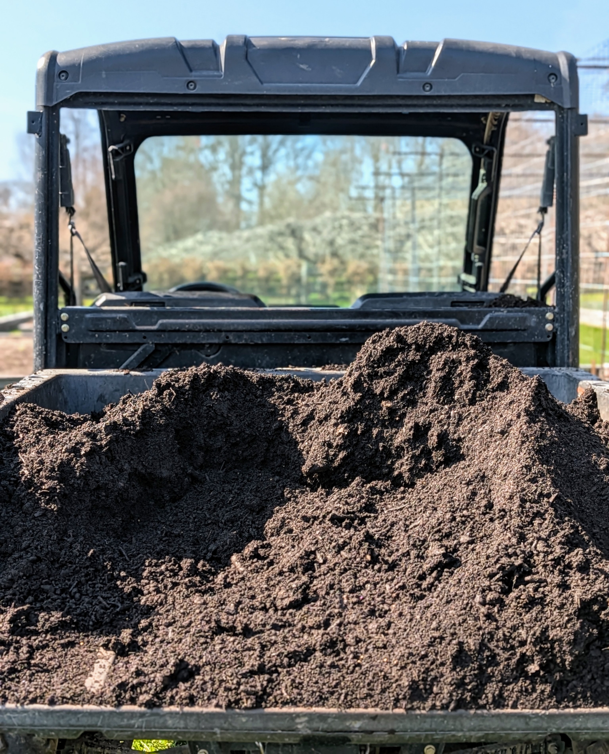 My crew uses the back of our trusted Polaris off-road vehicle to load and unload soil. Everyone at the farm uses these vehicles every day – to move soil, potted plants, tools, and supplies, etc.
