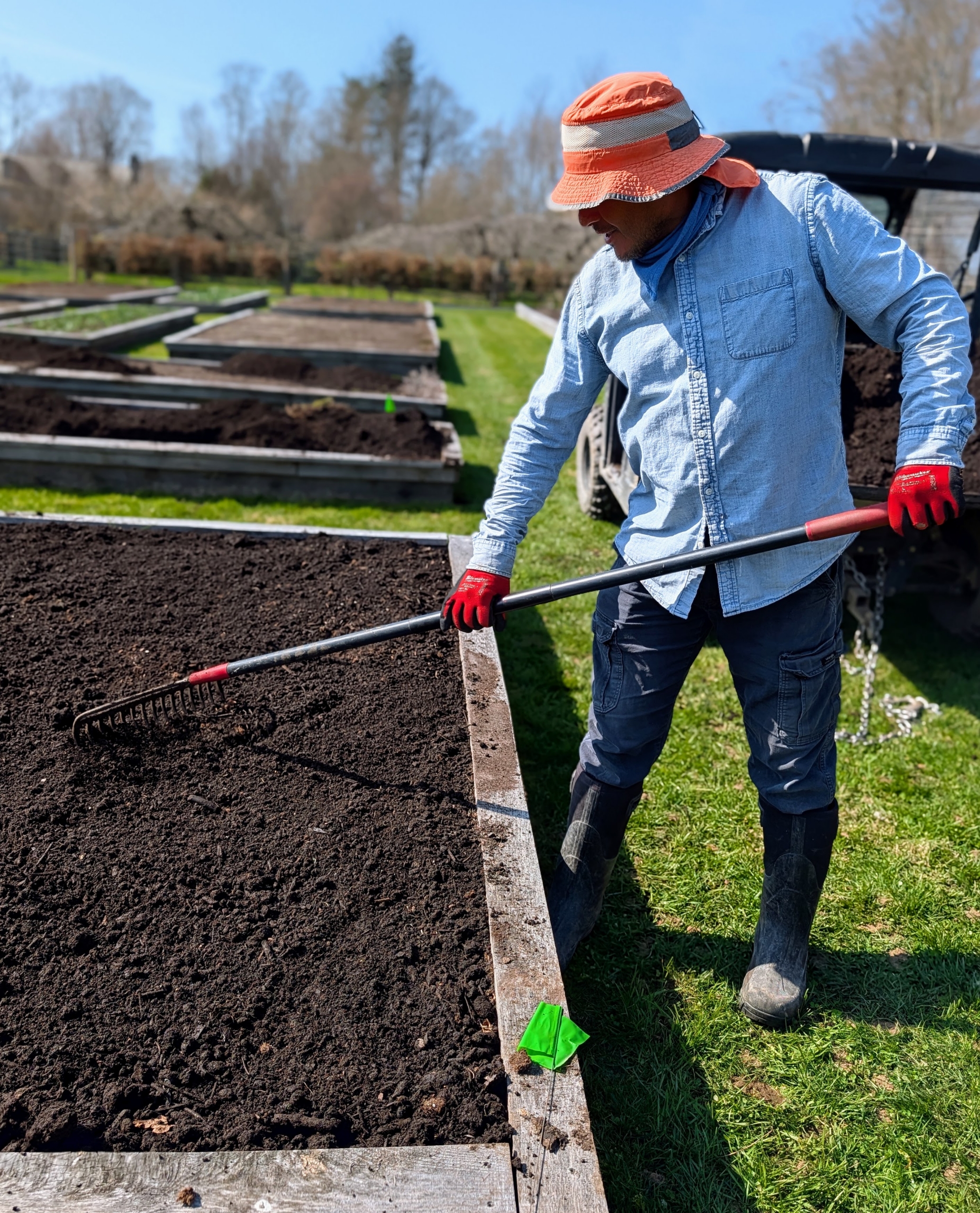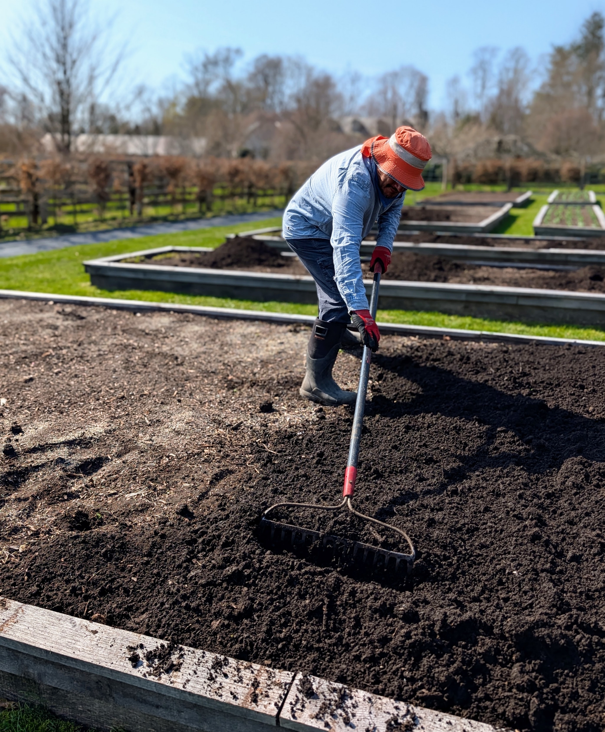 Meantime, Cesar begins raking the soil across the bed with a hard rake.
