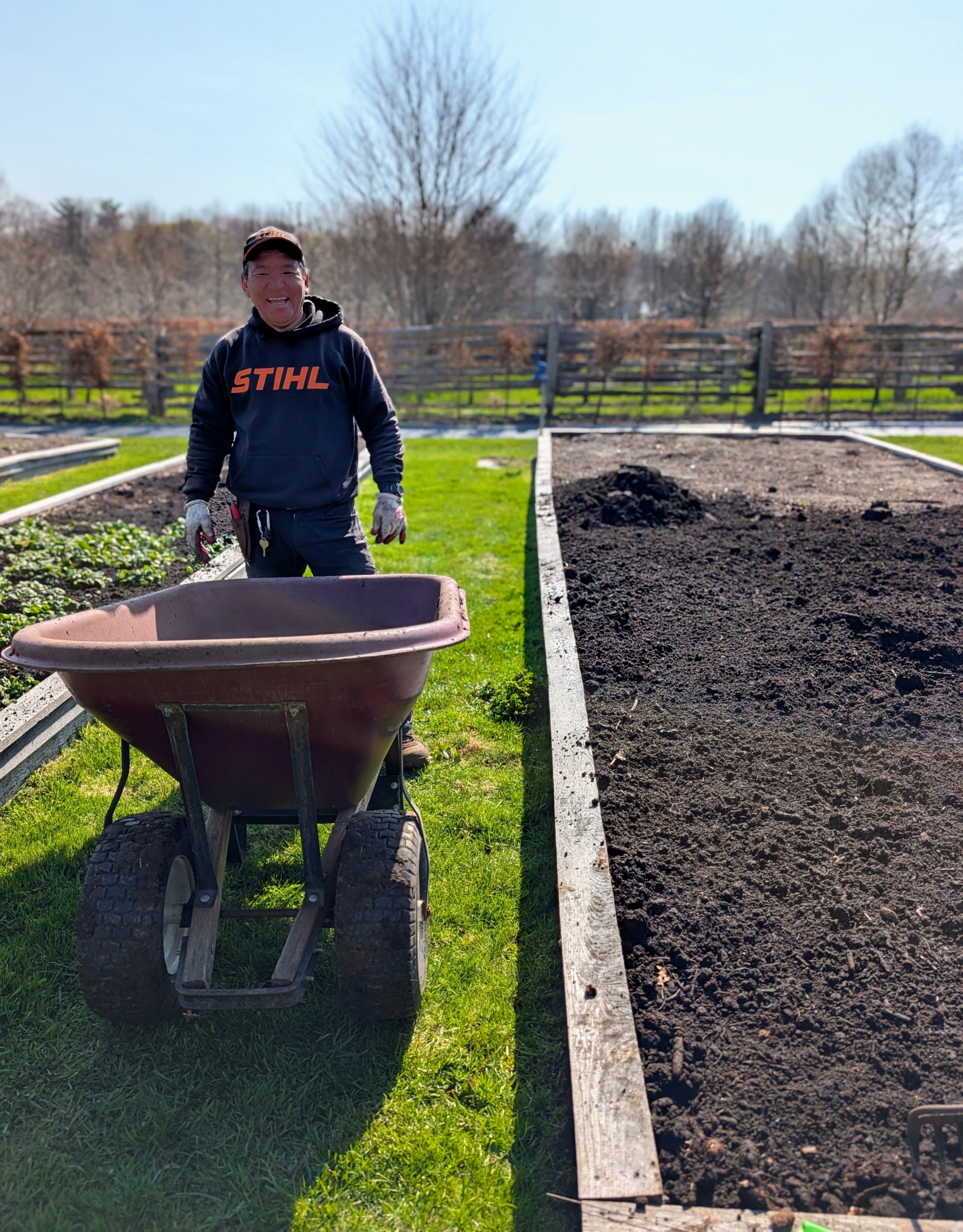 The beds in this garden range in size from about 5′ by 10′ to 8′ by 70′. Here’s Phurba going back for another wheelbarrow full for this bed.