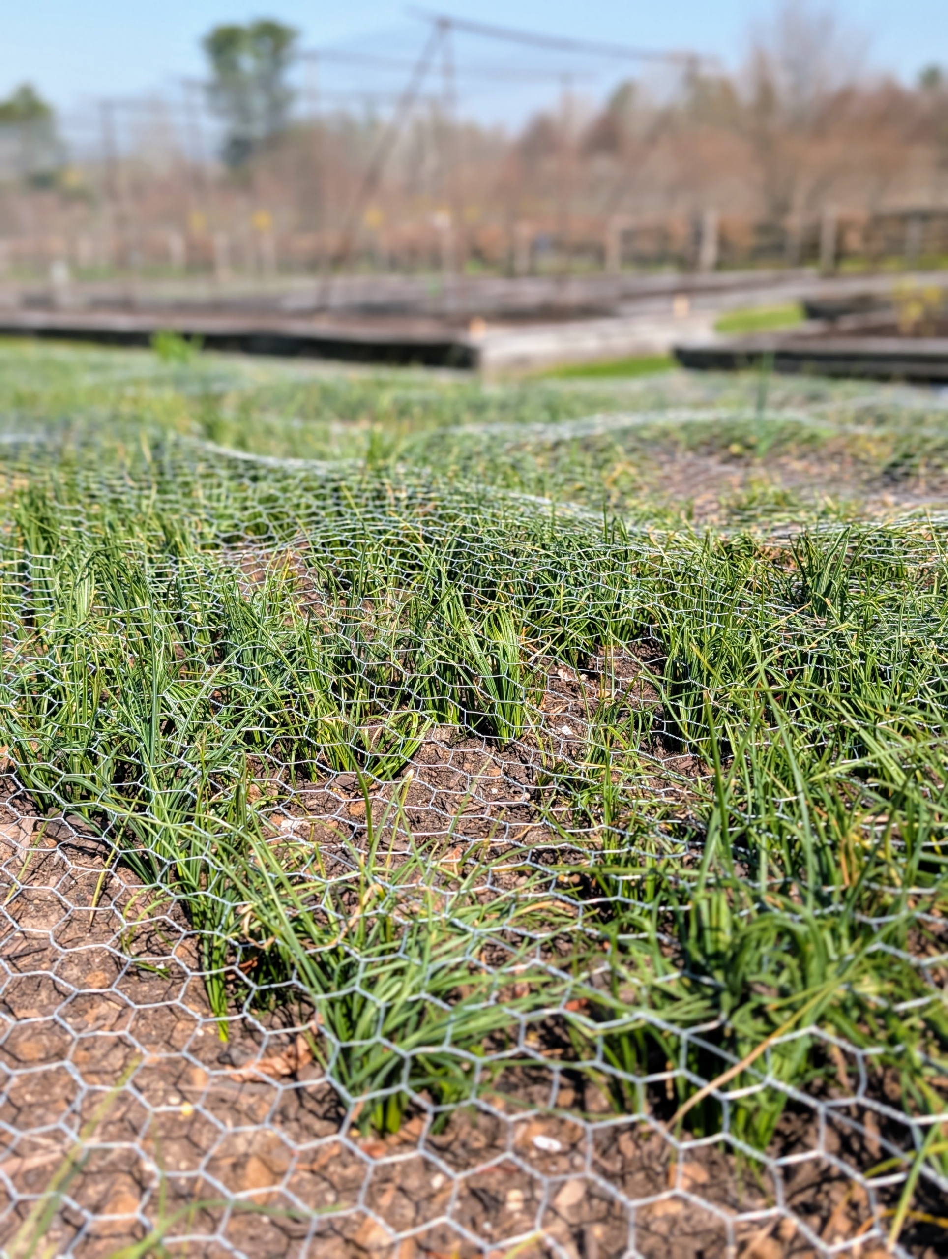 And remember the saffron planted here by my friend, Hannah Milman? In January, I covered the growing saffron with wire fencing to protect the underground bulbs from curious creatures. The foliage grows well in between the wire.