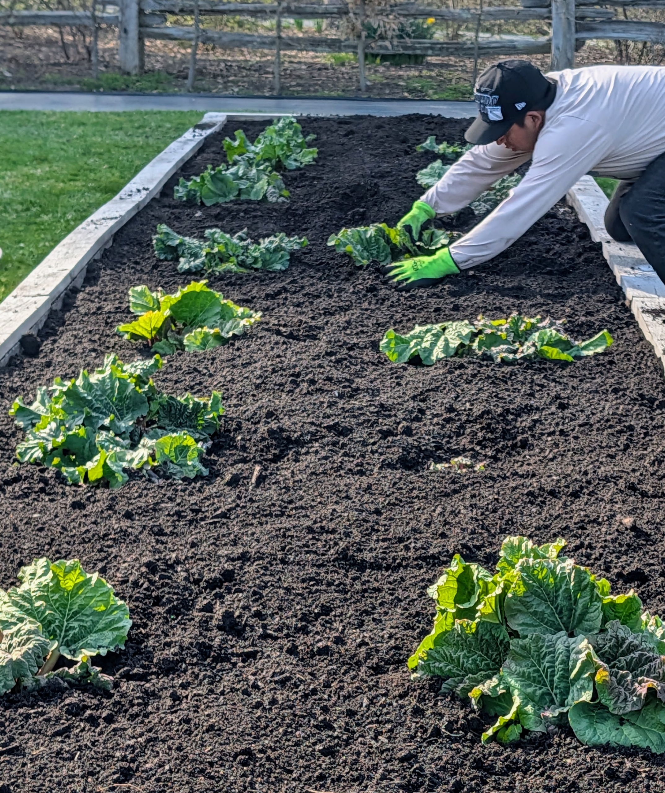 Here, soil is placed around my rhubarb plants. My rhubarb did nicely over the winter out here in the garden. When keeping rhubarb during the cold season, be sure it is well fed and maintained, to ensure good health and productivity.