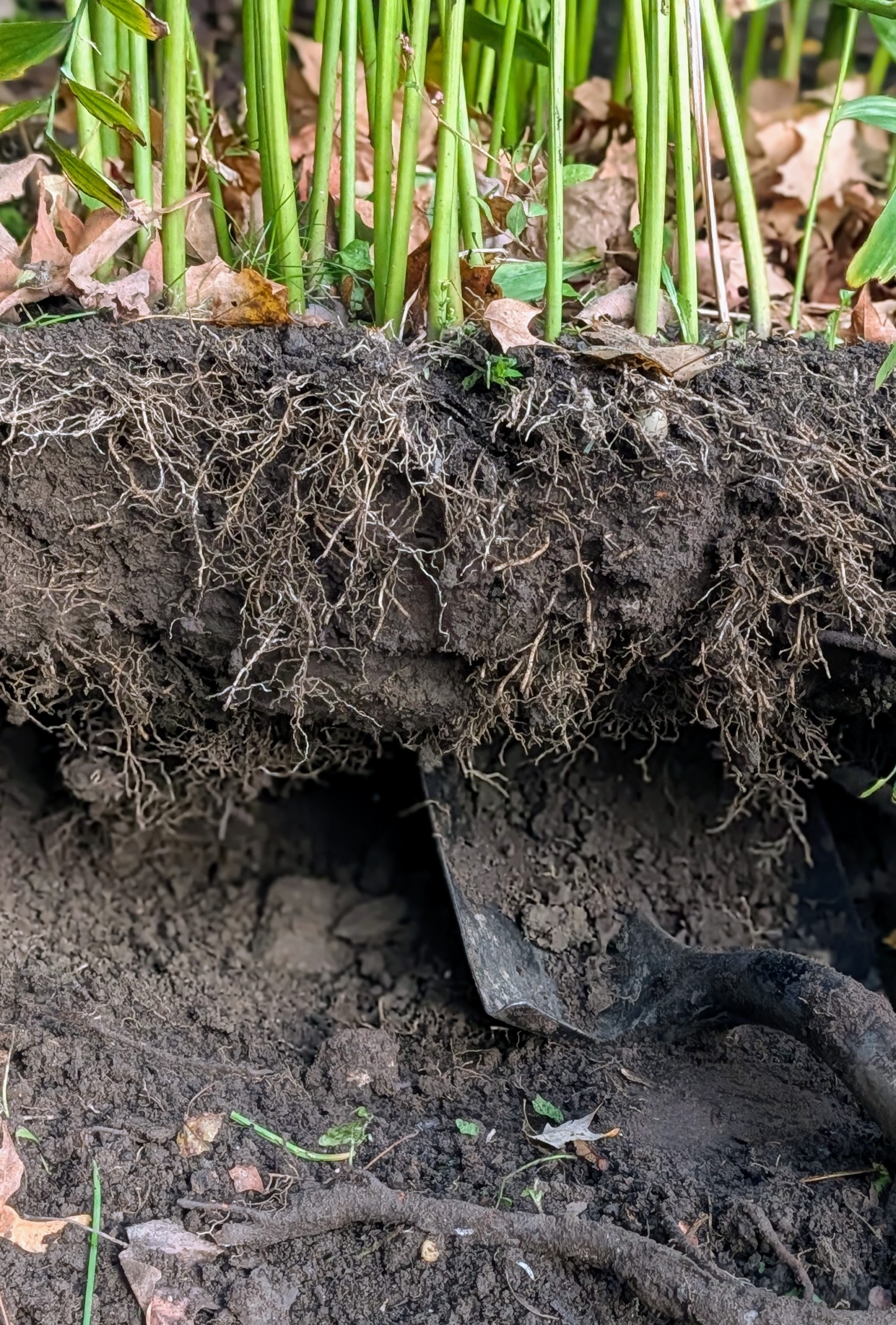 Then, using a shovel he carefully lifts the plants out of the ground. Solomon’s Seal has shallow roots, making it pretty easy to lift up. And, do you know the difference between a shovel and a spade? Shovels are designed for scooping and moving loose materials, while spades are better suited for cutting through compacted soil. I always say, “use the right tool for the right job.”