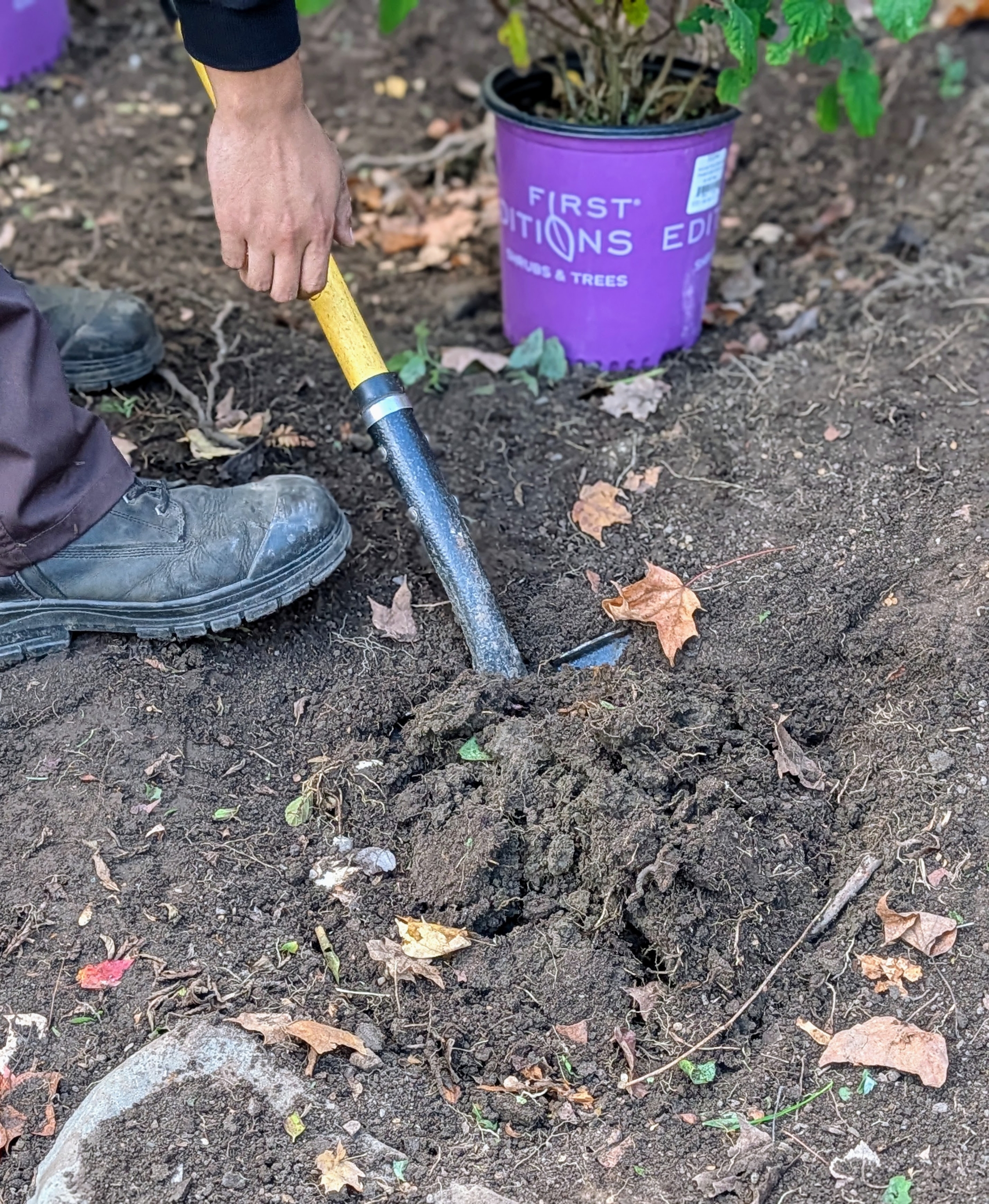 To remove it, Cesar uses a spade and carefully inserts it around the edge of the plant root balls to loosen them.