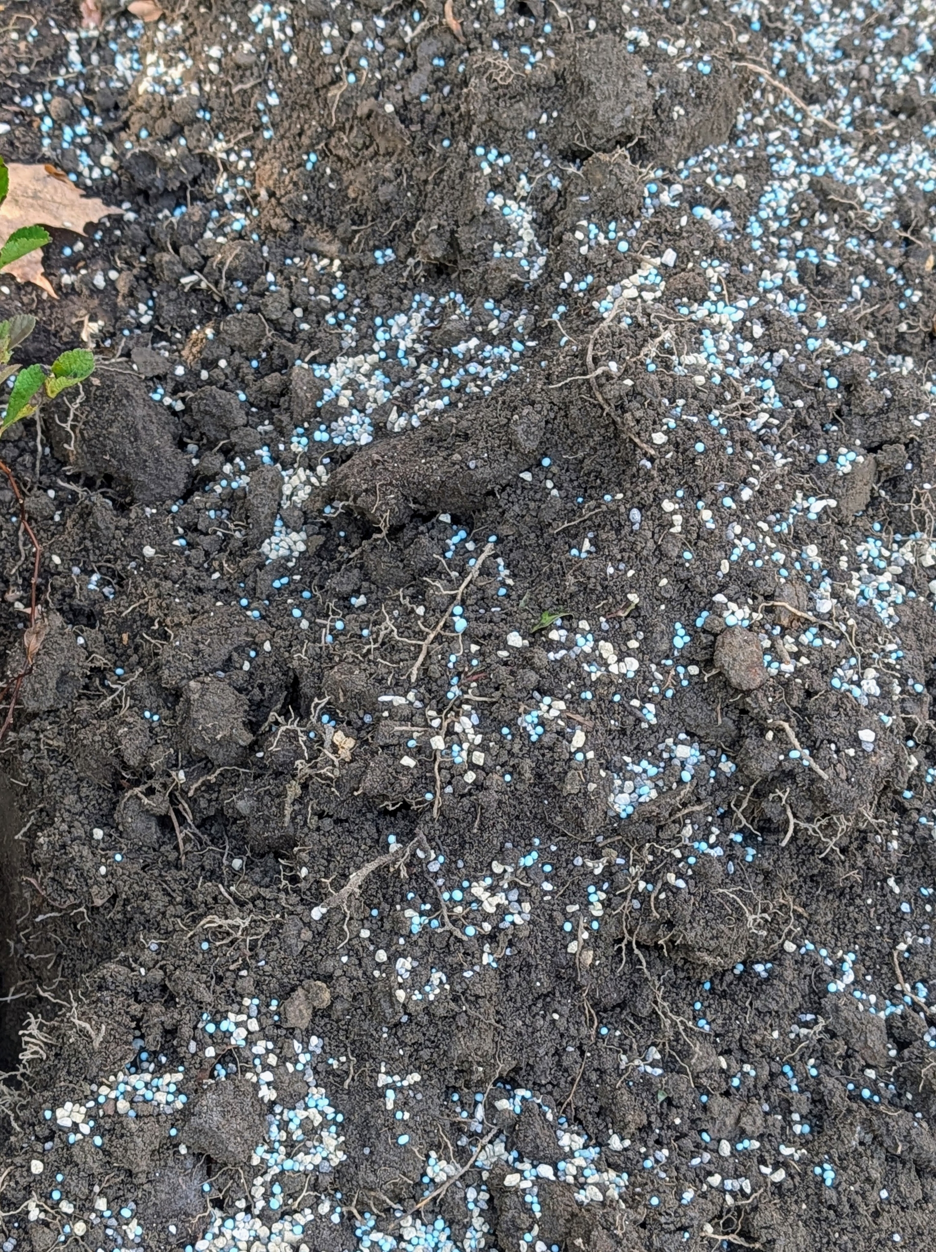 A good all-purpose fertilizer is sprinkled in the hole and on the surrounding soil.