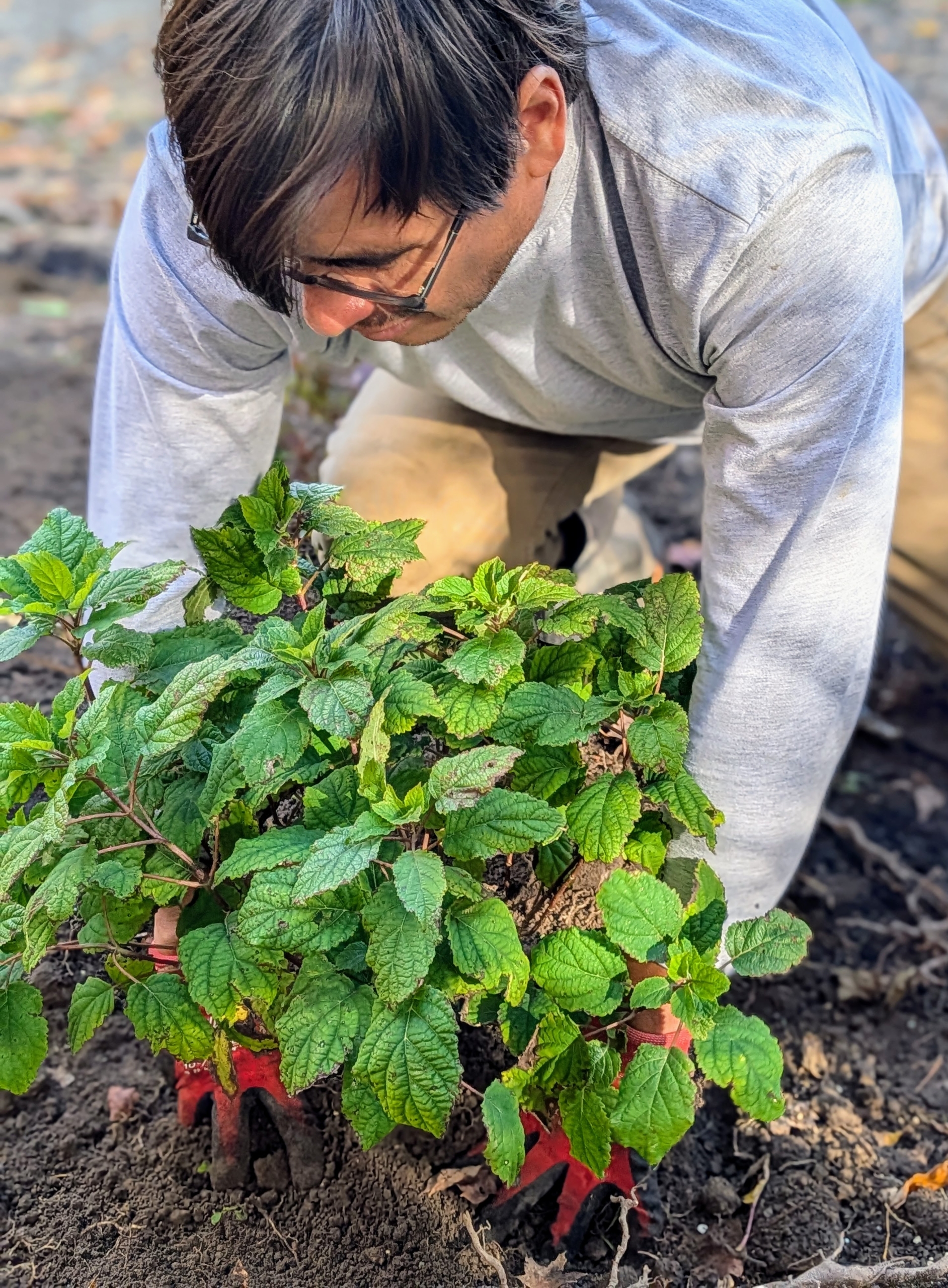 Cesar places the Solomon’s Seal plants carefully into a crate, so they can be transplanted in another bed.