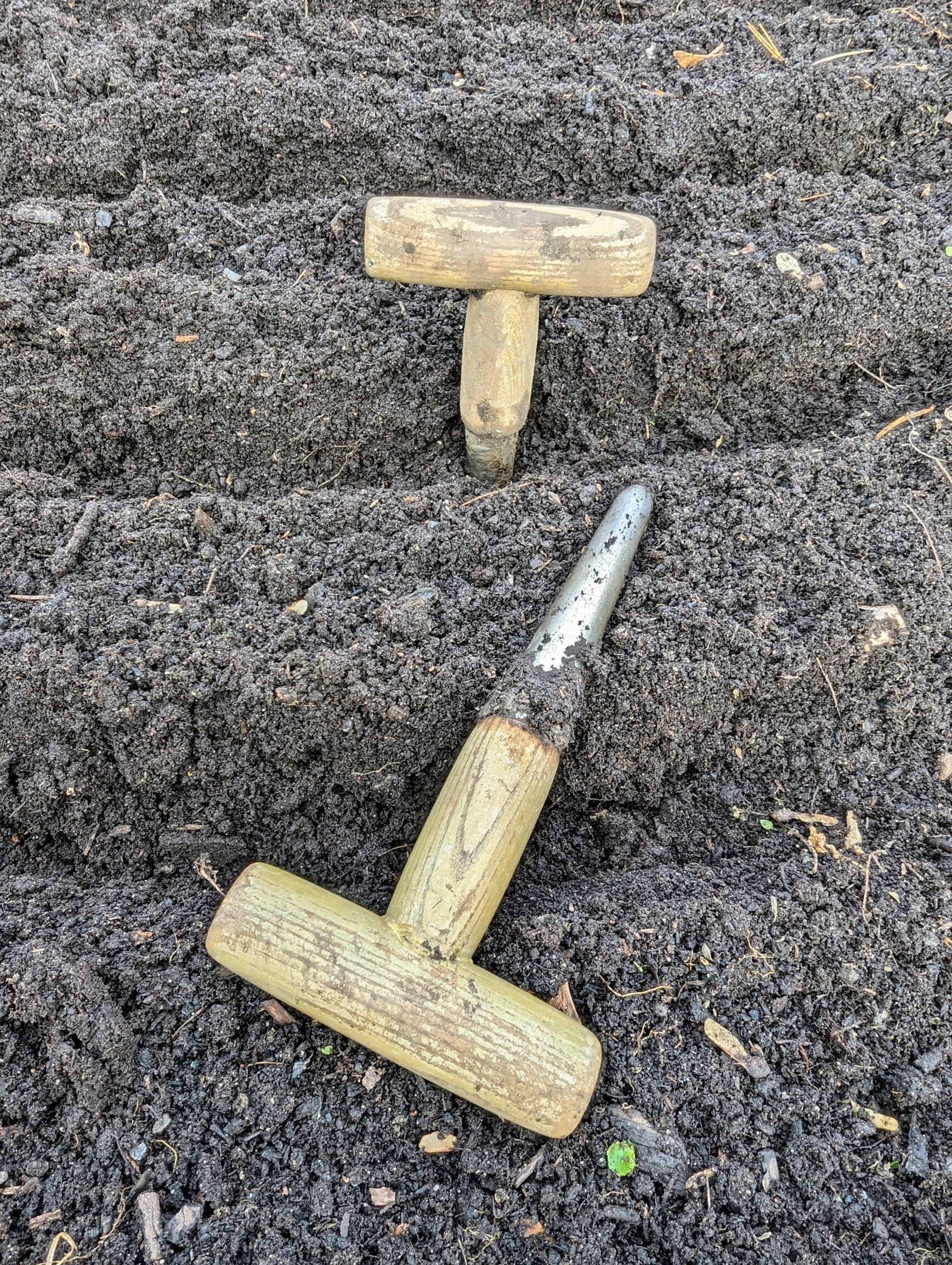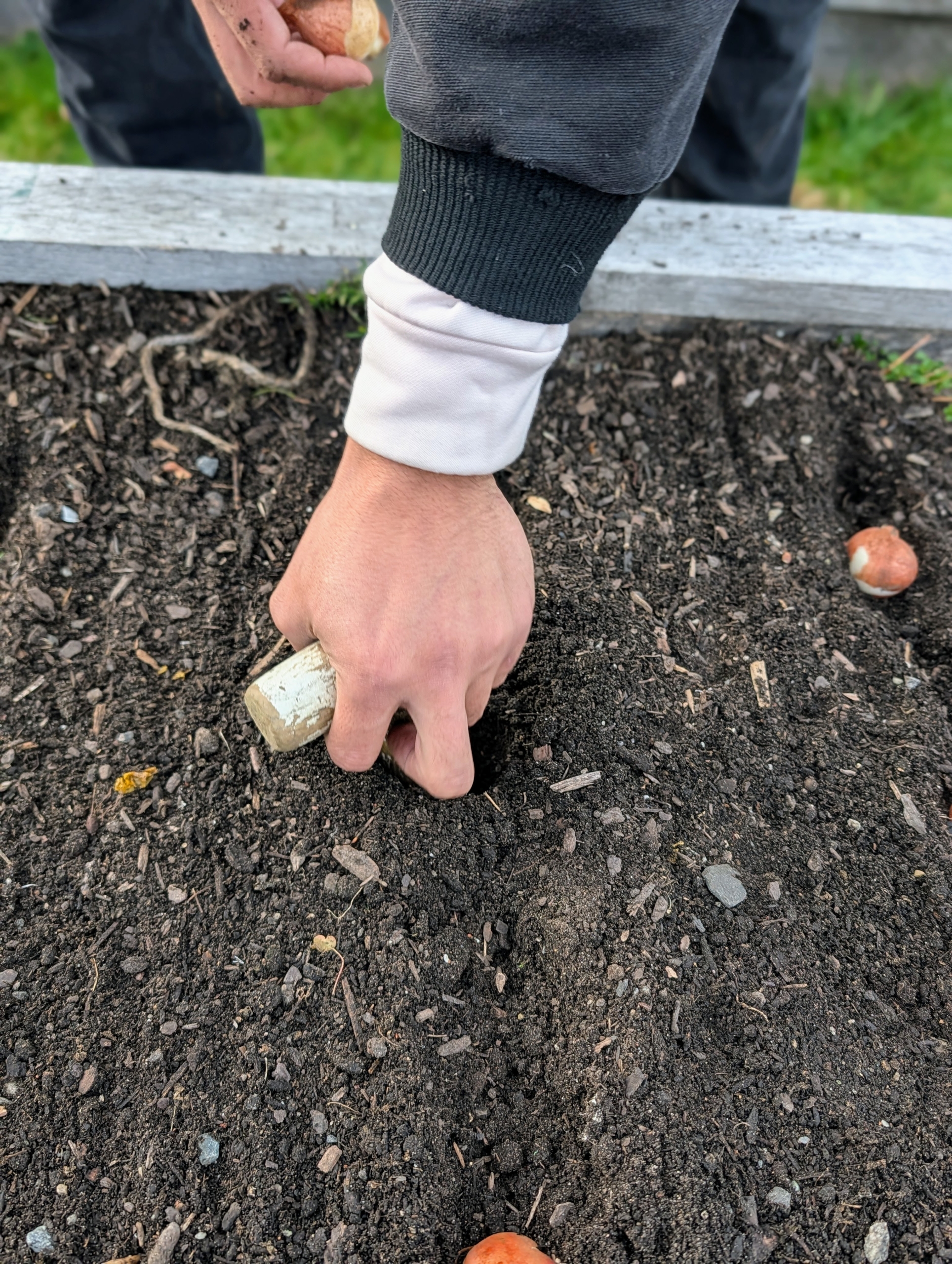 - Once all the bulbs are in their designated rows, Matthew pushes the dibber into the soil making a hole where the bulb will be planted.