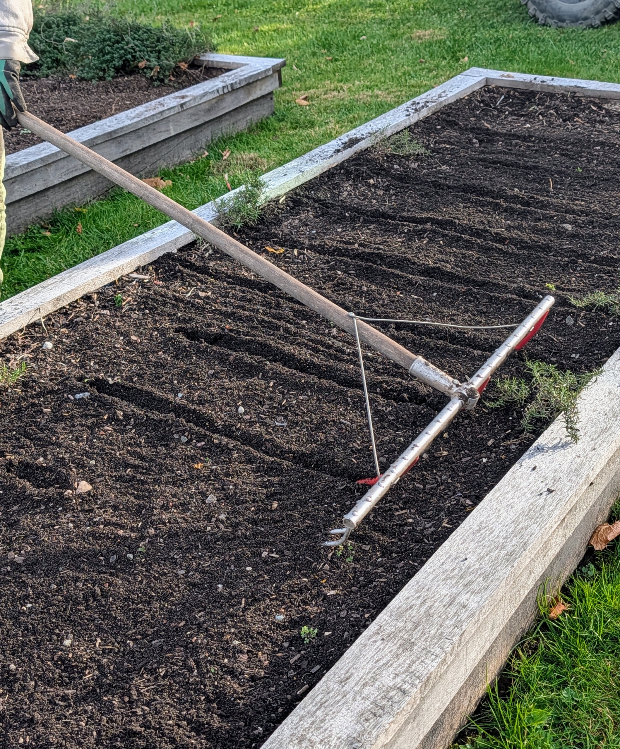 - Ryan follows by making the rows using the bed preparation rake from Johnny’s Selected Seeds. This tool allows him to create shallow furrows in the soil. Hard plastic red tubes slide onto selected teeth of the rake to mark the rows.