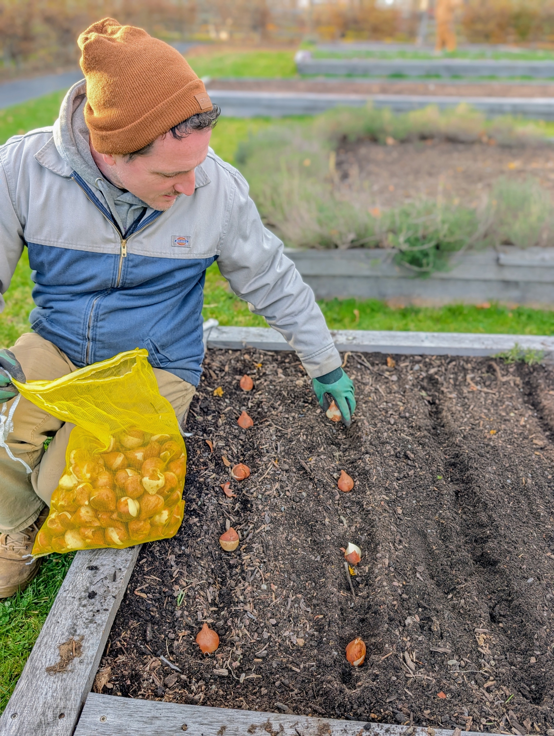 - Once the bulbs are in their designated trenches, it’s time to cover and rake the bed. Phurba carefully uses the back of a soft rake so he doesn’t disturb the bulb placements.
