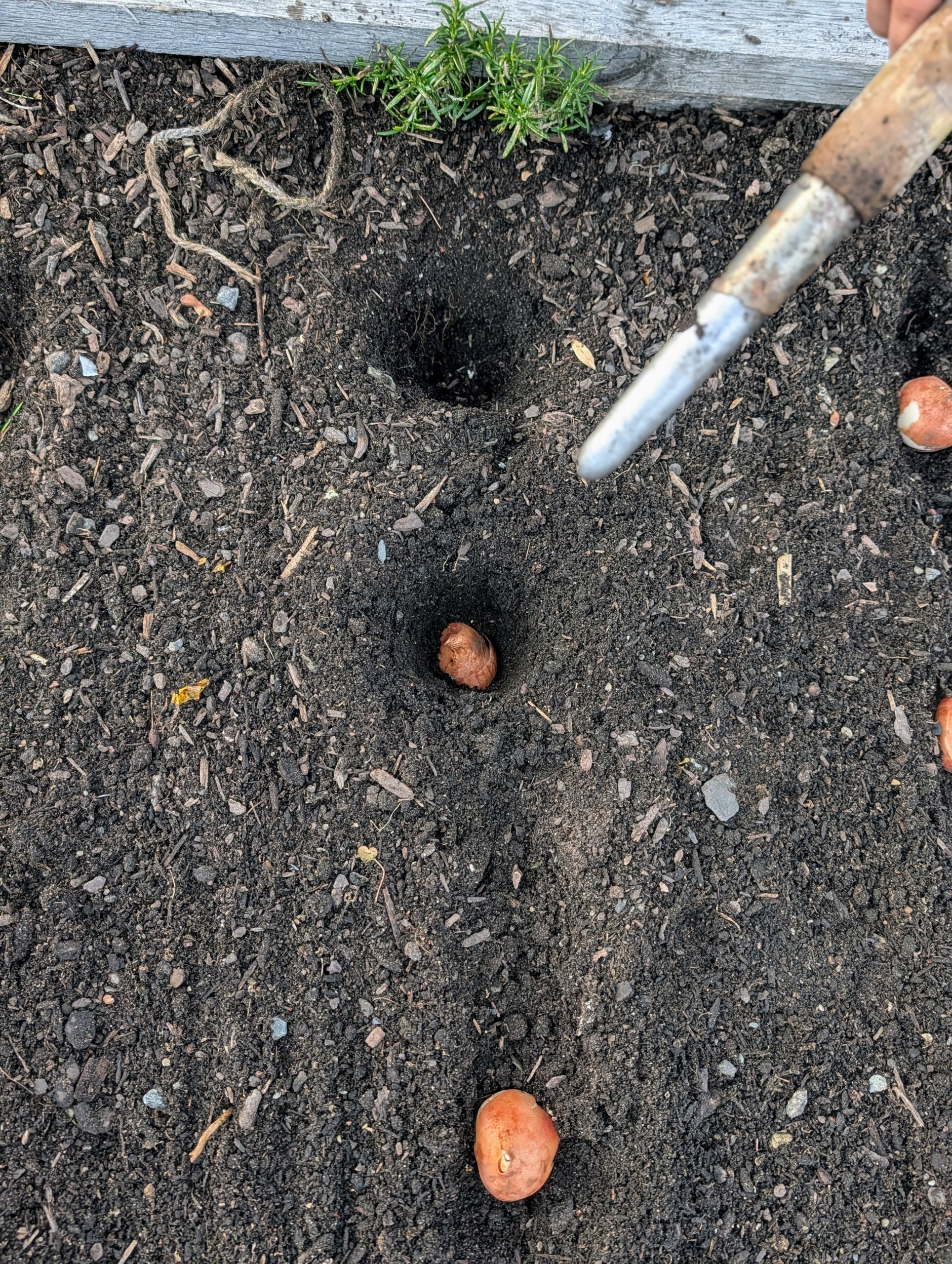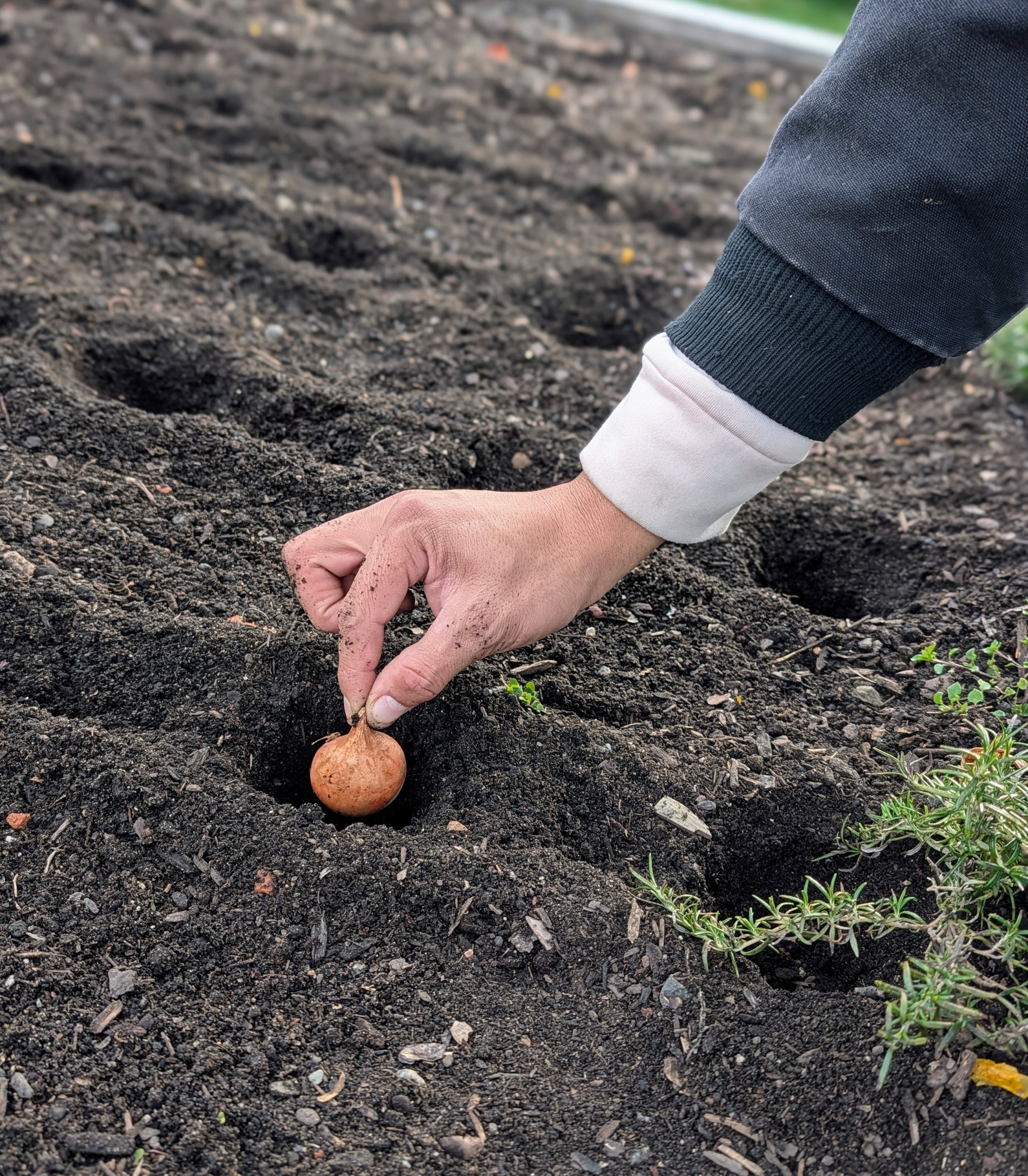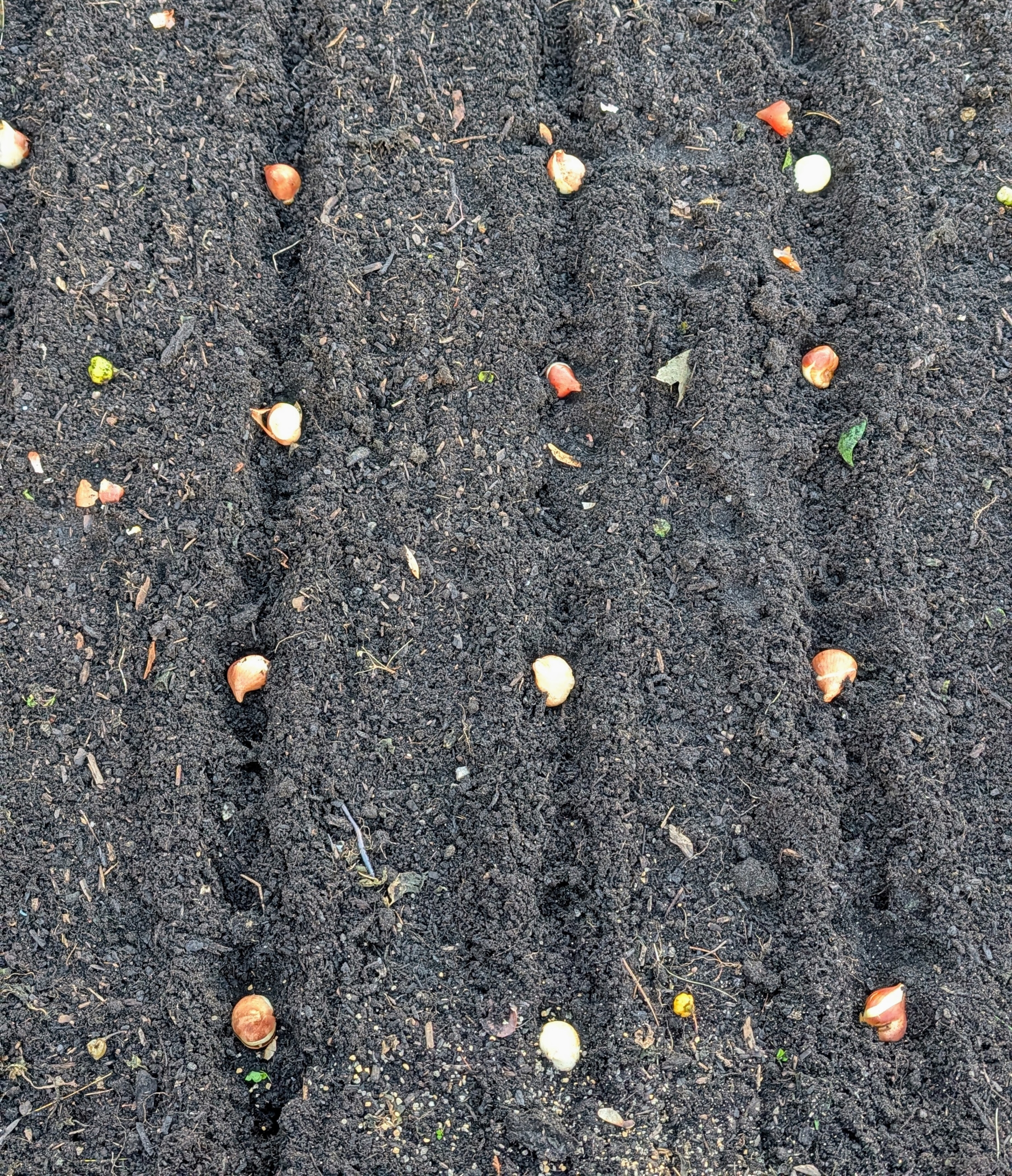 - Here is the bulb in the soil. Matthew plants all the bulbs before backfilling, so he can keep track of the planted holes and rows.