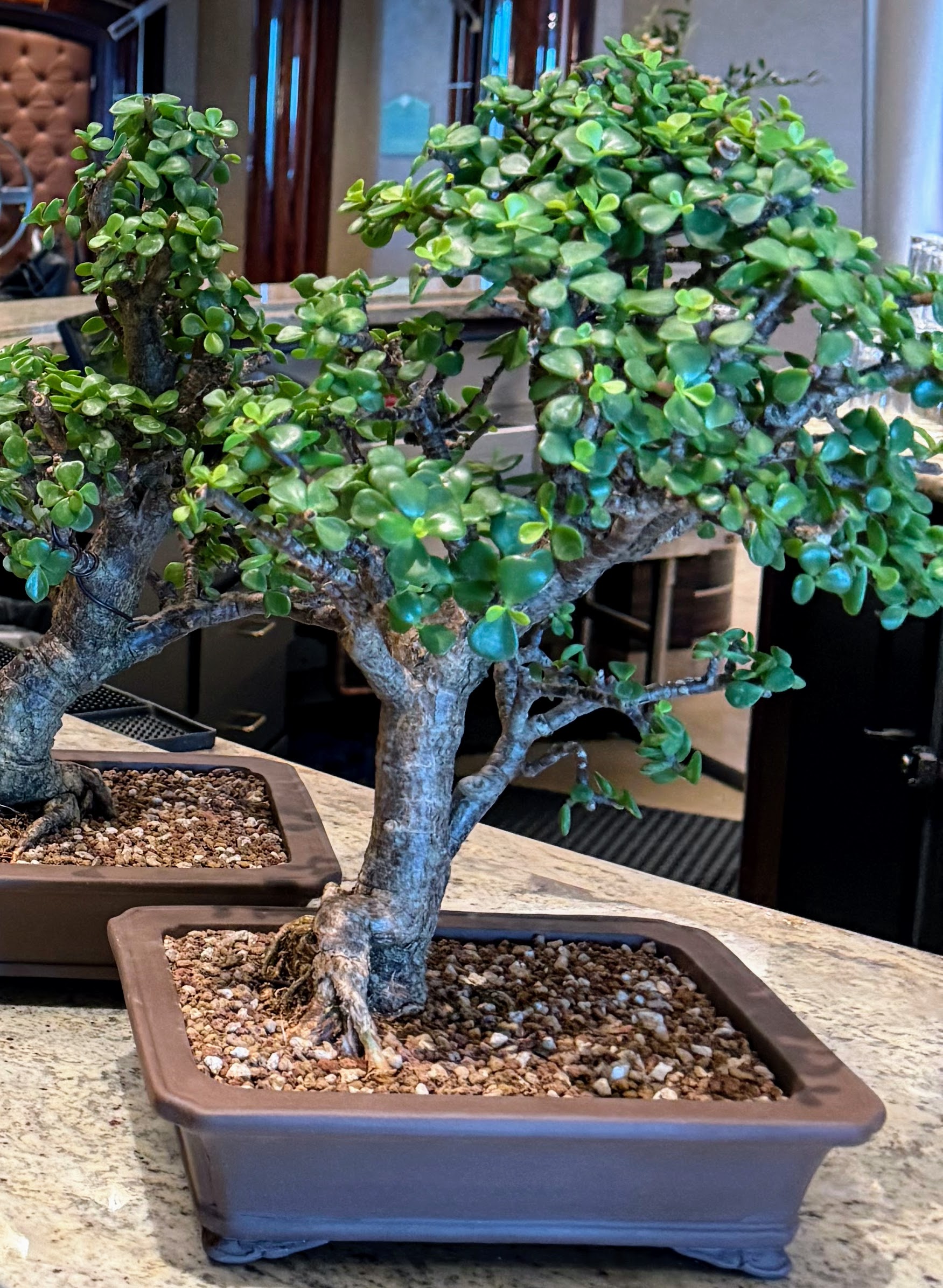 Each of these is a jade bonsai – a dwarf version of the fleshy, soft, woody tree. These have such beautiful fine branch structures with thick green oval-shaped succulent leaves.