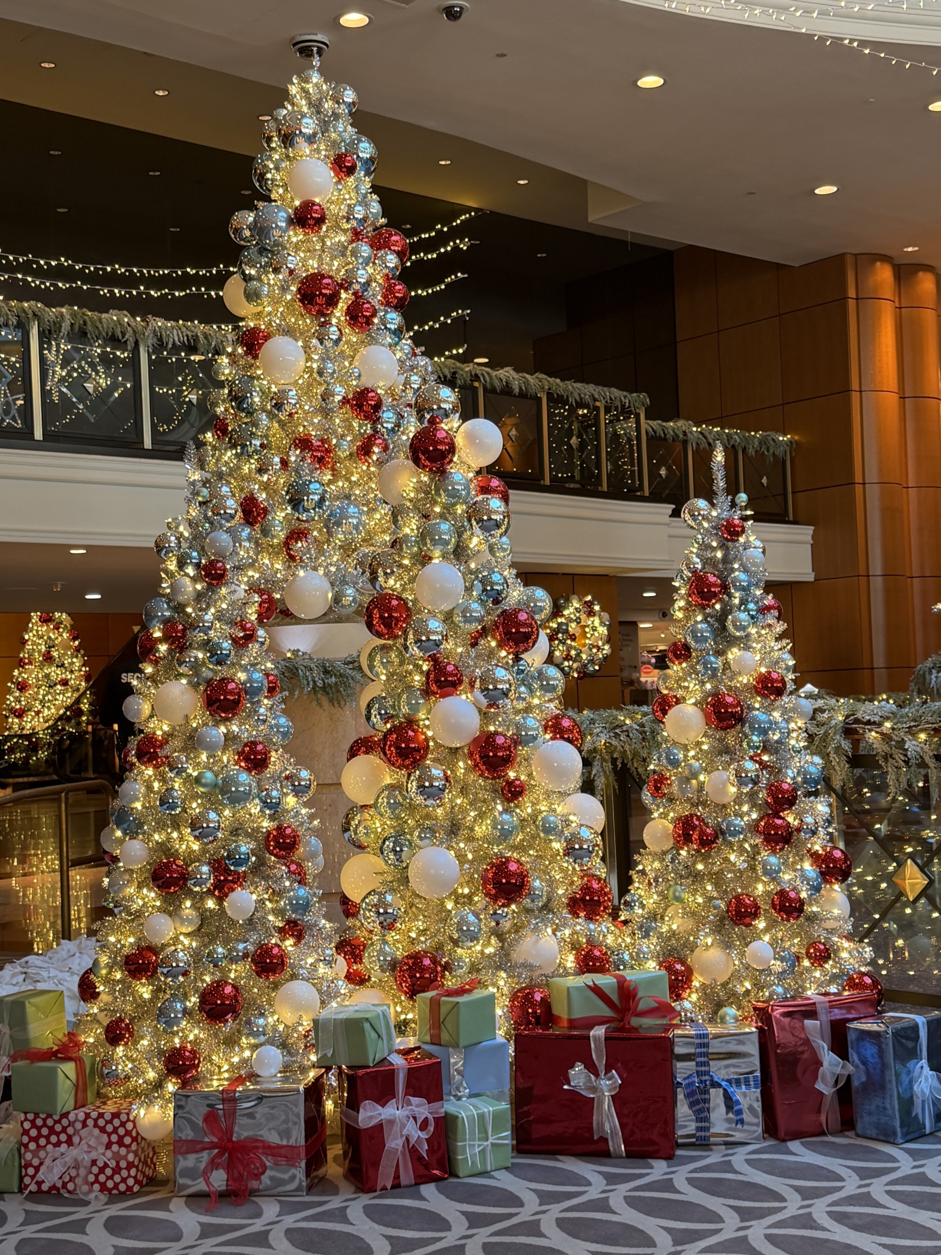 The more ornaments, the better. I always decorate every branch. Here at Foxwoods, the theme colors include silvery blue, silver, gold, red, and white.