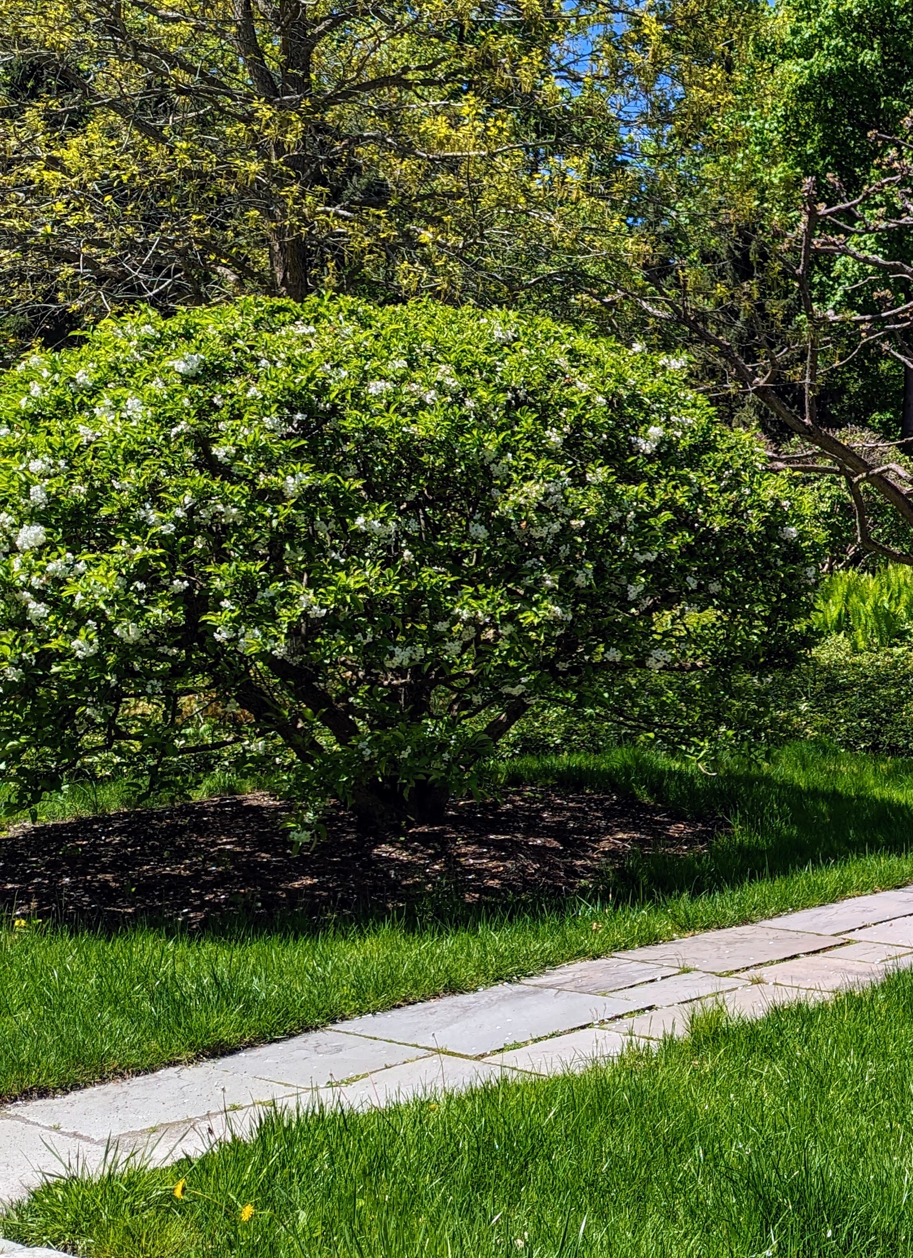These are two of four Sargent crabapple, Malus sargentii, in early April. The name of this species comes from the man who introduced it from its native Japan in 1892, C.S. Sargent. These are good trees for many different landscapes. It has a unique size and form, growing as a dense, mounded shrub rather than a tree.