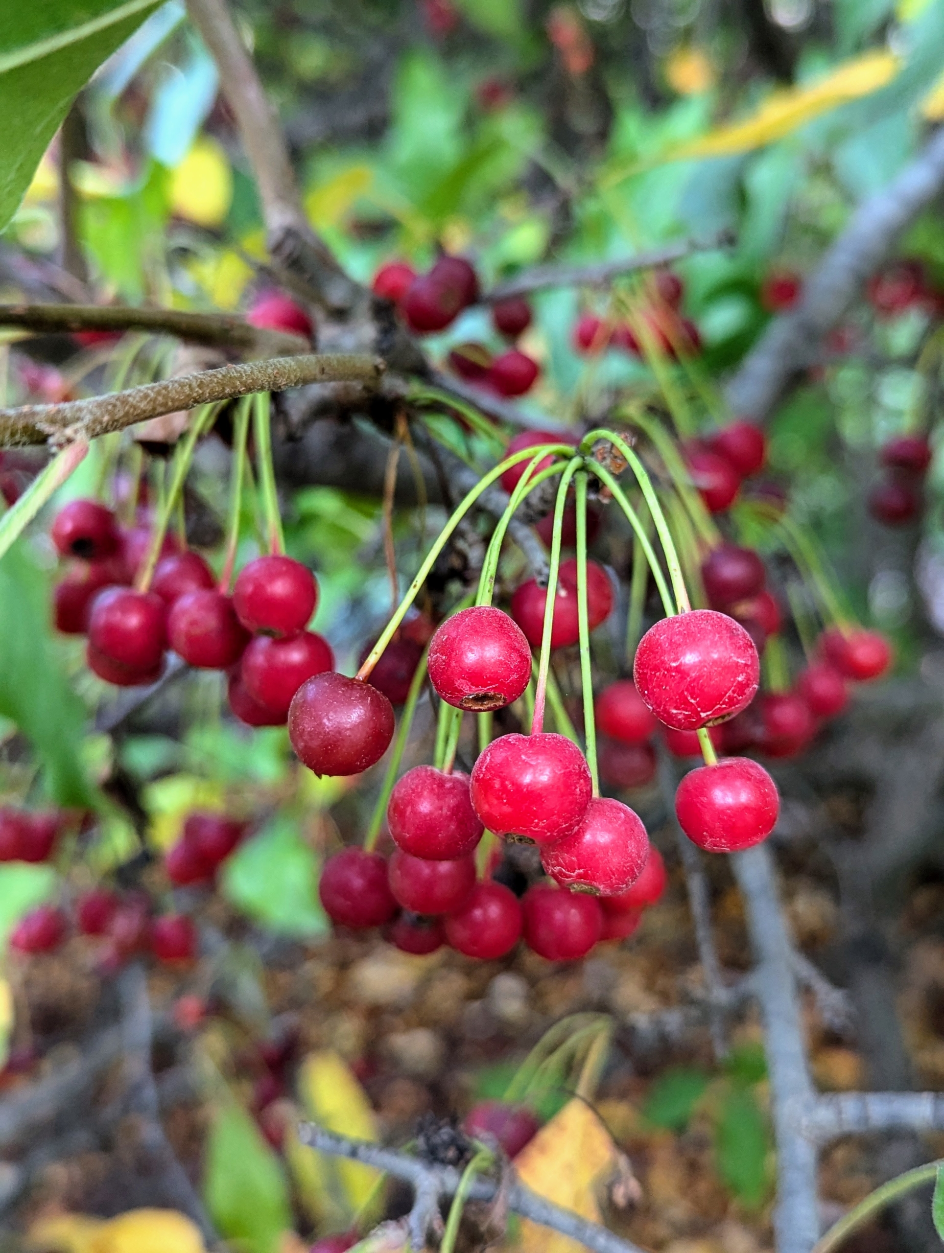 In autumn, bright red to dark fruit can be seen among the leaves. They stay through the season and into winter.