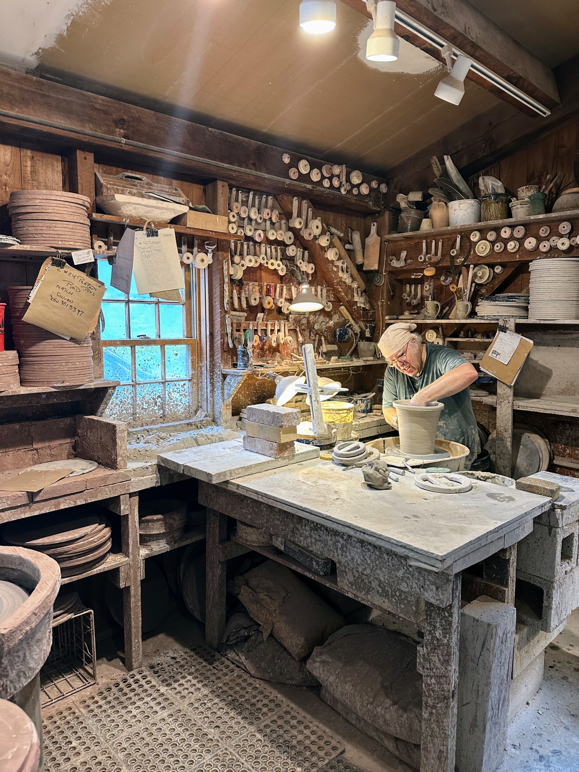 - Through a small doorway is the additional room where all the pots are created. Look closely – the corner wall behind the potter’s wheel is filled with small tools called coggles, roulettes, or rolling stamps, which are used to decorate the pottery.