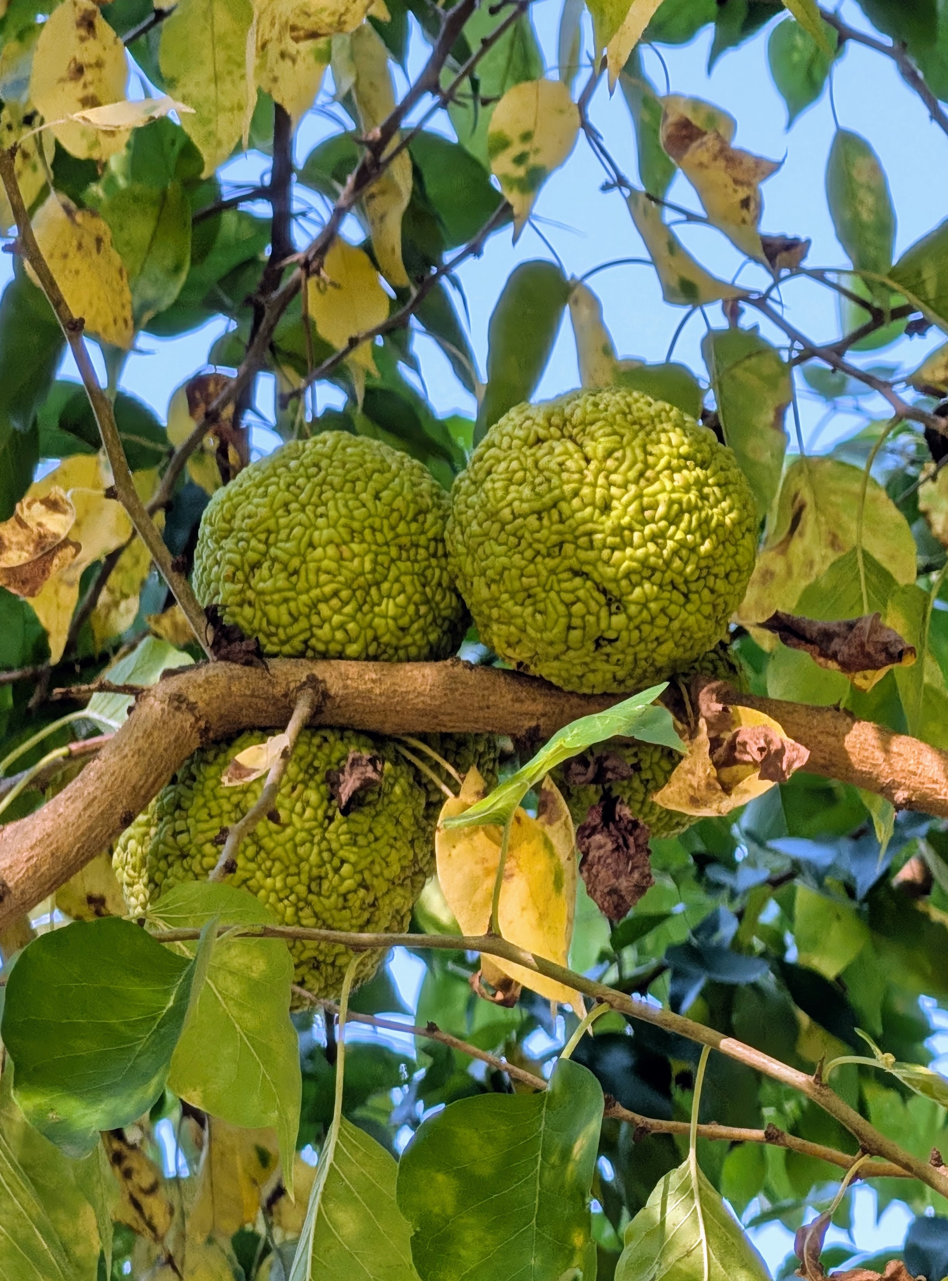 - This time of year, more specifically, September and October, I also see Osage Oranges on the trees. The Osage orange, Maclura pomifera, is actually not an orange at all, and is more commonly known as a hedge-apple, horse-apple, or mock-orange. Each one is about four to five inches in diameter and filled with a dense cluster of hundreds of smaller fruits