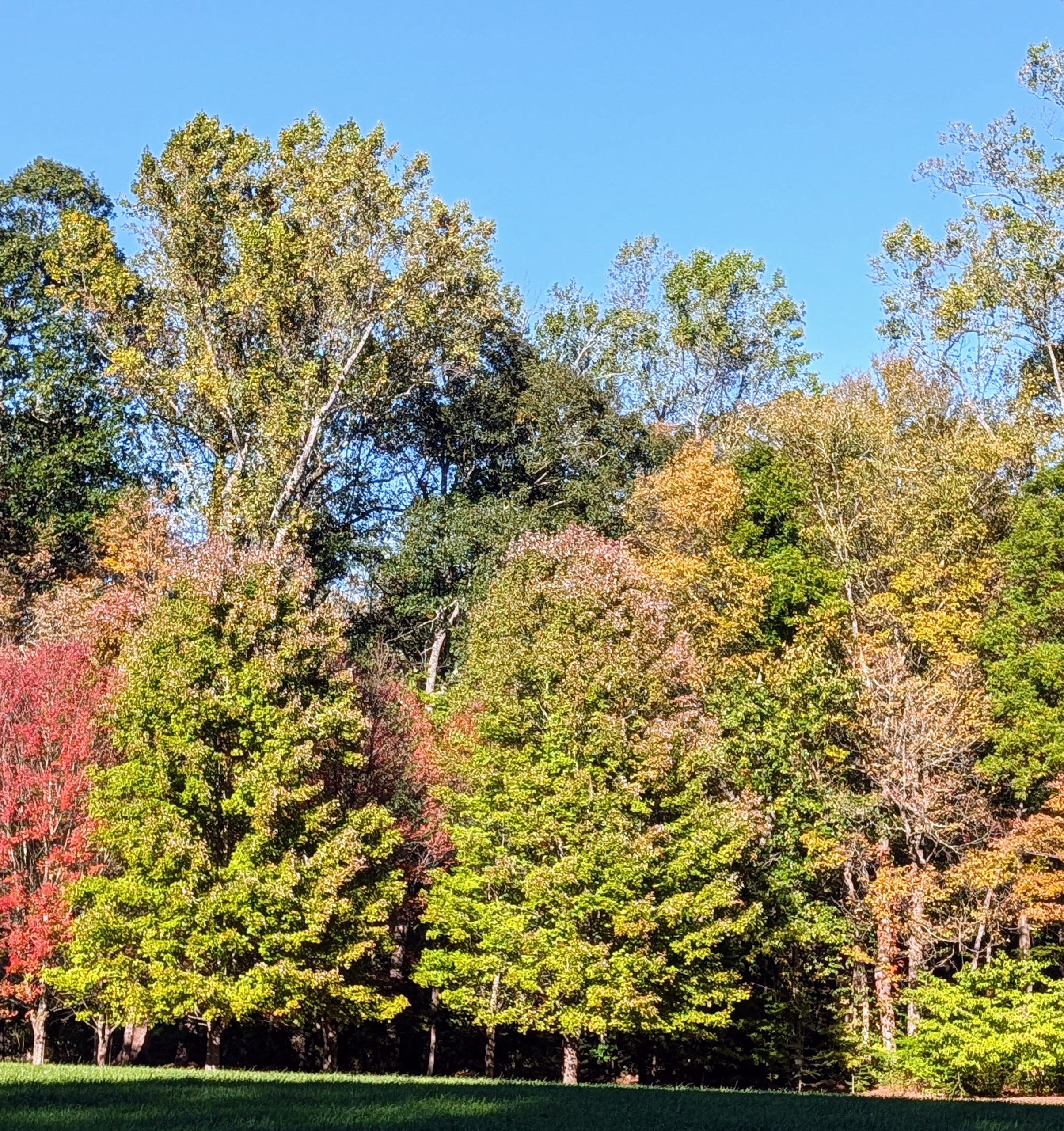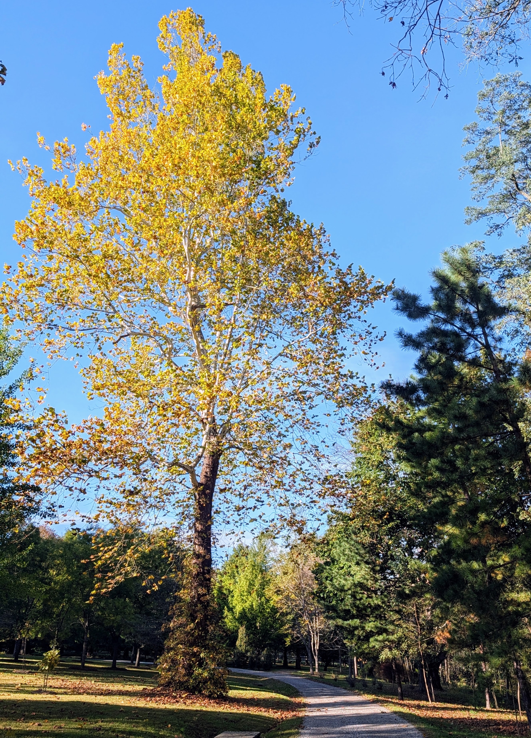 - And here is one of the large sycamores. In the fall, sycamore trees exhibit a more subtle transformation, changing from bright green to muted yellow-brown, but still quite eye-catching. The mighty sycamore is the symbol of my farm.
