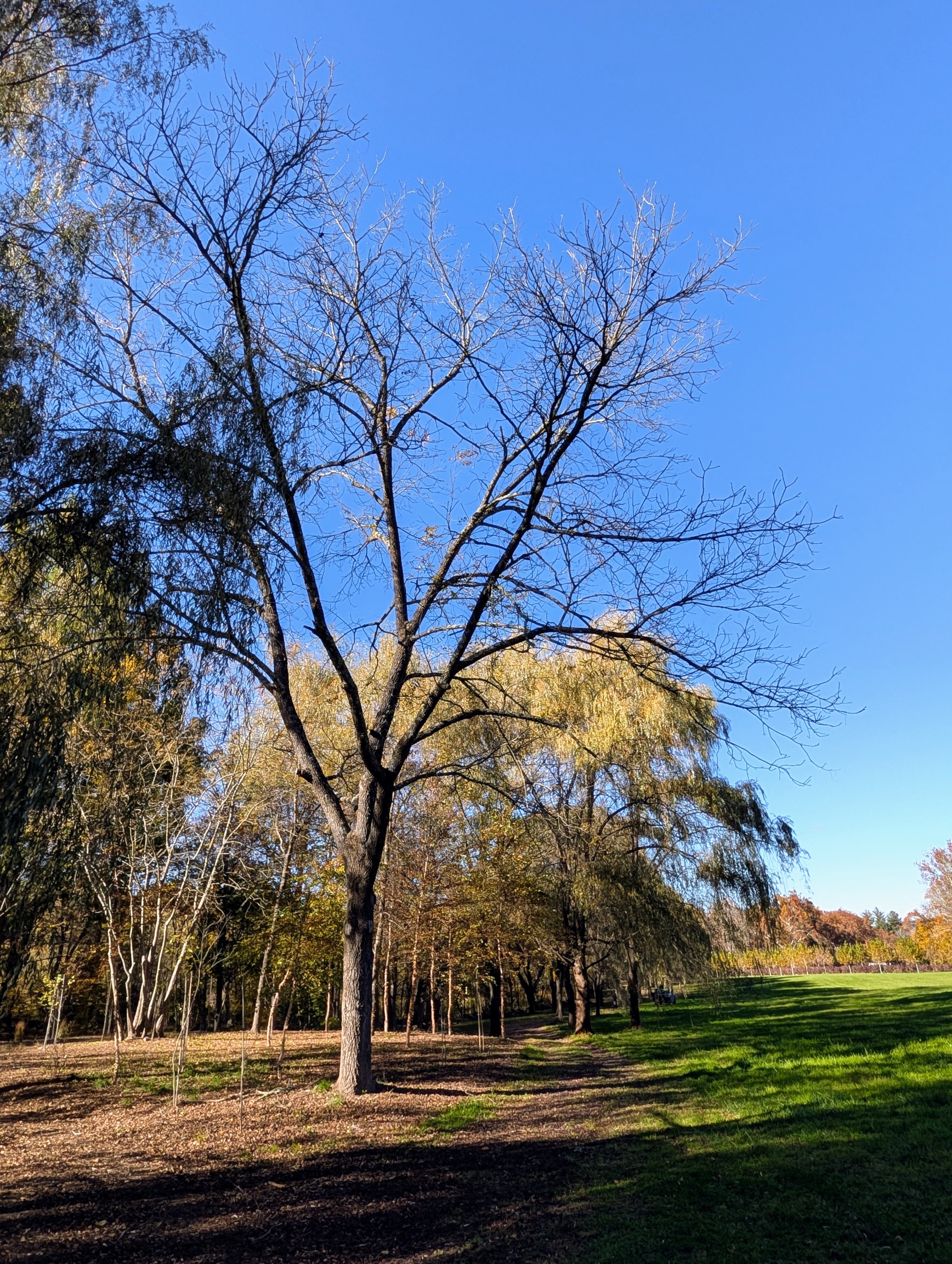 - Here is one of my black walnut trees, located near my pond and grove of weeping willows. In its natural setting, the black walnut tree can reach an average height of about 50 to 75 feet or taller. It favors areas between rivers, creeks, and denser woods and does best under full sun. The black walnut is known as an allelopathic tree – its roots, which may extend 50 feet or more from the trunk, exude a natural herbicide known as juglone which inhibits the growth of nearby plants. If you plant one, give it a lot of room.