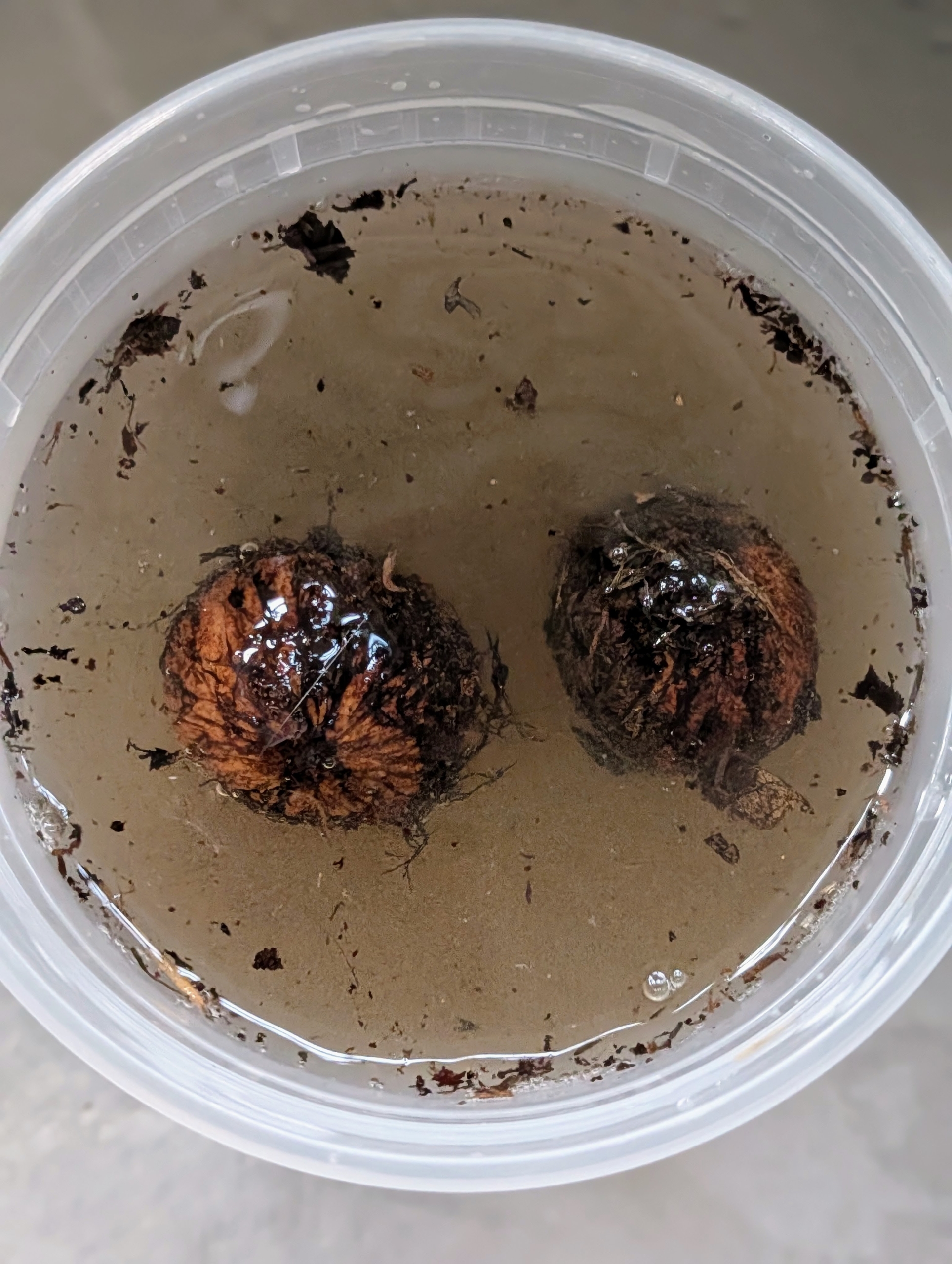- Here are two nuts that floated right to the top. The good black walnuts will sink.