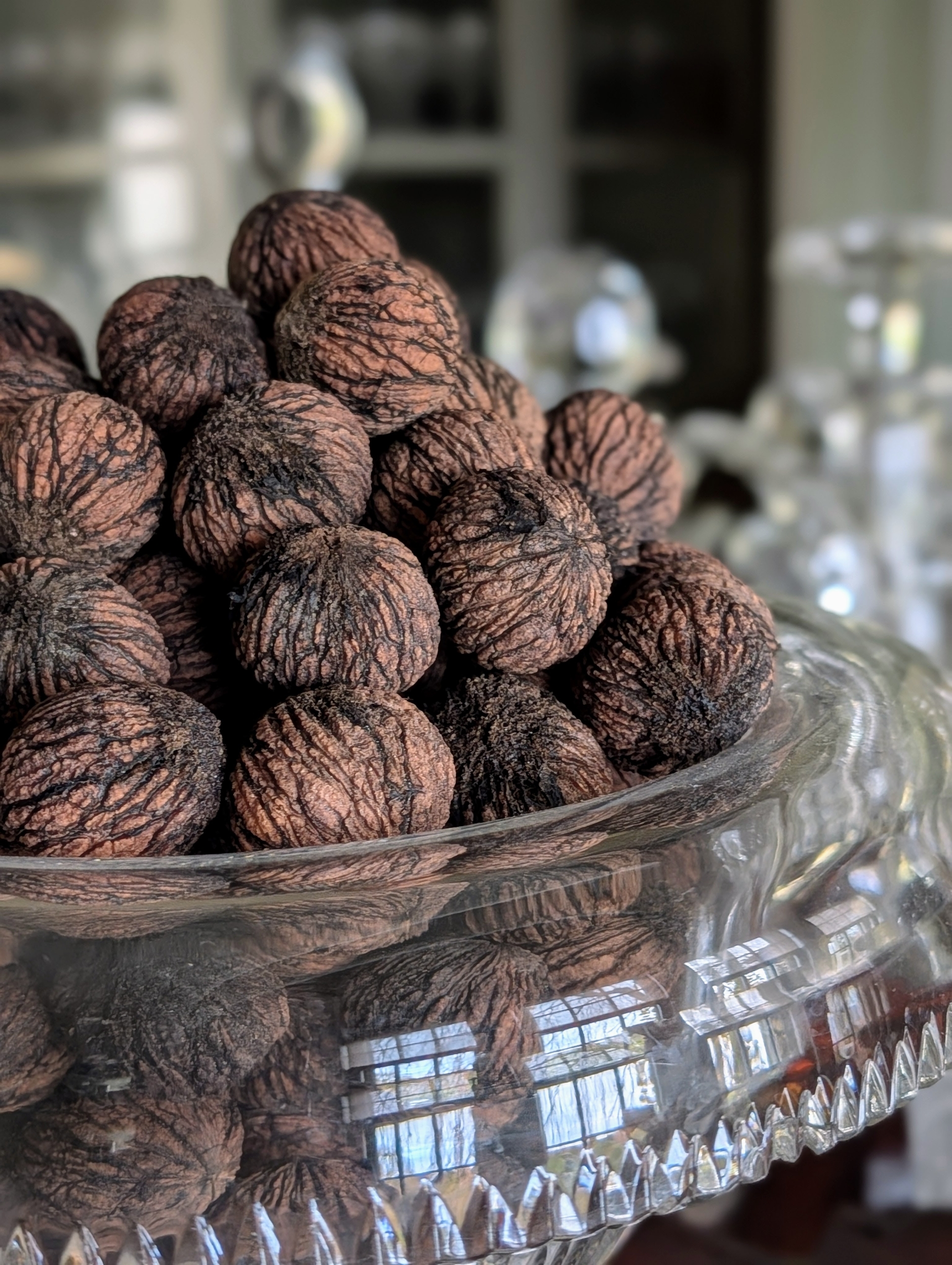 - Black walnuts can be displayed on a fall counter, used for baking or cooking, stored in the fridge for up to a year, or for two or more years in the freezer. I love that all of these black walnuts were grown right here at my farm. And the pretty mums behind them too!