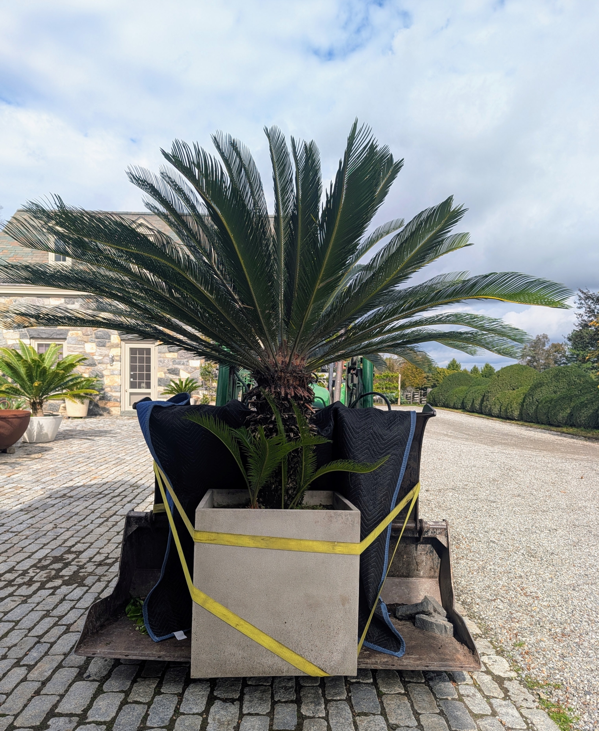 - A smaller sago palm is transported by hand truck. Pete moves this very carefully, so the plant is not hurt along the way.