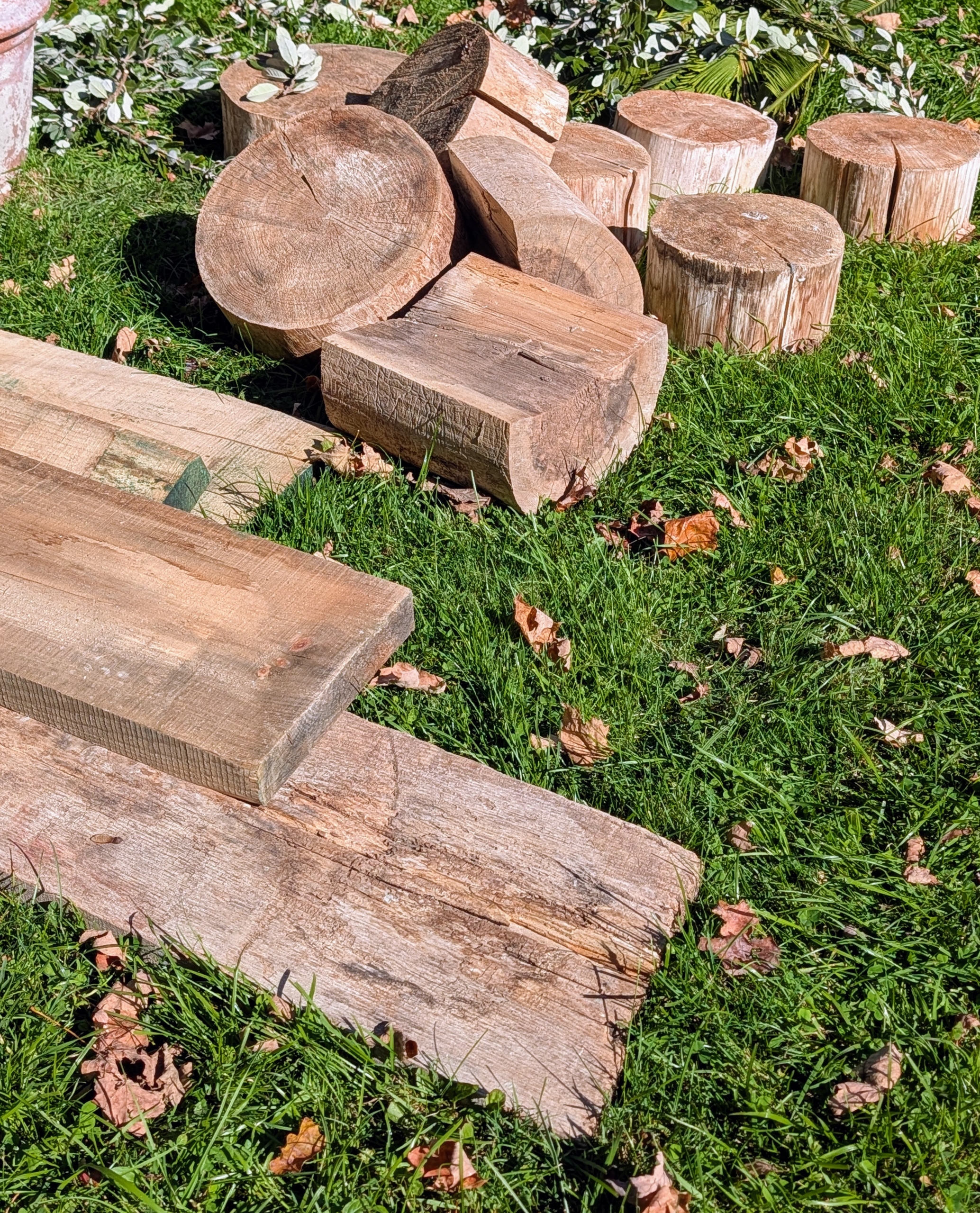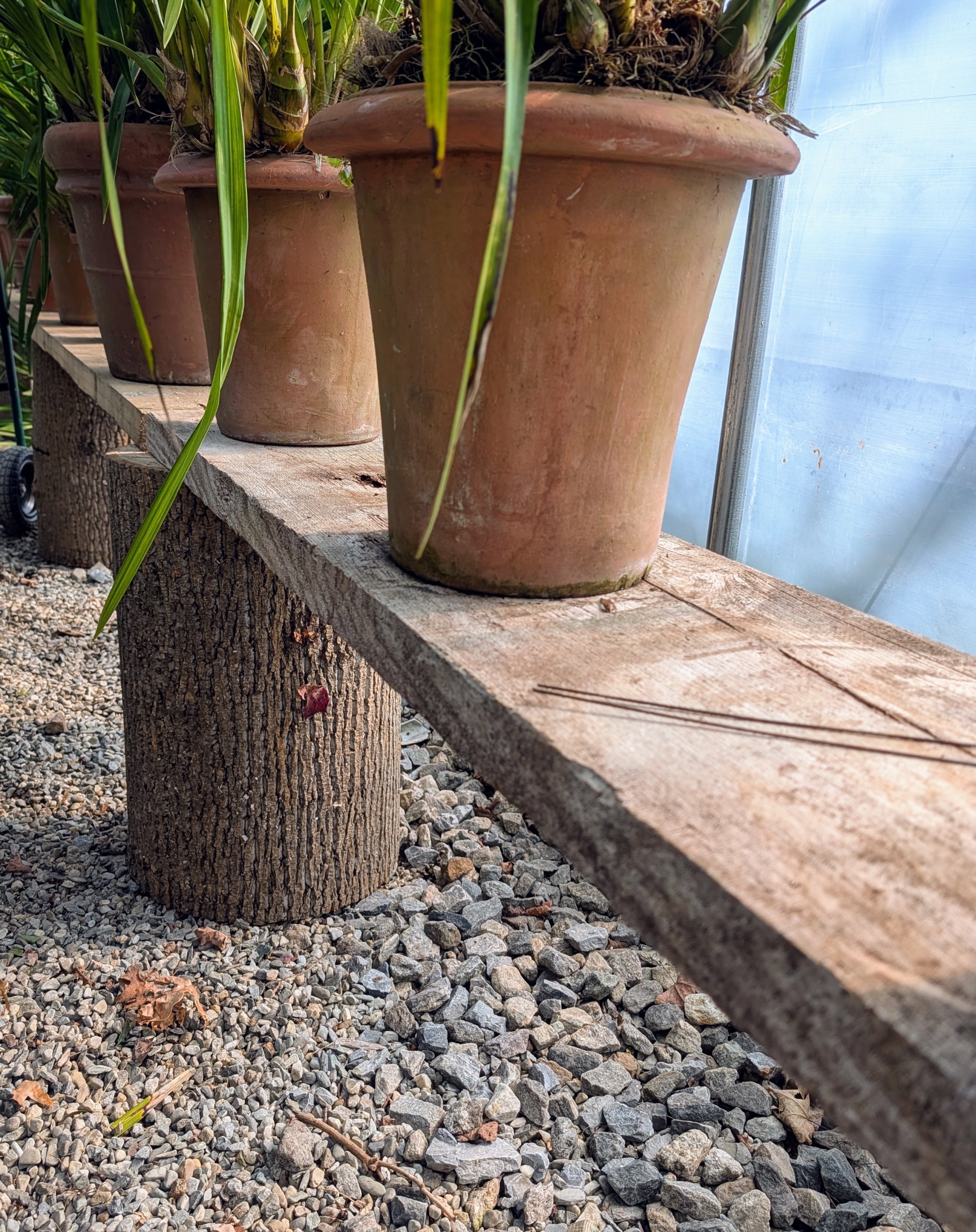 - I repurpose boards and stumps from downed trees to use as shelves and risers for some of the potted plants. It’s important to make use of both horizontal and vertical space when storing. A lot of the wood comes from the old, diseased ash trees that were taken down.