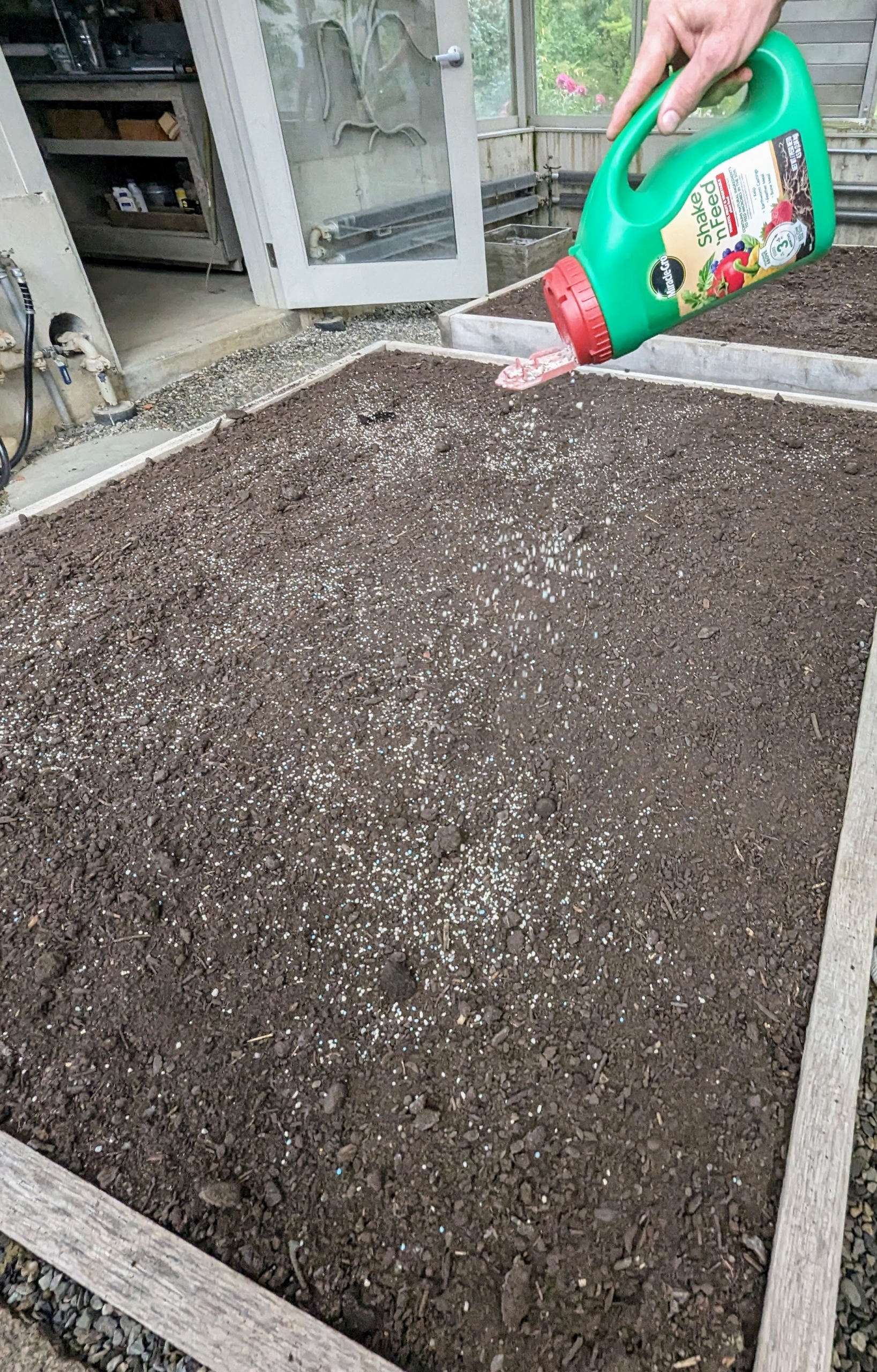 - I spend a good amount of time preparing the soil before planting any seeds. I have 17 wooden garden boxes that fit the entire length and width of the structure. Earlier this year, the beds were tilled, amended with good compost, raked and fed. I use a fertilizer specially formulated for growing vegetables – Miracle-Gro® Shake ‘n Feed® Tomato, Fruit & Vegetable Plant Food.