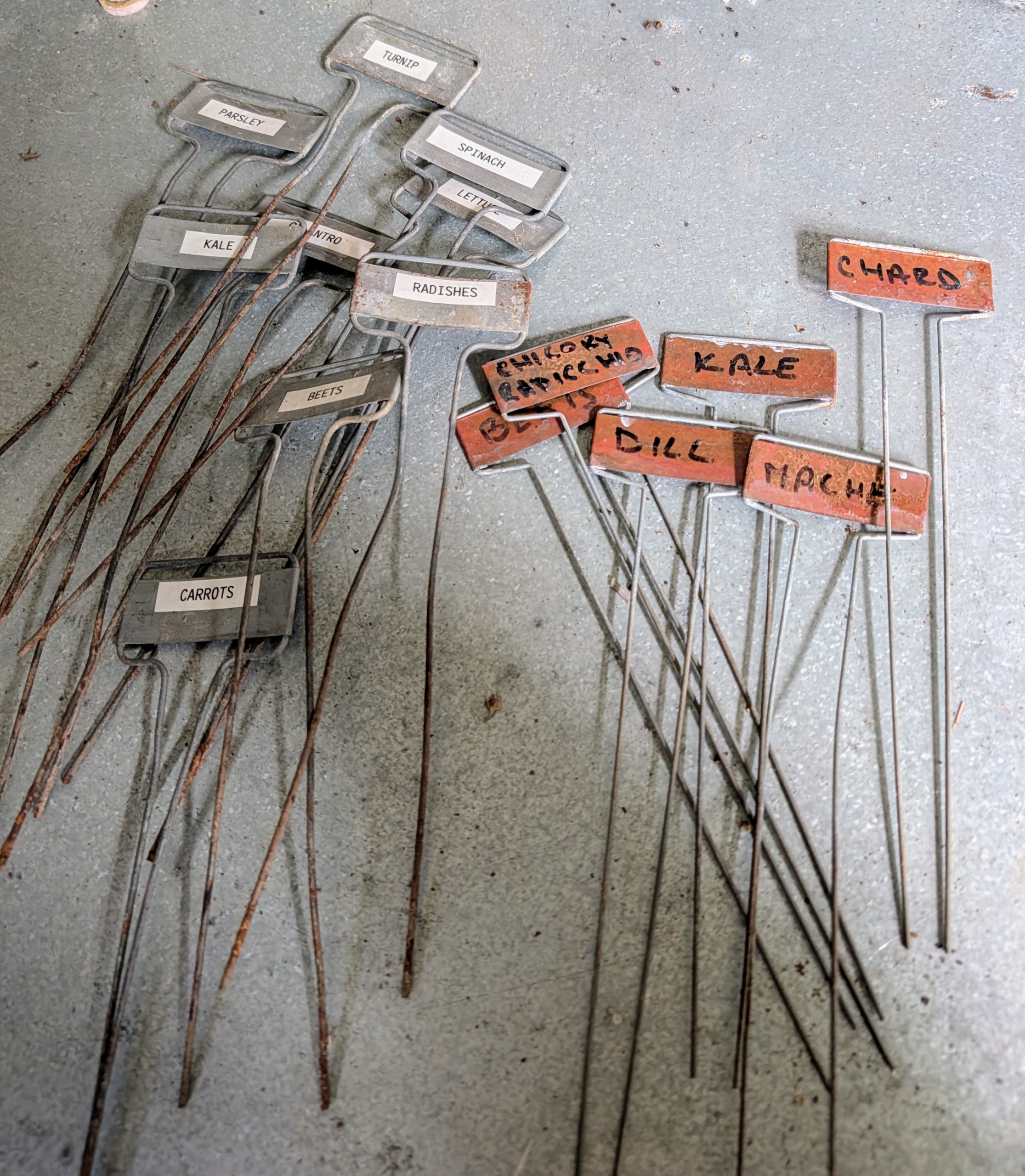 - I reuse markers season to season inside this greenhouse. These are already labeled and ready to insert into the beds.
