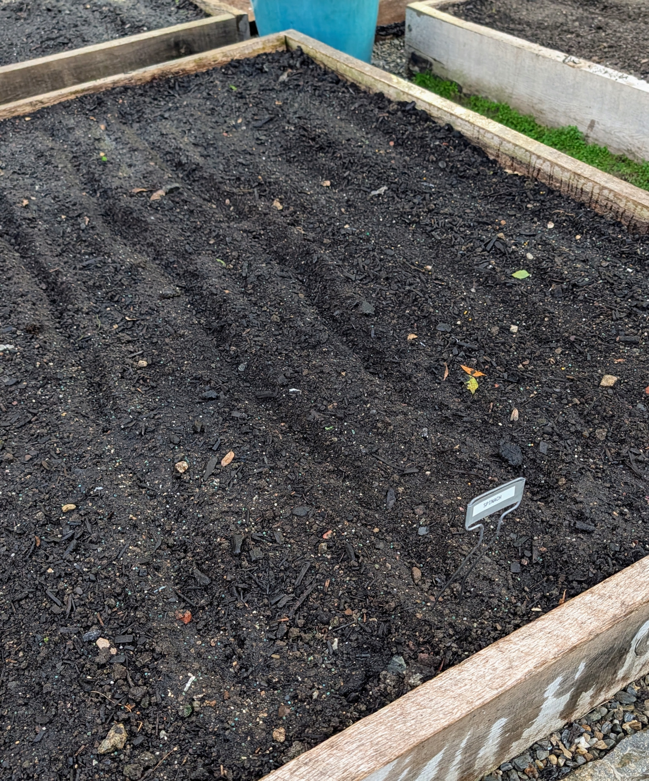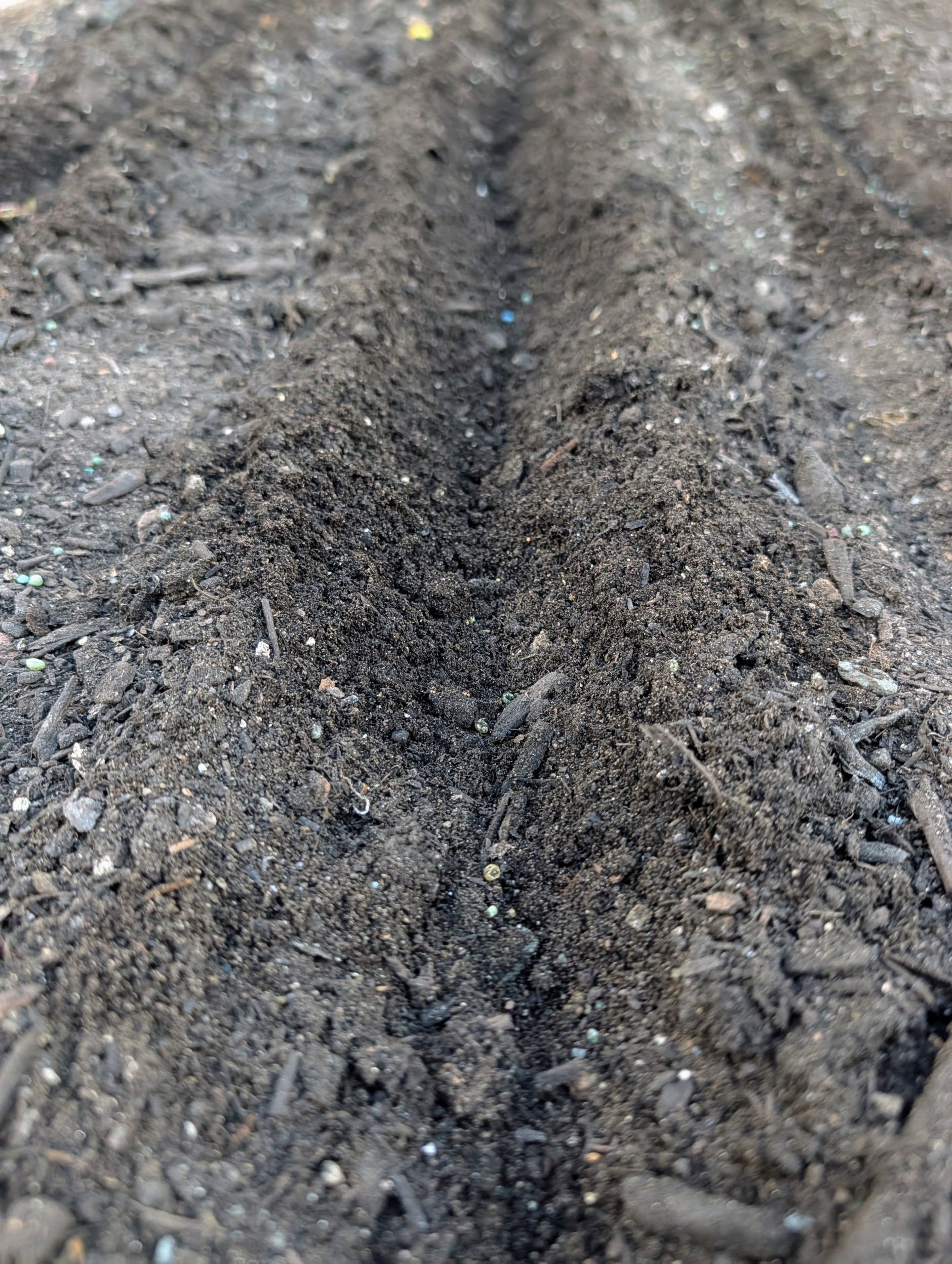 - Once all the seeds are dropped into their various beds, Ryan uses the back of a small soft rake to backfill all the planted furrows.