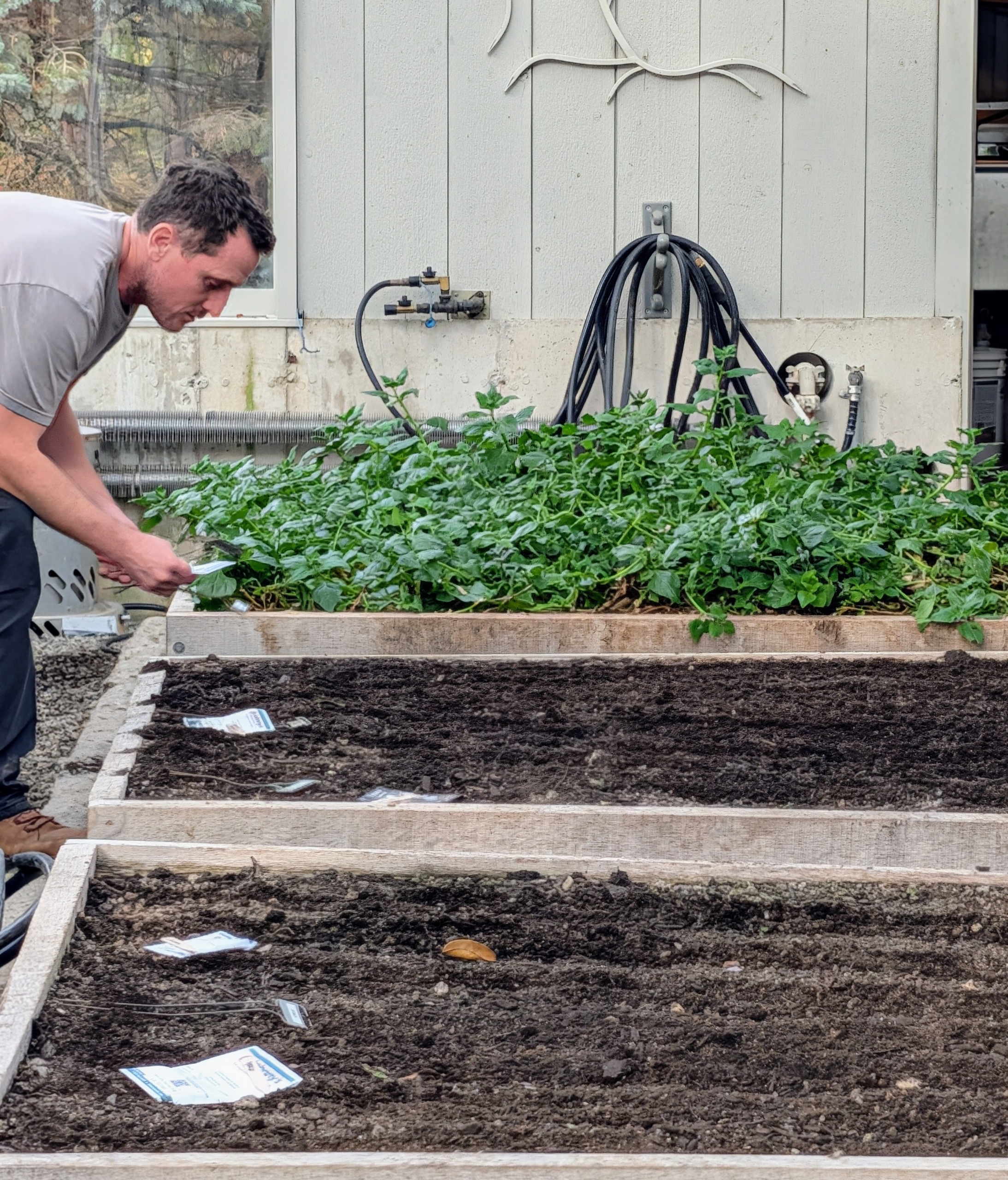 - Ryan drops seeds carefully in the bed. These raised beds were designed for easy reach from all sides, so that work can be done quickly and efficiently.