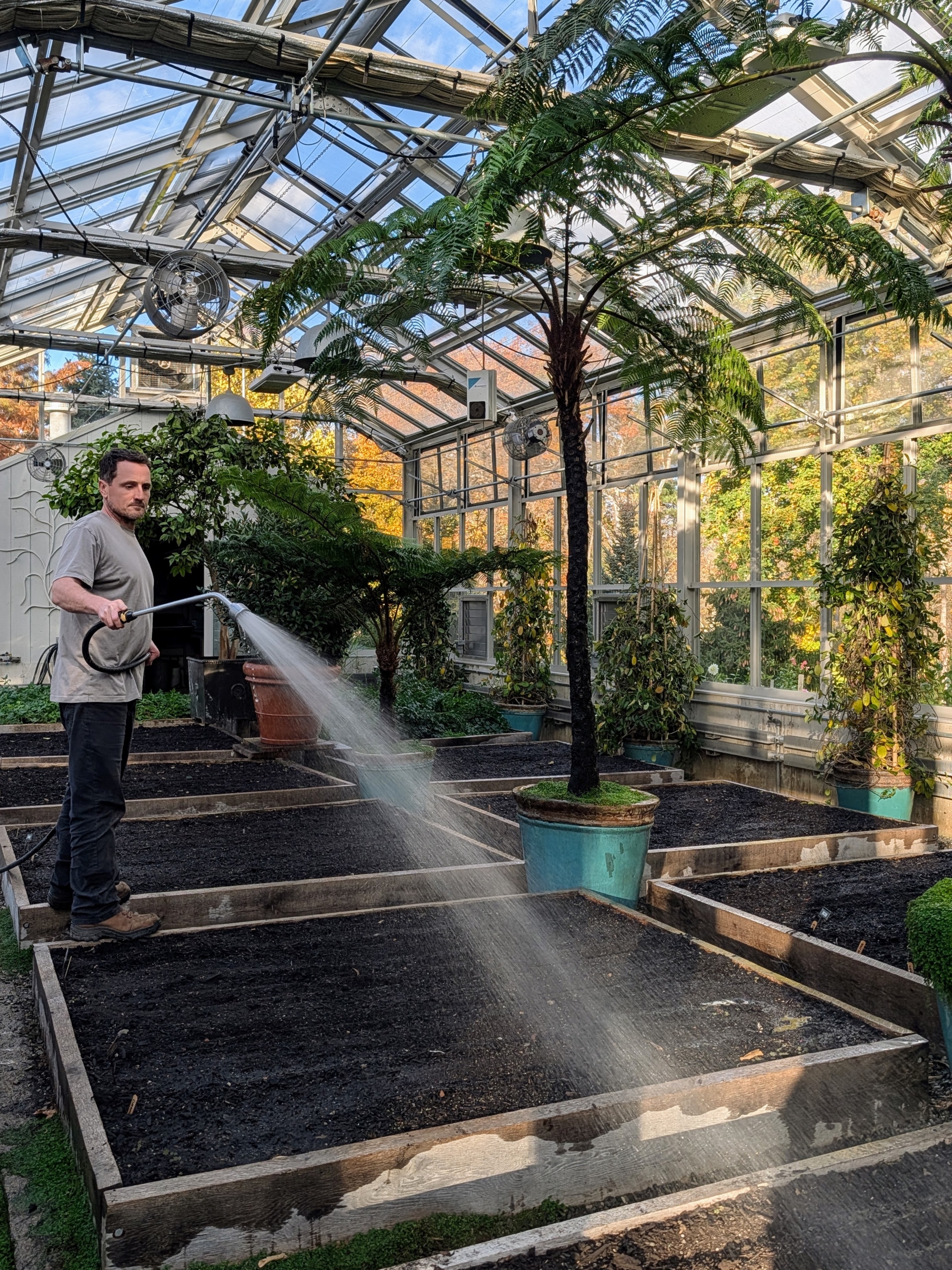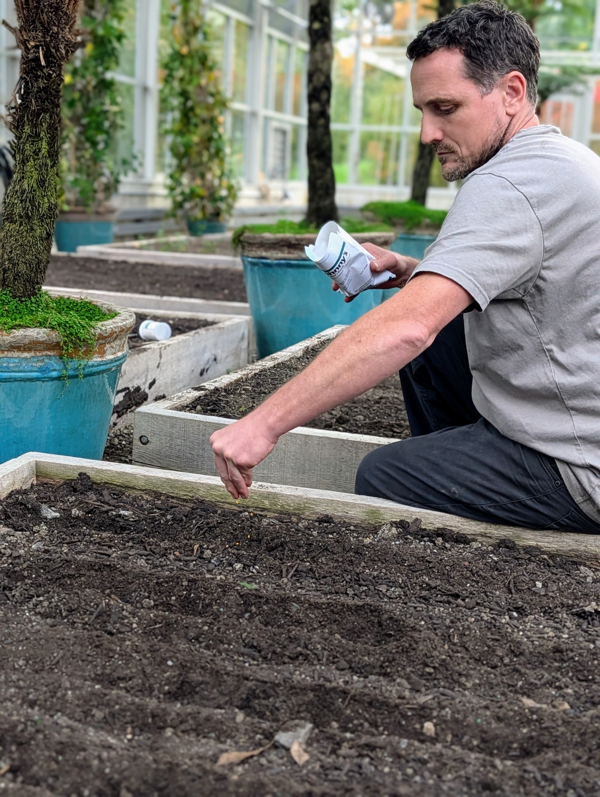 As my outdoor grounds crew continues with fall chores, attention is directed toward planting my vegetable greenhouse. I love this greenhouse - its construction several years ago was inspired by Eliot Coleman, an expert in four-season farming. It uses minimal artificial heat - in fact, most of its energy comes directly from the sun, and it successfully grows a variety of cold-hardy crops. And yesterday, my head gardener Ryan McCallister, planted the first seeds of our next growing period.