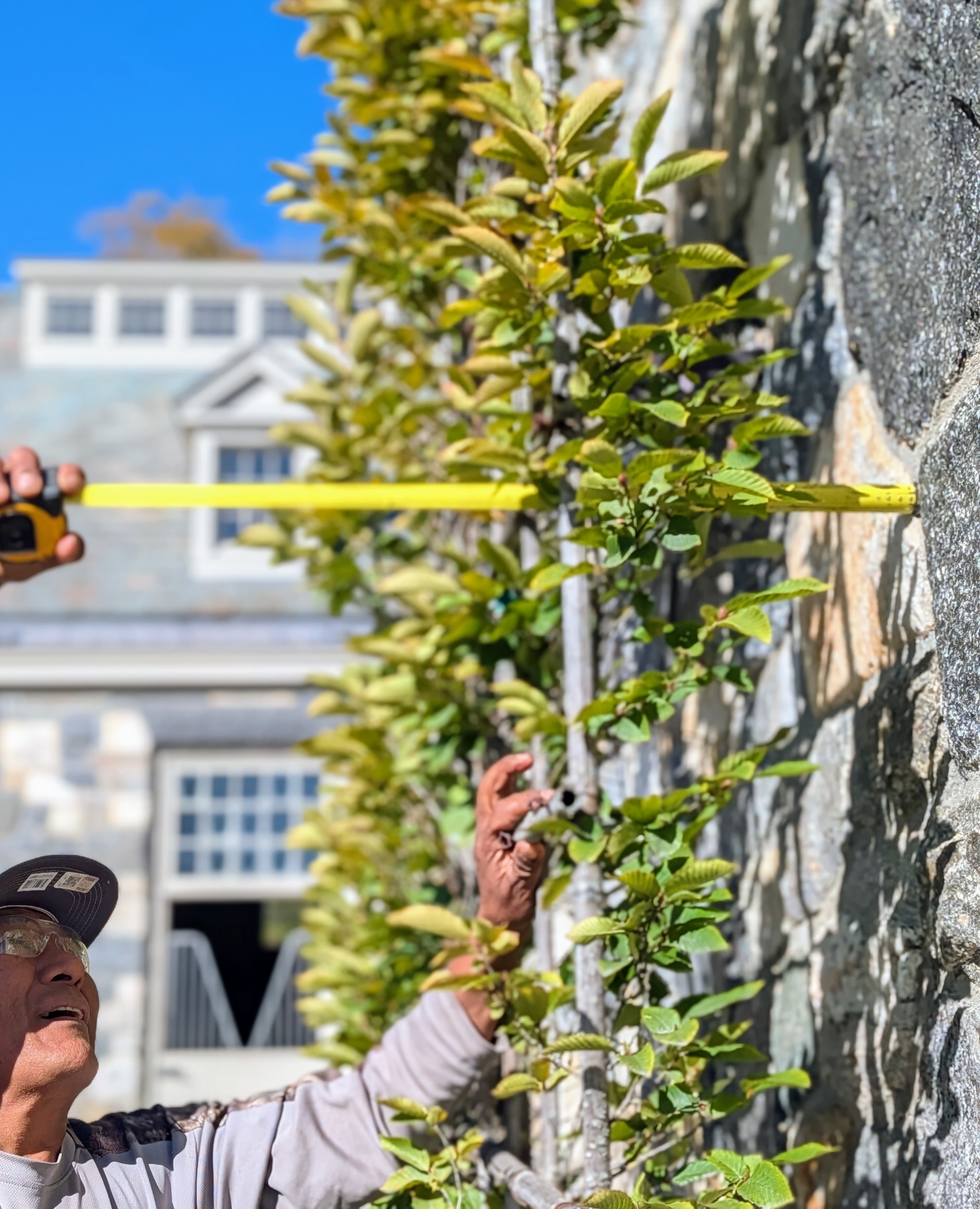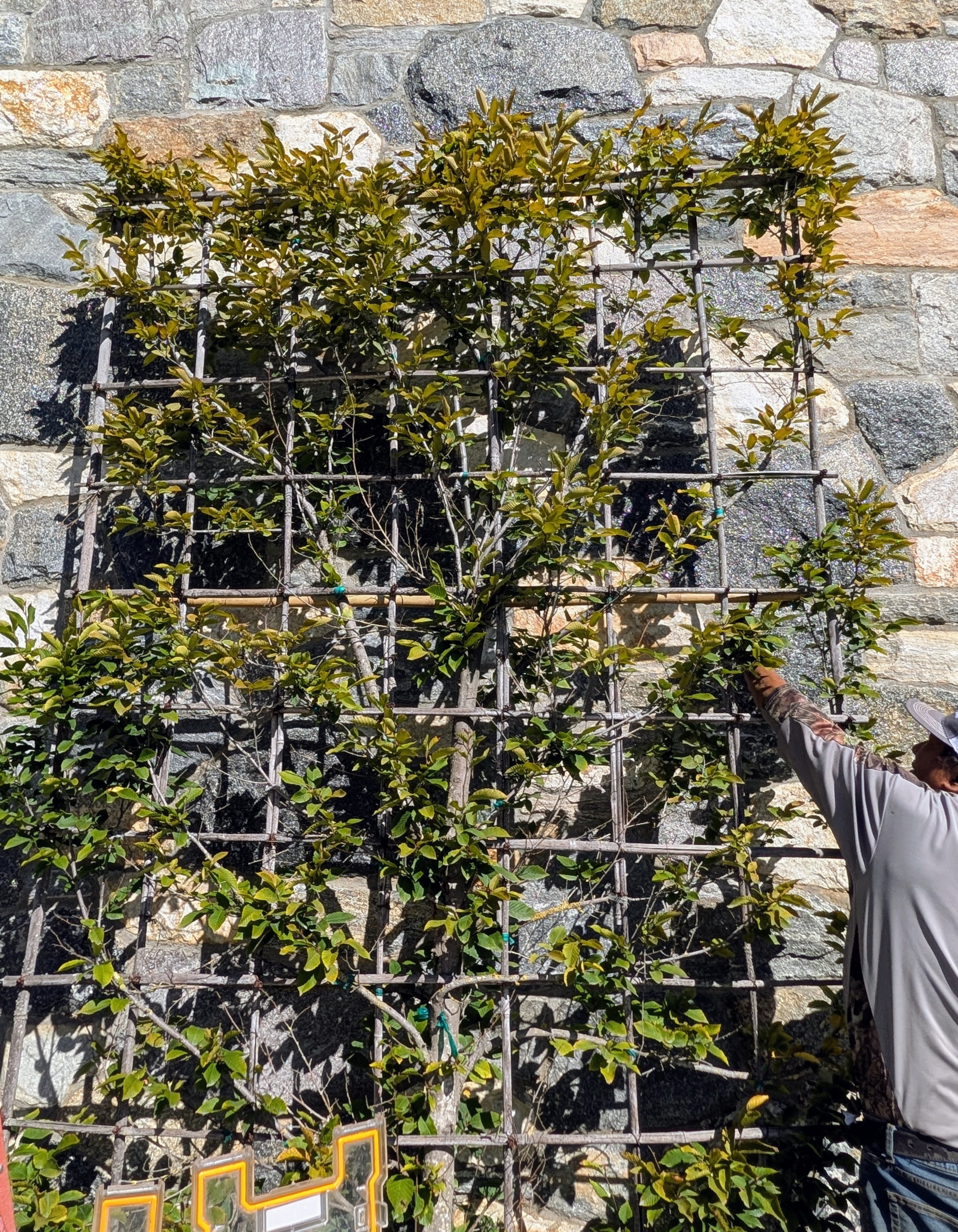 Carpinus betulus 'Fastigiata,' the columnar European hornbeam, is a medium-sized, deciduous tree. ‘Fastigiata’ means a narrow form with upright branches. This type of tree can be grown as an espalier, meaning its branches can be trained to grow flat against a wall, supported on a lattice or a framework of stakes. I have three espaliered European hornbeams planted against the stone walls of my Carriage House and Stable Office here at the farm. Last week, Pete Sherpa from my outdoor grounds crew, came up with an easy solution to reinforce them in case of any strong winds.
