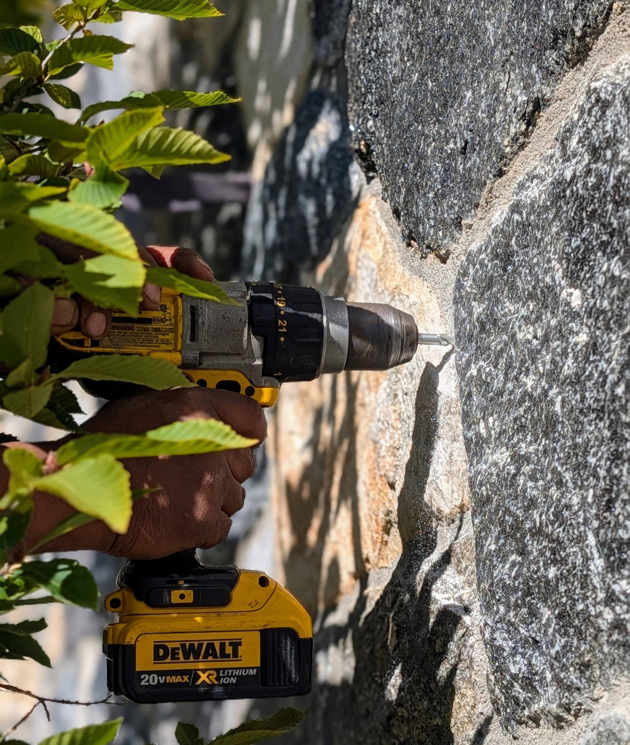 - Pete applies some pressure to ensure the drill goes in straight – the mortar can be a little tough.